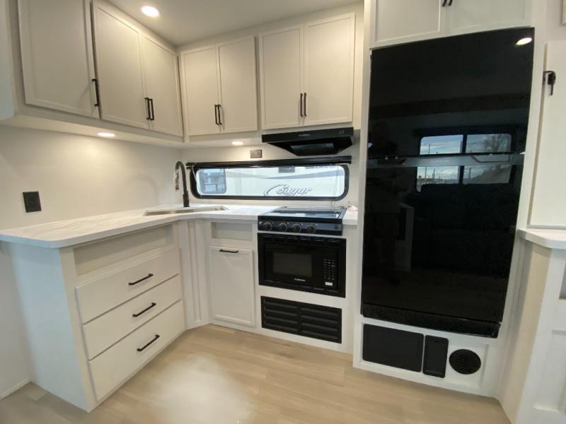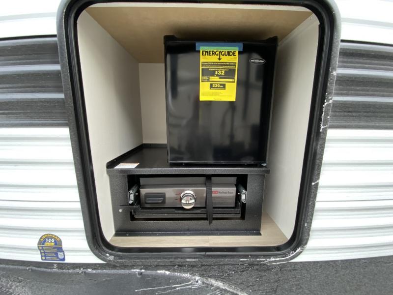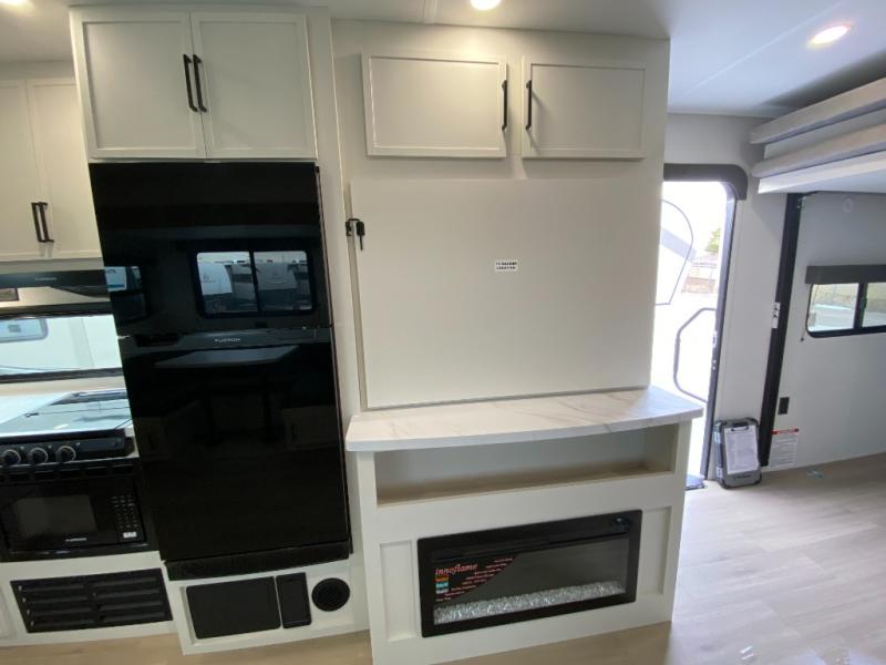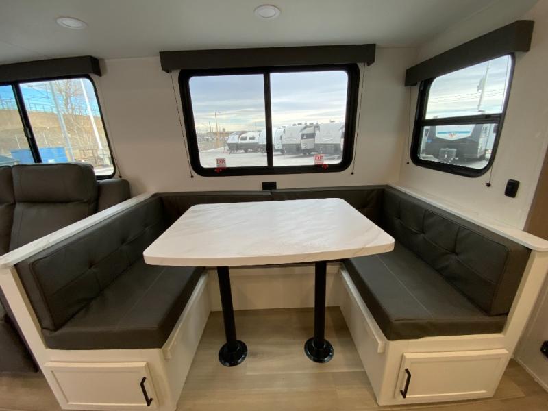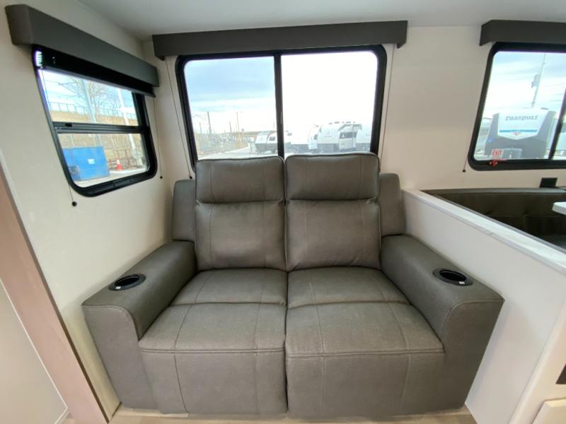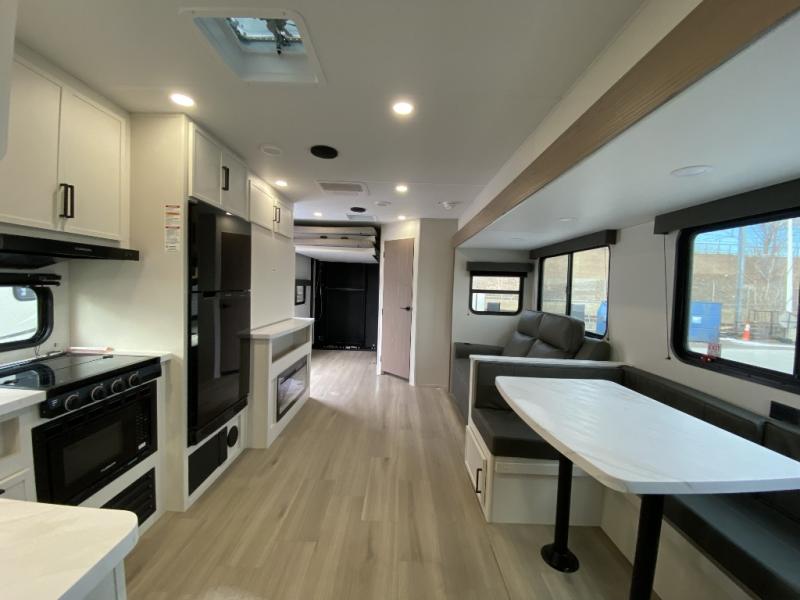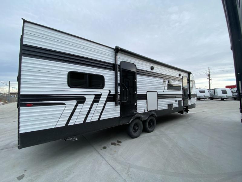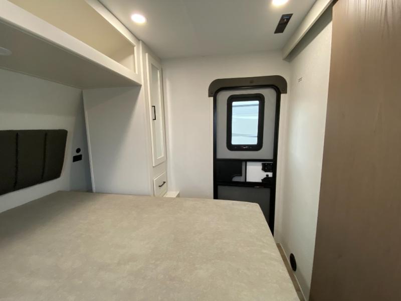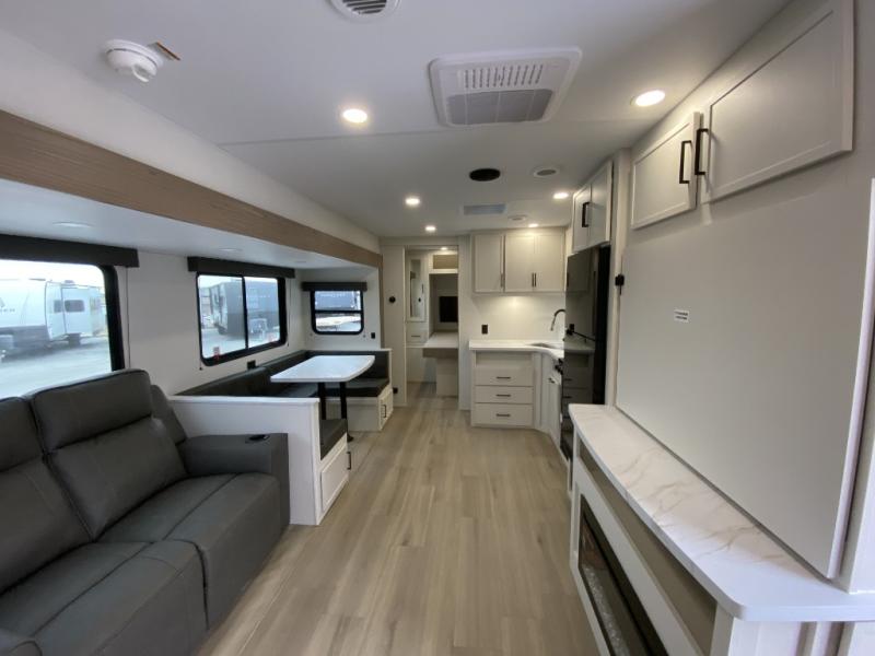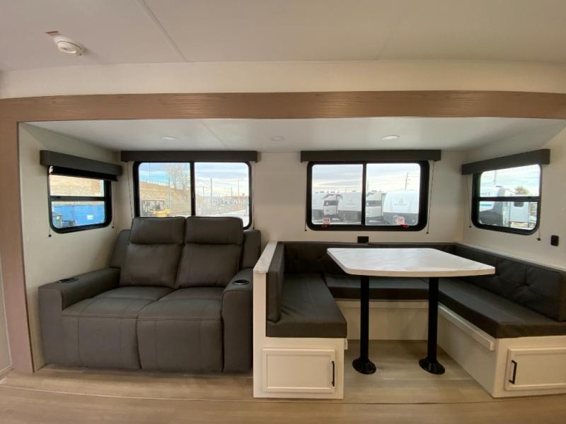 The spacious garage area is perfect for hauling your favorite toys, and the two entry/exit doors make it easy to get in and out. The front bedroom is a peaceful retreat, featuring a queen bed, wardrobes, and plenty of storage for your gear. Further in the heart of this unit, the U-shaped dinette is perfect for enjoying meals or game nights, and the pull-out trash makes cleanup a breeze. The kitchen is equipped with a microwave and 8 cu refrigerator, so you can fuel up for your next adventure. The theater seating is perfect for movie nights or catching up on your favorite shows, and the electric Happijac bunks provide a comfortable spot to rest. The full bathroom is a refreshing oasis, equipped with everything you need to start your day feeling revitalized.