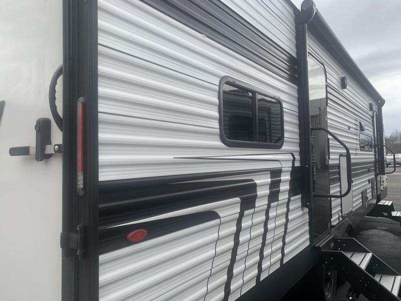 The spacious garage area is perfect for hauling your favorite toys, and the two entry/exit doors make it easy to get in and out. The front bedroom is a peaceful retreat, featuring a queen bed, wardrobes, and plenty of storage for your gear. Further in the heart of this unit, the U-shaped dinette is perfect for enjoying meals or game nights, and the pull-out trash makes cleanup a breeze. The kitchen is equipped with a microwave and 8 cu refrigerator, so you can fuel up for your next adventure. The theater seating is perfect for movie nights or catching up on your favorite shows, and the electric Happijac bunks provide a comfortable spot to rest. The full bathroom is a refreshing oasis, equipped with everything you need to start your day feeling revitalized.