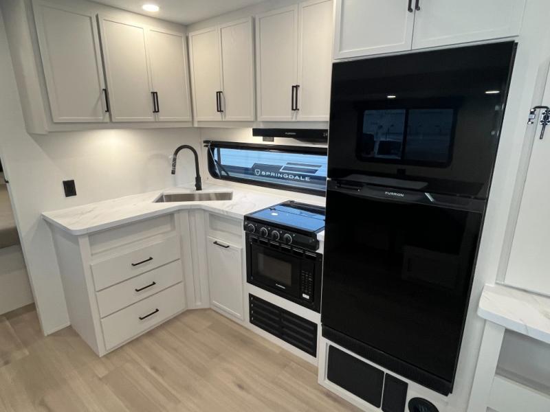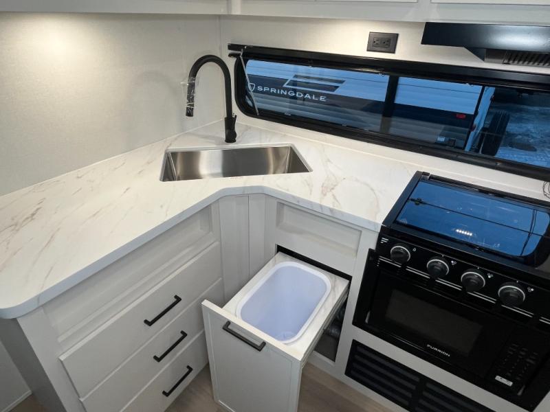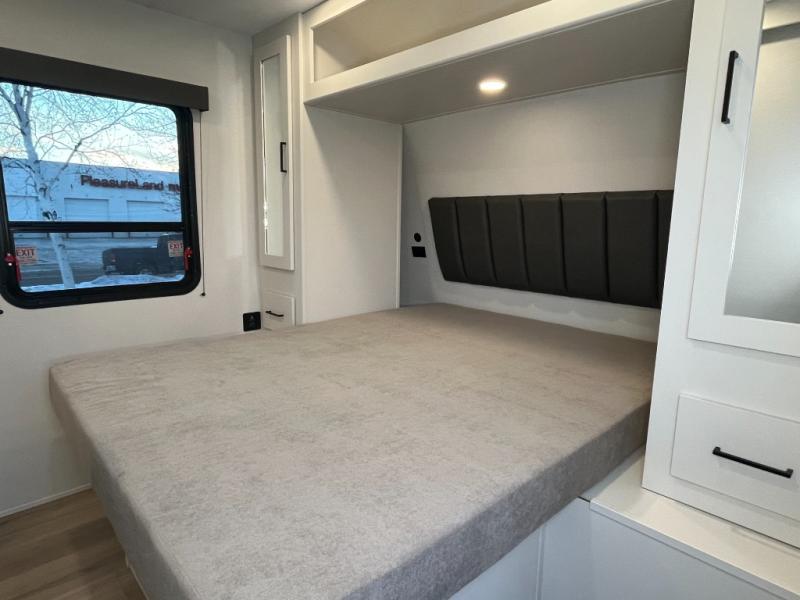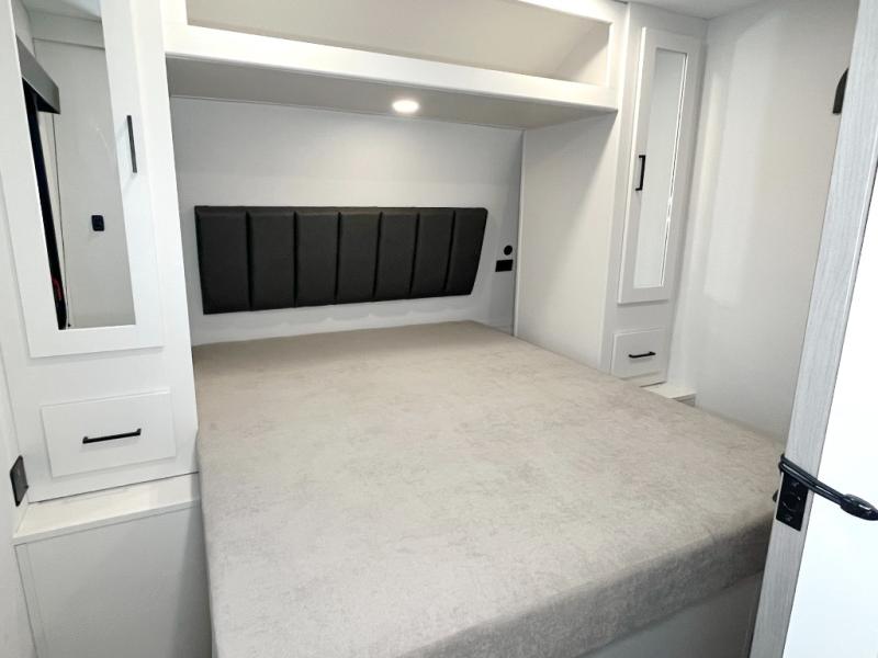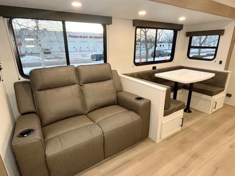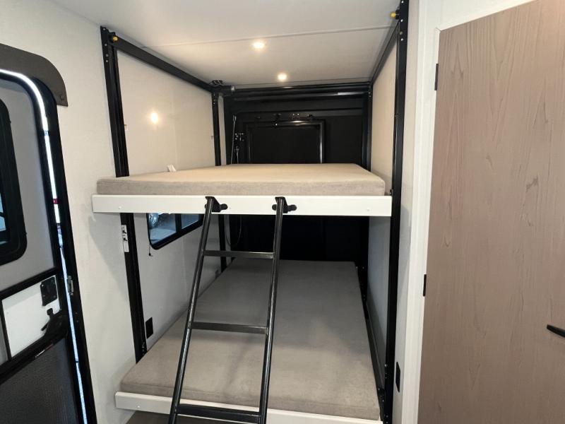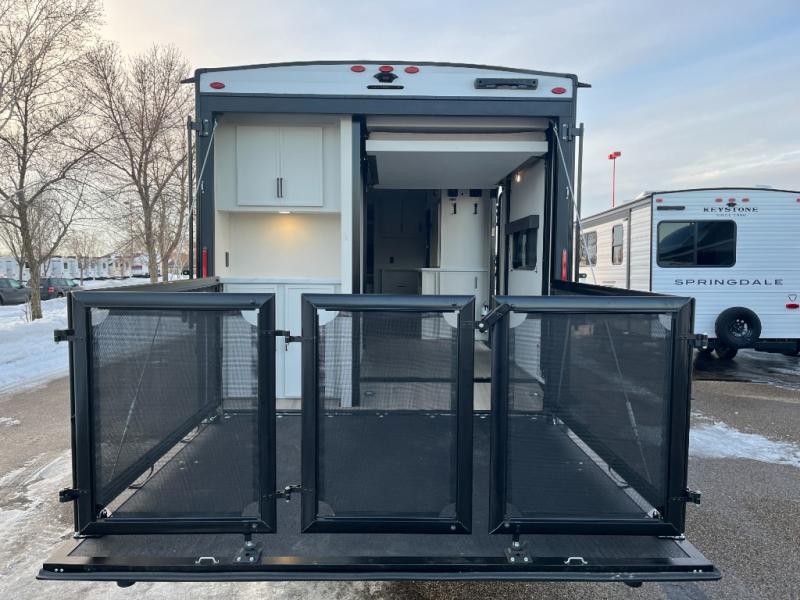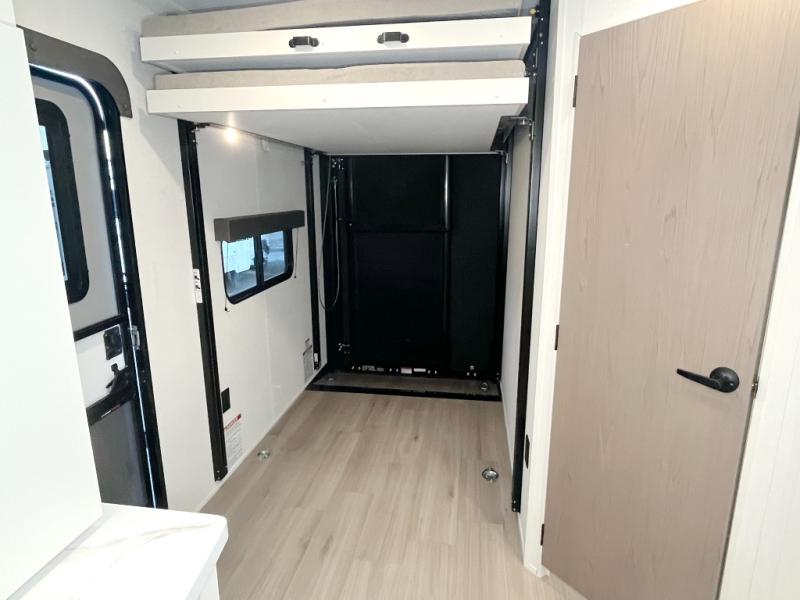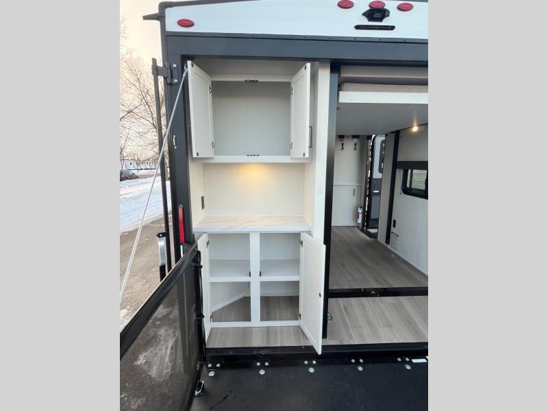 The spacious garage area is perfect for hauling your favorite toys, and the two entry/exit doors make it easy to get in and out. The front bedroom is a peaceful retreat, featuring a queen bed, wardrobes, and plenty of storage for your gear. Further in the heart of this unit, the U-shaped dinette is perfect for enjoying meals or game nights, and the pull-out trash makes cleanup a breeze. The kitchen is equipped with a microwave and 8 cu refrigerator, so you can fuel up for your next adventure. The theater seating is perfect for movie nights or catching up on your favorite shows, and the electric Happijac bunks provide a comfortable spot to rest. The full bathroom is a refreshing oasis, equipped with everything you need to start your day feeling revitalized.