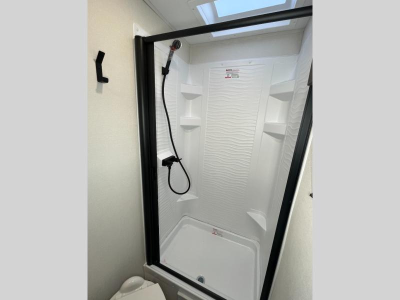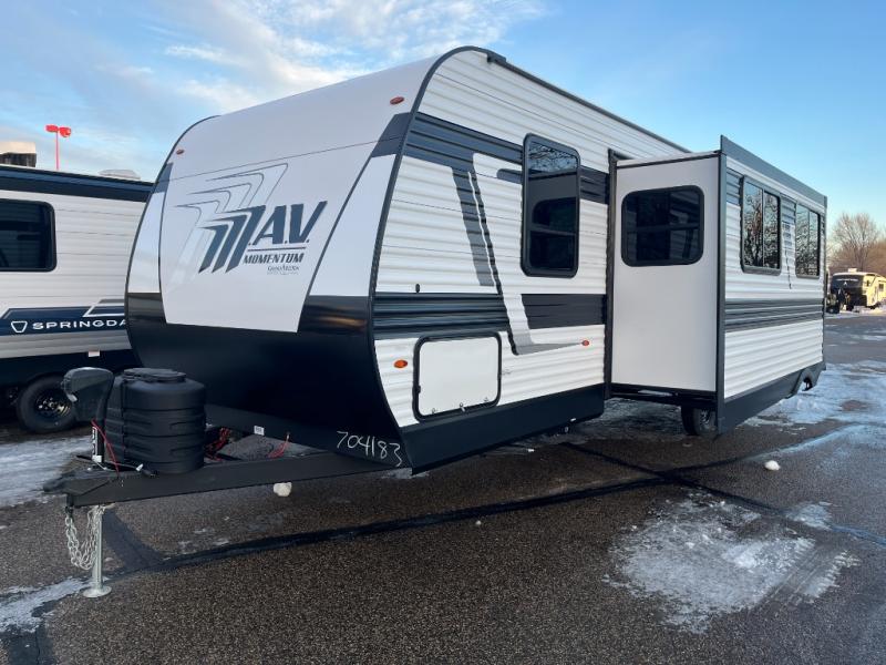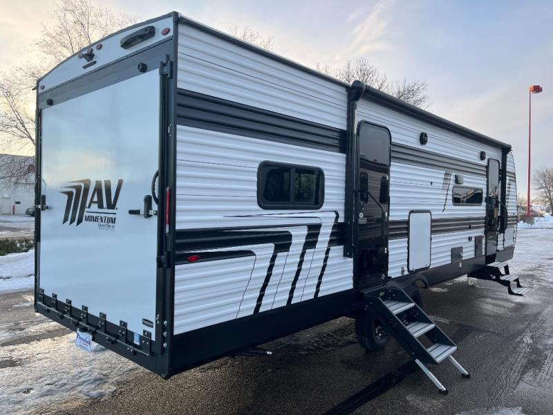 The Momentum MAV toy hauler travel trailers by Grand Design are designed to provide exactly what you need. The spacious garage provides tons of cargo space, with no wheel wells to get in the way. Additional storage includes magnetic storage door catches, and overhead consoles throughout. Conveniences like motion sensor lights and USB outlets will make your life easier, and you will be comfortable in all seasons with the 30K BTU furnace plus 15K BTU ducted air conditioning. The standard Solar Package comes with a 180W solar panel, a 40 Amp charge controller with Bluetooth, and a 12V refrigerator so you can go off-grid when the adventure calls for it.