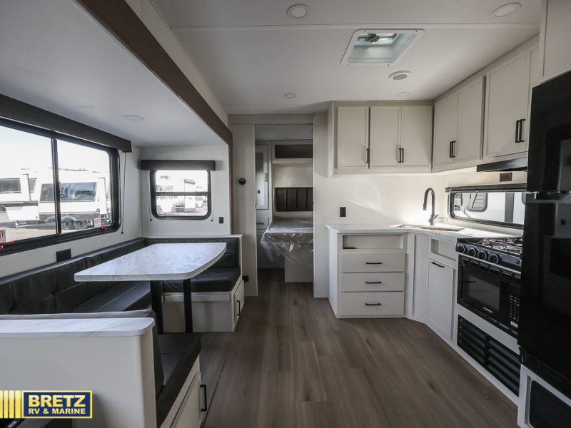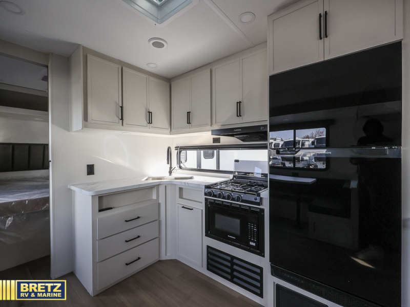 The spacious garage area is perfect for hauling your favorite toys, and the two entry/exit doors make it easy to get in and out. The front bedroom is a peaceful retreat, featuring a queen bed, wardrobes, and plenty of storage for your gear. Further in the heart of this unit, the U-shaped dinette is perfect for enjoying meals or game nights, and the pull-out trash makes cleanup a breeze. The kitchen is equipped with a microwave and 8 cu refrigerator, so you can fuel up for your next adventure. The theater seating is perfect for movie nights or catching up on your favorite shows, and the electric Happijac bunks provide a comfortable spot to rest. The full bathroom is a refreshing oasis, equipped with everything you need to start your day feeling revitalized.