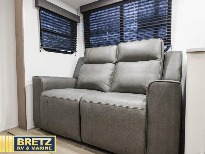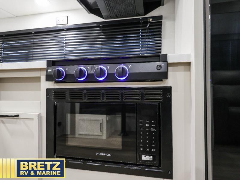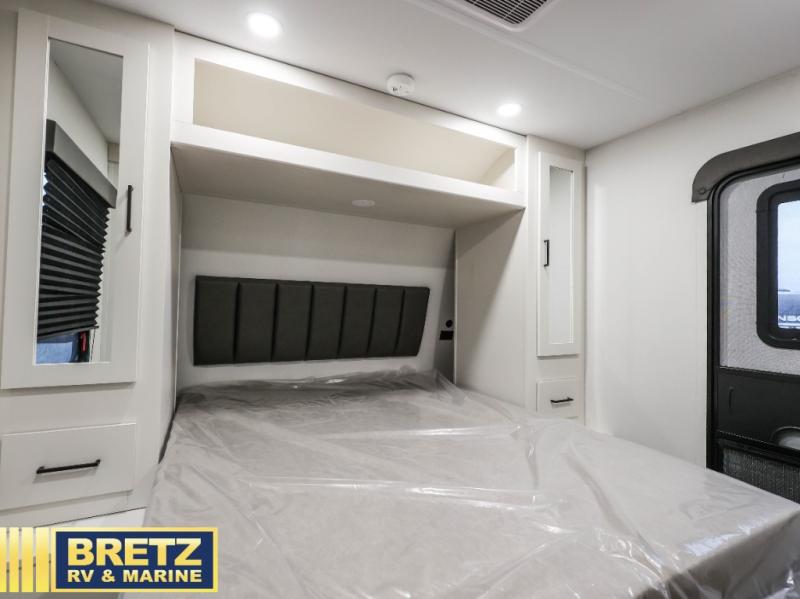 The spacious garage area is perfect for hauling your favorite toys, and the two entry/exit doors make it easy to get in and out. The front bedroom is a peaceful retreat, featuring a queen bed, wardrobes, and plenty of storage for your gear. Further in the heart of this unit, the U-shaped dinette is perfect for enjoying meals or game nights, and the pull-out trash makes cleanup a breeze. The kitchen is equipped with a microwave and 8 cu refrigerator, so you can fuel up for your next adventure. The theater seating is perfect for movie nights or catching up on your favorite shows, and the electric Happijac bunks provide a comfortable spot to rest. The full bathroom is a refreshing oasis, equipped with everything you need to start your day feeling revitalized.