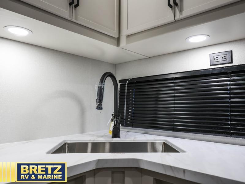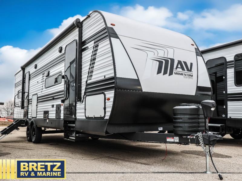The Momentum MAV toy hauler travel trailers by Grand Design are designed to provide exactly what you need. The spacious garage provides tons of cargo space, with no wheel wells to get in the way. Additional storage includes magnetic storage door catches, and overhead consoles throughout. Conveniences like motion sensor lights and USB outlets will make your life easier, and you will be comfortable in all seasons with the 30K BTU furnace plus 15K BTU ducted air conditioning. The standard Solar Package comes with a 180W solar panel, a 40 Amp charge controller with Bluetooth, and a 12V refrigerator so you can go off-grid when the adventure calls for it.