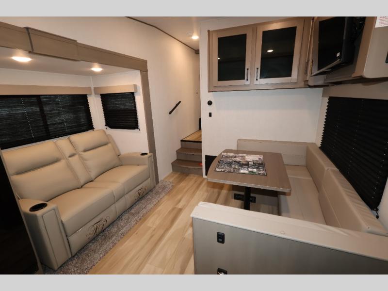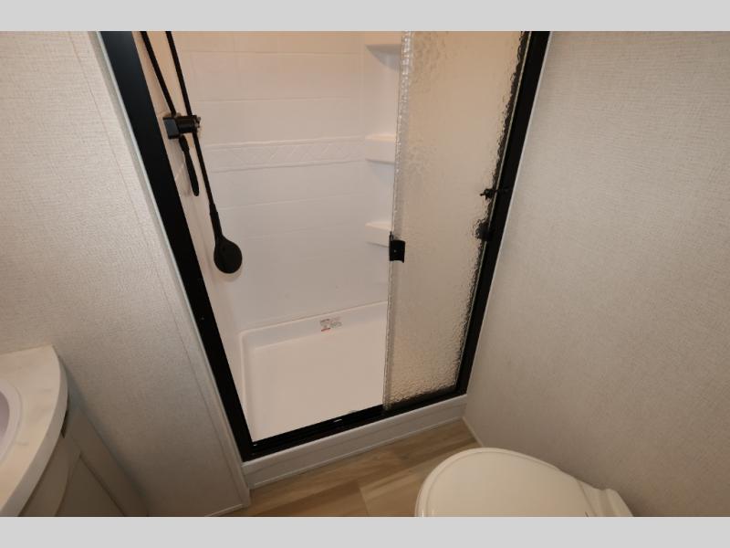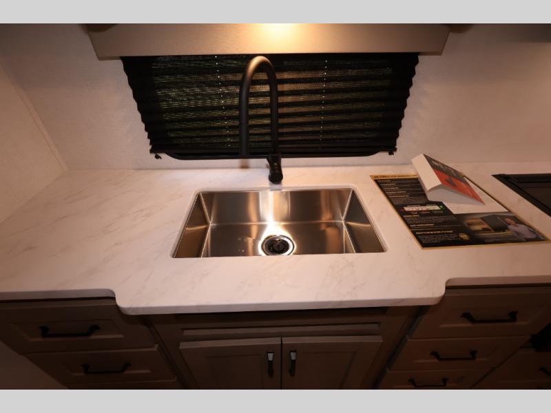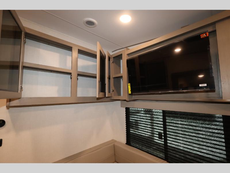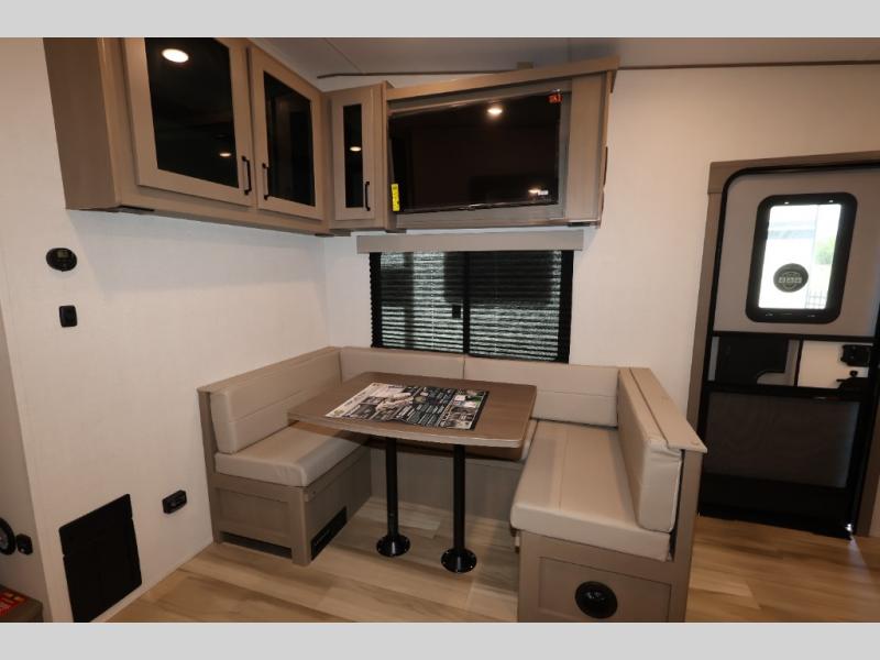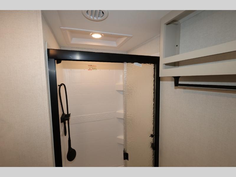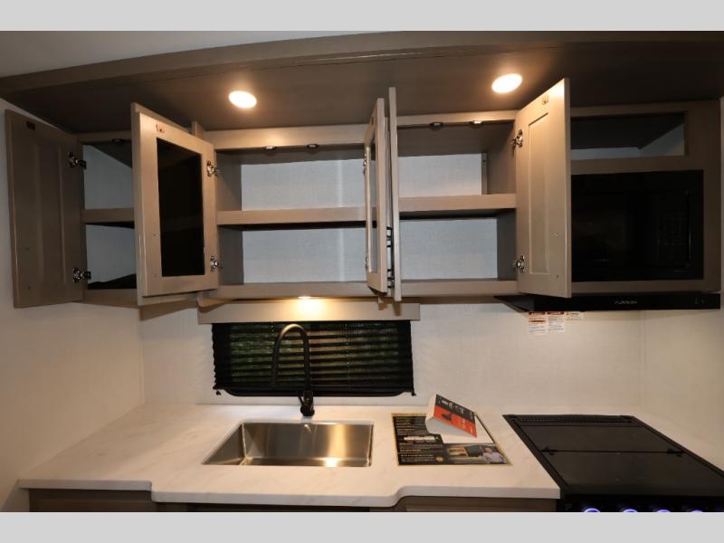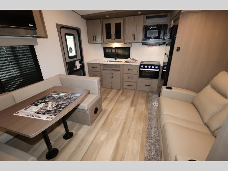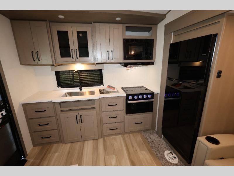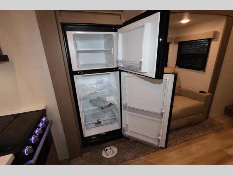 This rear kitchen fifth wheel is sure to meet all of your camping needs! Since the exterior length is only 26' 11", you can easily maneuver in and out of campgrounds. The rear kitchen includes ample counter space to prep meals, a three burner cooktop, and overhead storage for all your necessities. There is a 10 cu. ft. 12V refrigerator within the slide out that also includes the theater seating, and the U-shaped dinette provides a place to dine or play a card game. You will appreciate having convenient storage by the entry door, along with pull-out pet bowls, a functional wardrobe closet in the bedroom and an exterior pass-thru for belongings and camping gear. When you're ready to turn in for the night, the queen bed is sure to bring a great night's rest, while your guests sleep on the booth dinette or optional tri-fold sofa if you replace the theater seating!