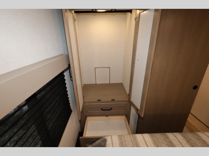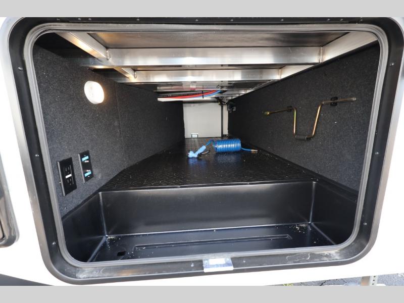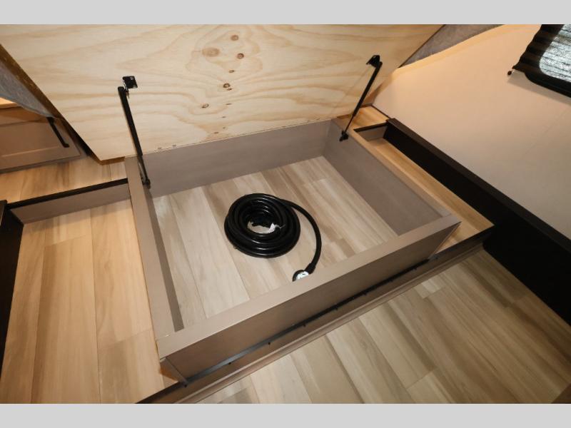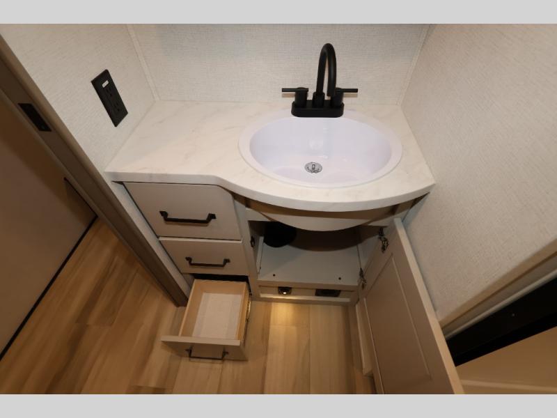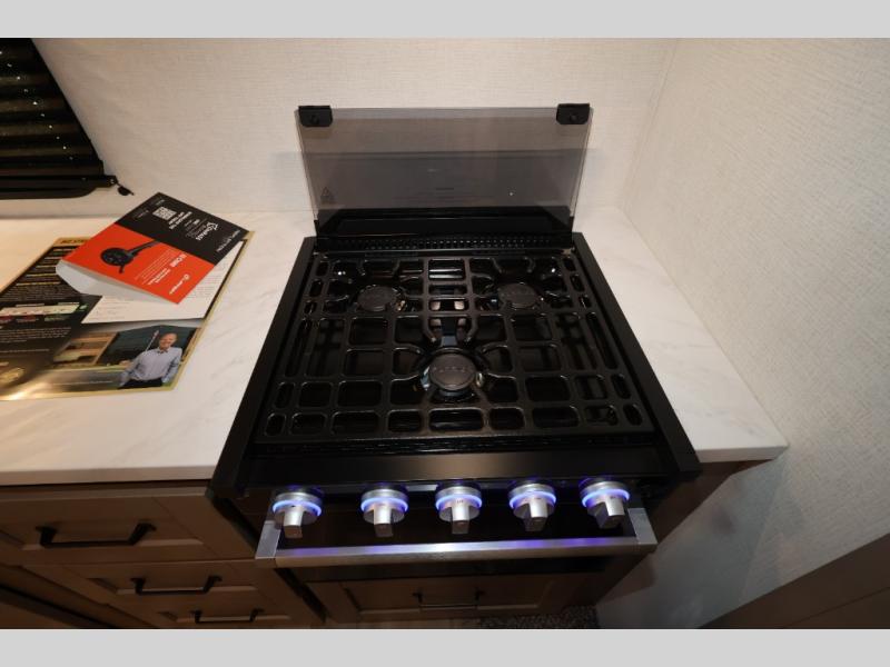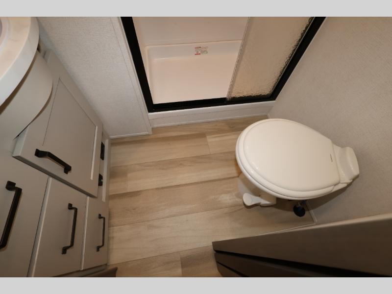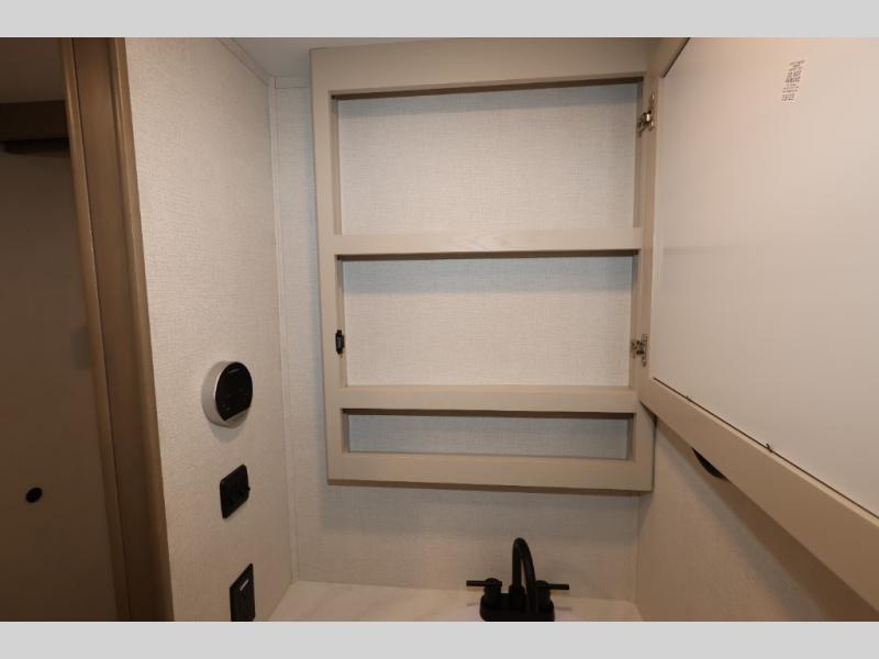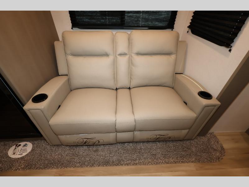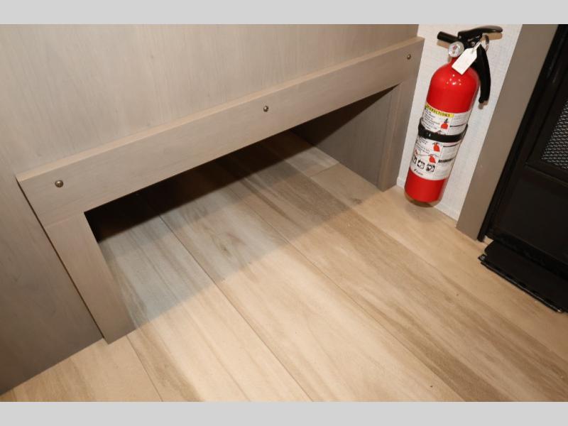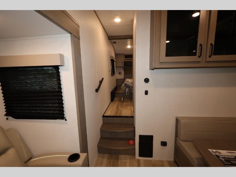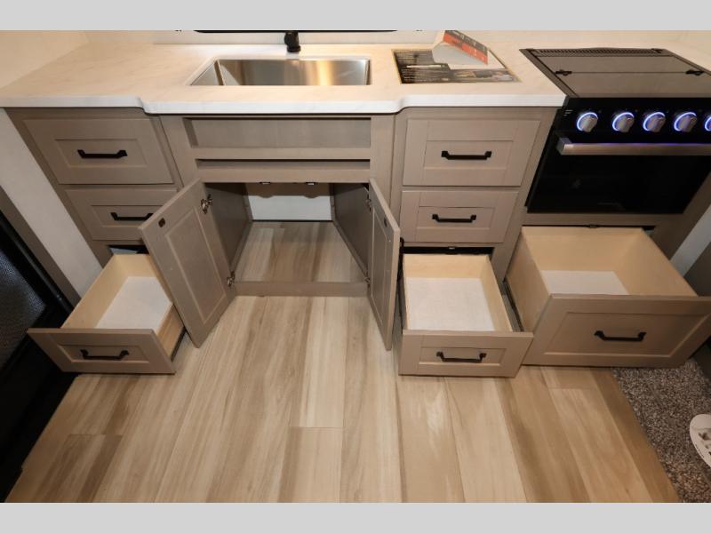 This rear kitchen fifth wheel is sure to meet all of your camping needs! Since the exterior length is only 26' 11", you can easily maneuver in and out of campgrounds. The rear kitchen includes ample counter space to prep meals, a three burner cooktop, and overhead storage for all your necessities. There is a 10 cu. ft. 12V refrigerator within the slide out that also includes the theater seating, and the U-shaped dinette provides a place to dine or play a card game. You will appreciate having convenient storage by the entry door, along with pull-out pet bowls, a functional wardrobe closet in the bedroom and an exterior pass-thru for belongings and camping gear. When you're ready to turn in for the night, the queen bed is sure to bring a great night's rest, while your guests sleep on the booth dinette or optional tri-fold sofa if you replace the theater seating!
