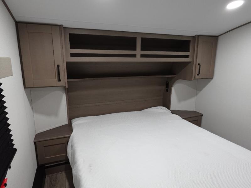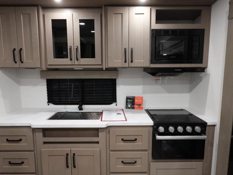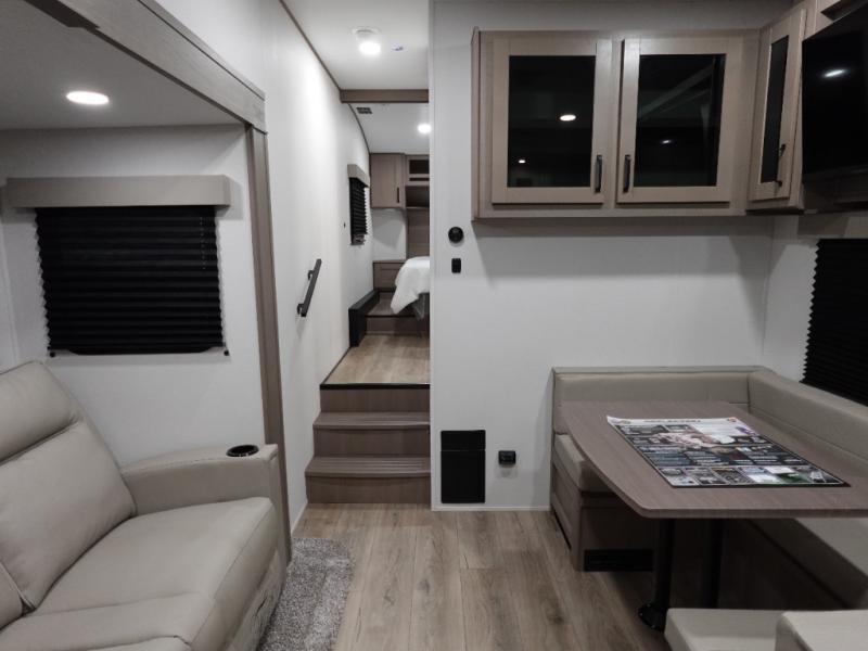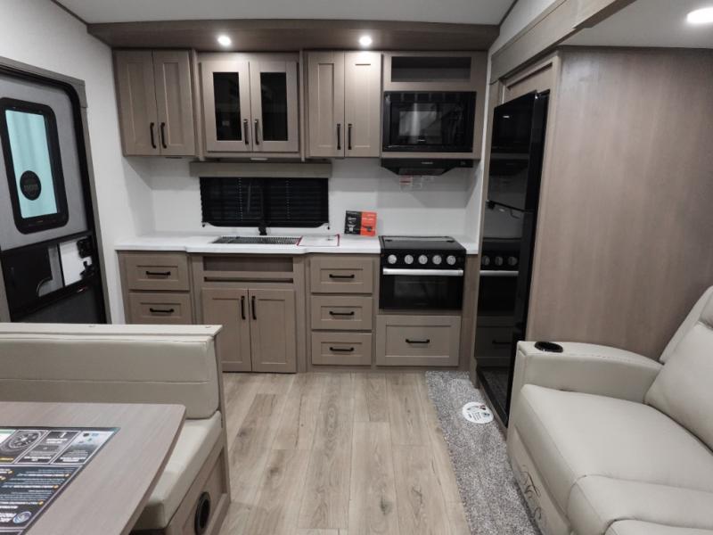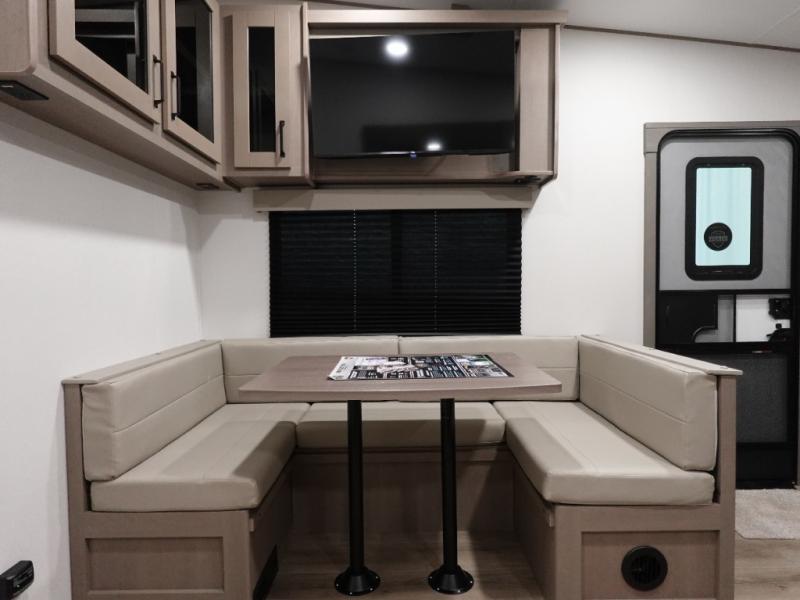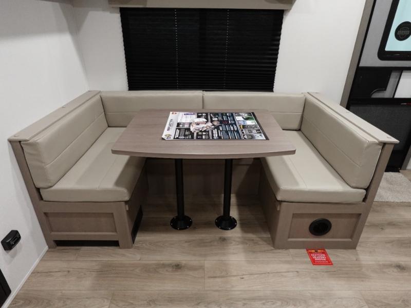 This rear kitchen fifth wheel is sure to meet all of your camping needs! Since the exterior length is only 26' 11", you can easily maneuver in and out of campgrounds. The rear kitchen includes ample counter space to prep meals, a three burner cooktop, and overhead storage for all your necessities. There is a 10 cu. ft. 12V refrigerator within the slide out that also includes the theater seating, and the U-shaped dinette provides a place to dine or play a card game. You will appreciate having convenient storage by the entry door, along with pull-out pet bowls, a functional wardrobe closet in the bedroom and an exterior pass-thru for belongings and camping gear.