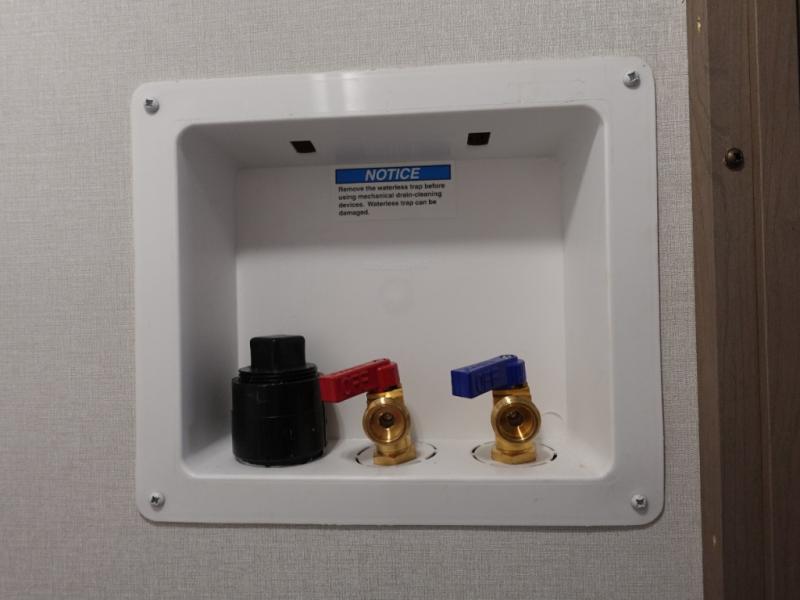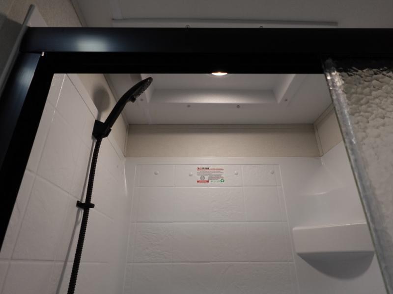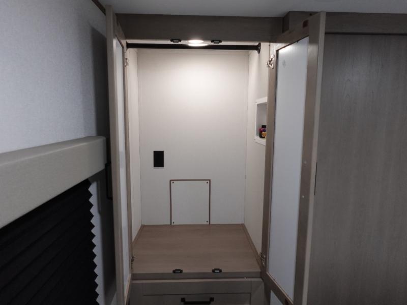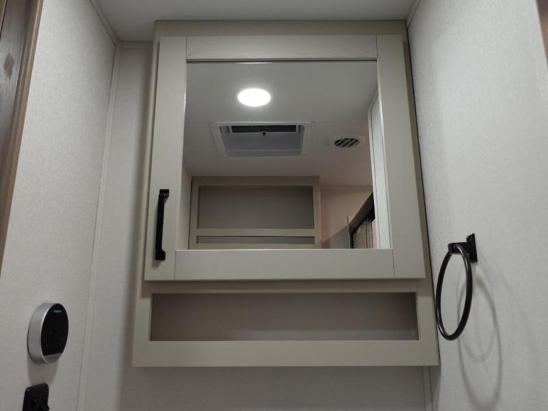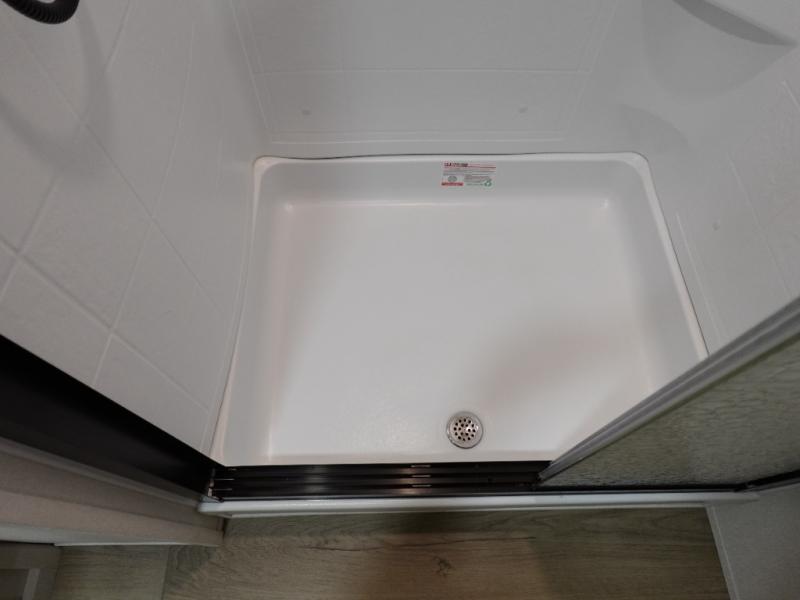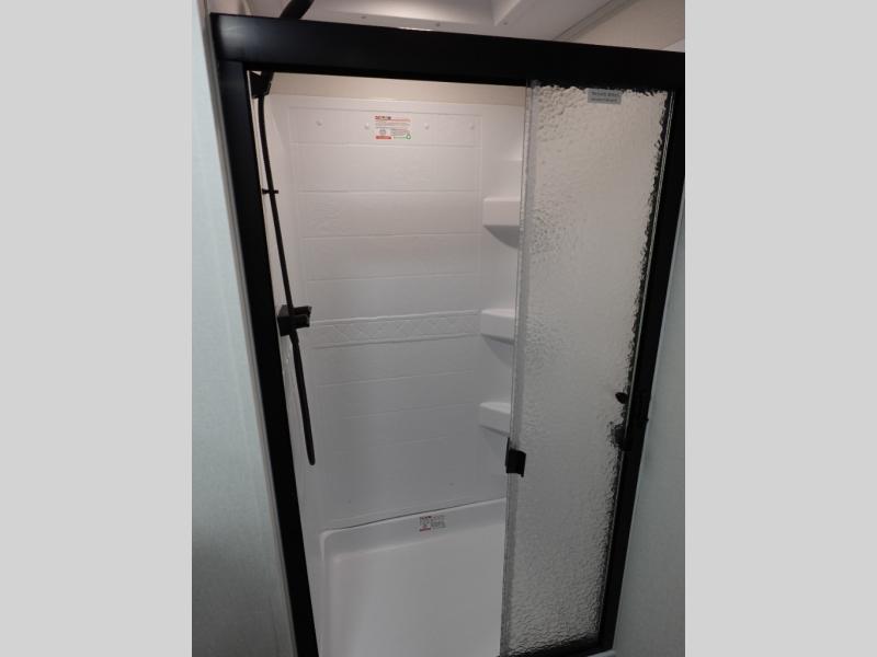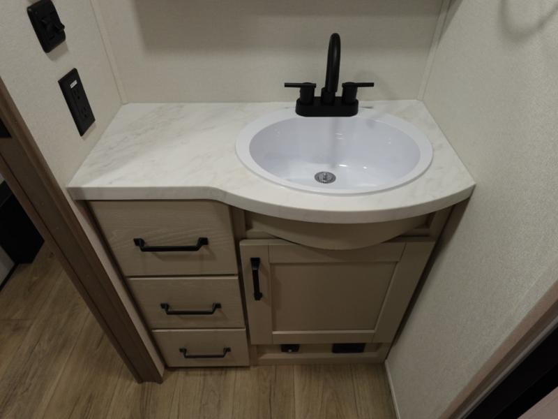 This rear kitchen fifth wheel is sure to meet all of your camping needs! Since the exterior length is only 26' 11", you can easily maneuver in and out of campgrounds. The rear kitchen includes ample counter space to prep meals, a three burner cooktop, and overhead storage for all your necessities. There is a 10 cu. ft. 12V refrigerator within the slide out that also includes the theater seating, and the U-shaped dinette provides a place to dine or play a card game. You will appreciate having convenient storage by the entry door, along with pull-out pet bowls, a functional wardrobe closet in the bedroom and an exterior pass-thru for belongings and camping gear.