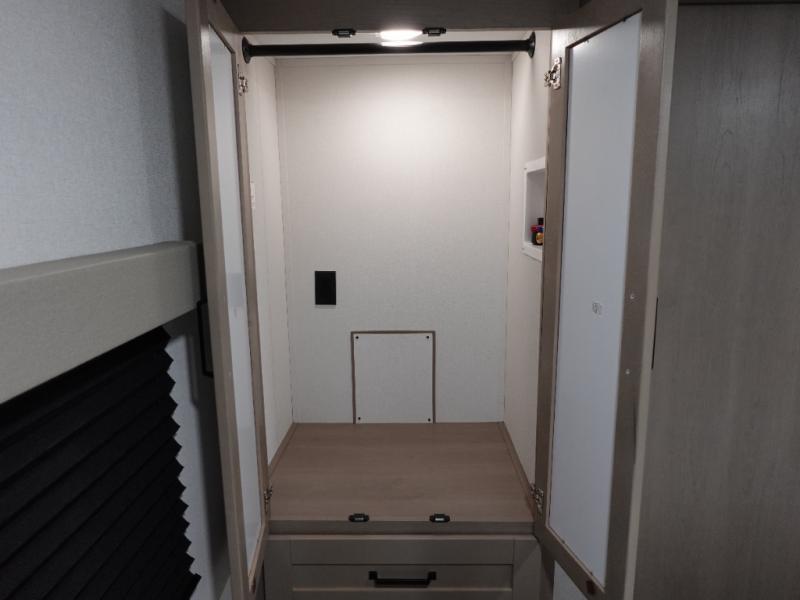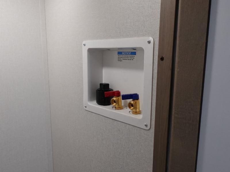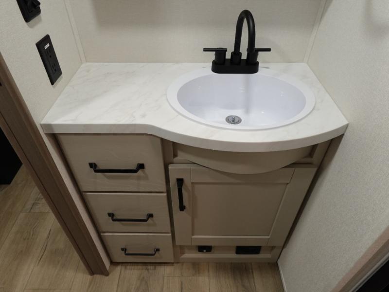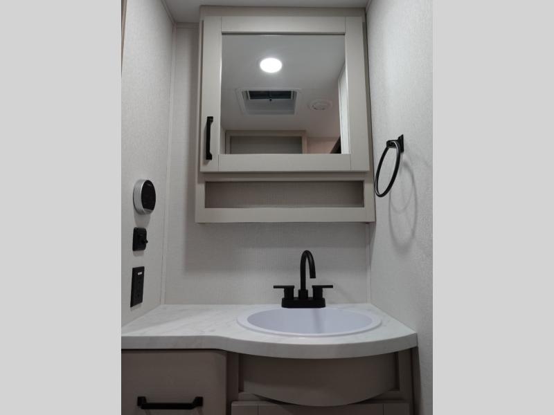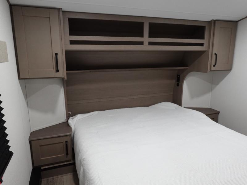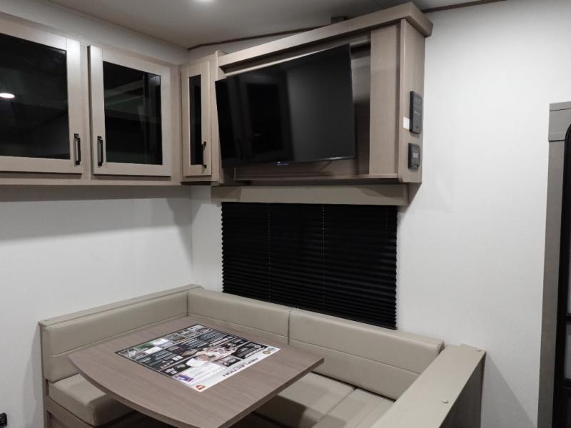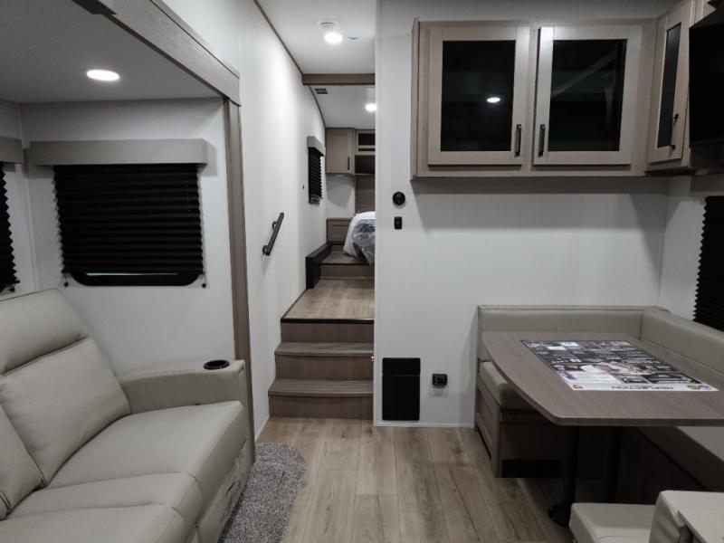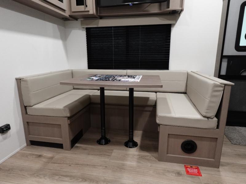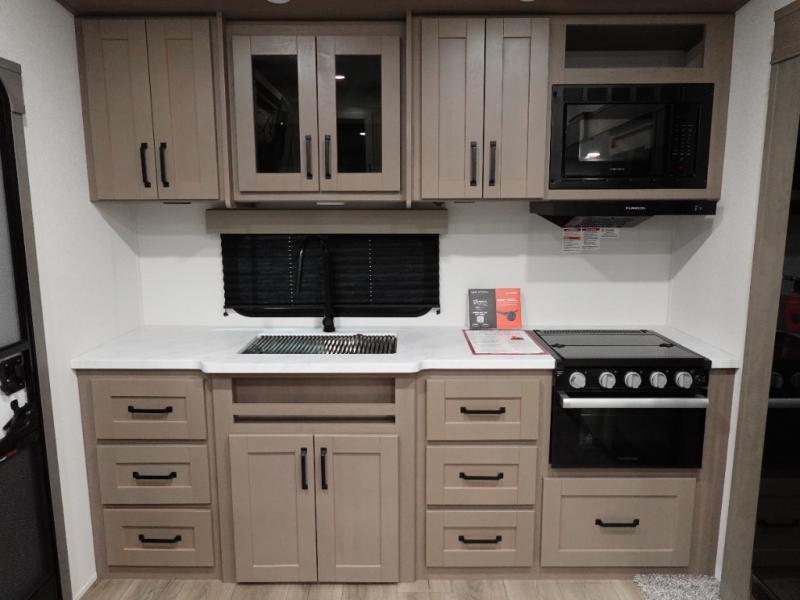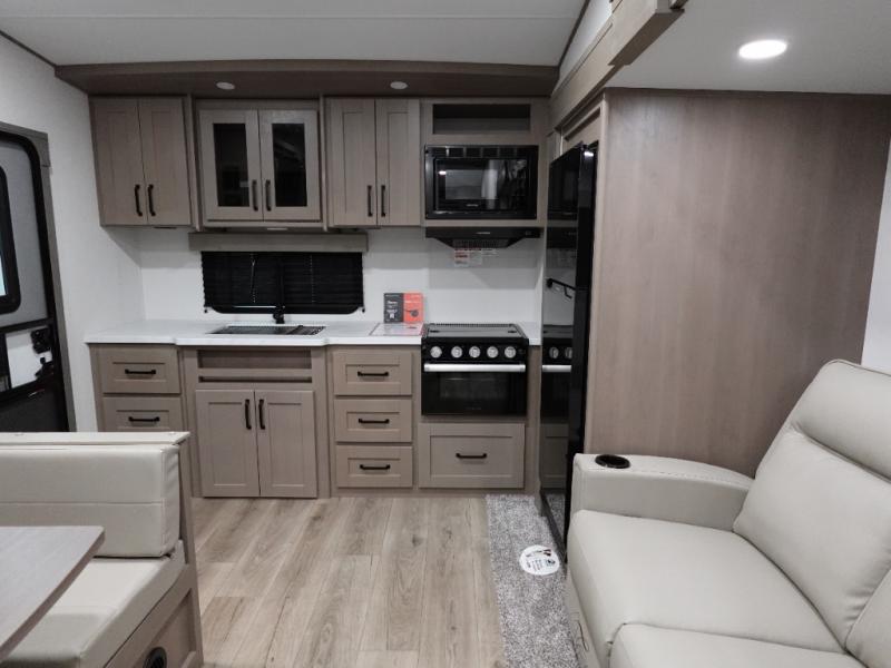 This rear kitchen fifth wheel is sure to meet all of your camping needs! Since the exterior length is only 26' 11", you can easily maneuver in and out of campgrounds. The rear kitchen includes ample counter space to prep meals, a three burner cooktop, and overhead storage for all your necessities. There is a 10 cu. ft. 12V refrigerator within the slide out that also includes the theater seating, and the U-shaped dinette provides a place to dine or play a card game. You will appreciate having convenient storage by the entry door, along with pull-out pet bowls, a functional wardrobe closet in the bedroom and an exterior pass-thru for belongings and camping gear. When you're ready to turn in for the night, the queen bed is sure to bring a great night's rest, while your guests sleep on the booth dinette!