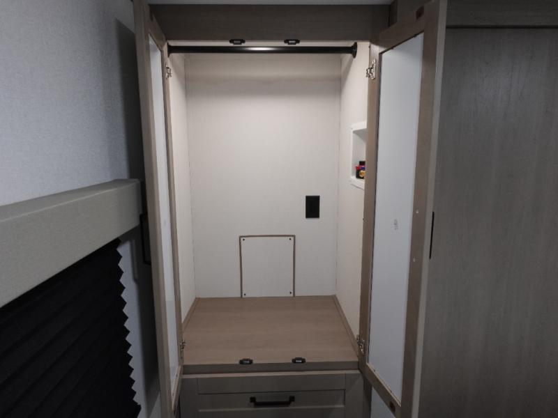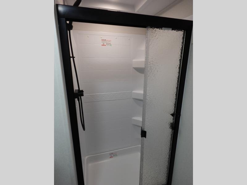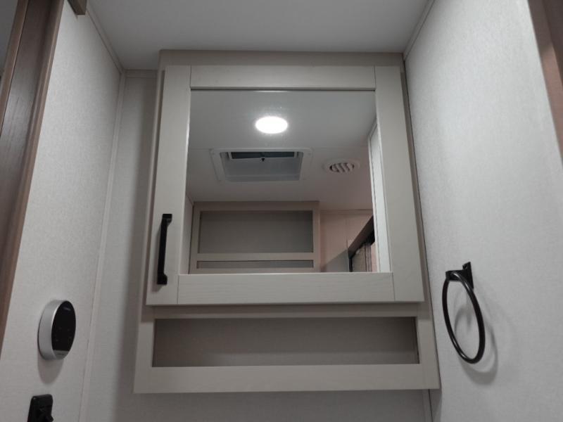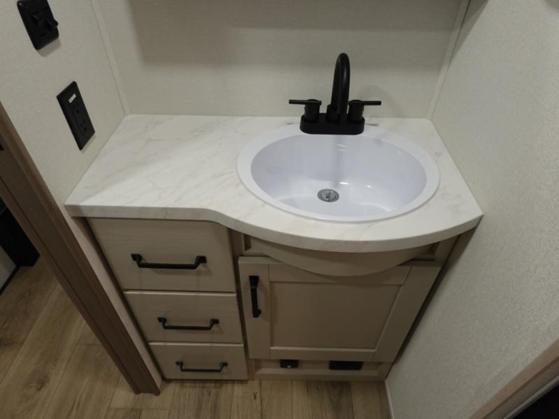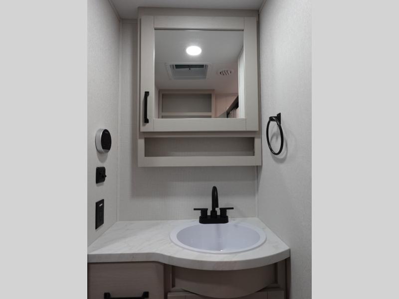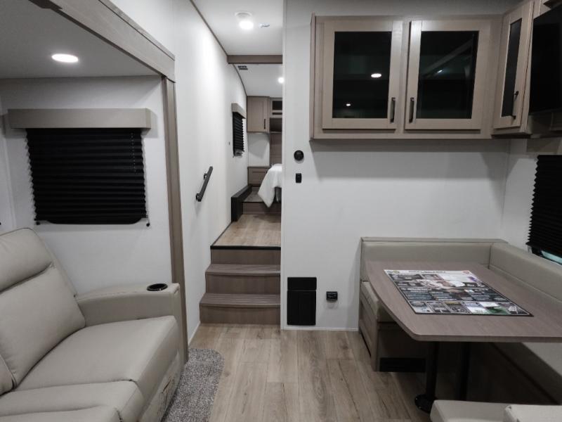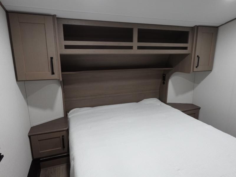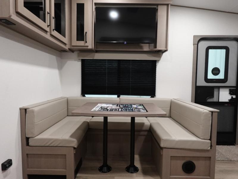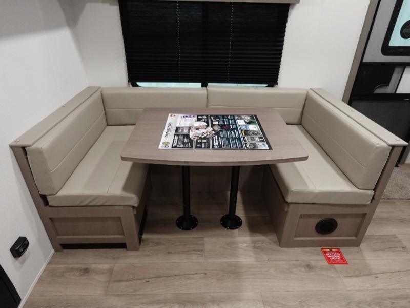This rear kitchen fifth wheel is sure to meet all of your camping needs! Since the exterior length is only 26' 11", you can easily maneuver in and out of campgrounds. The rear kitchen includes ample counter space to prep meals, a three burner cooktop, and overhead storage for all your necessities. There is a 10 cu. ft. 12V refrigerator within the slide out that also includes the theater seating, and the U-shaped dinette provides a place to dine or play a card game. You will appreciate having convenient storage by the entry door, along with pull-out pet bowls, a functional wardrobe closet in the bedroom and an exterior pass-thru for belongings and camping gear.