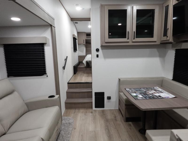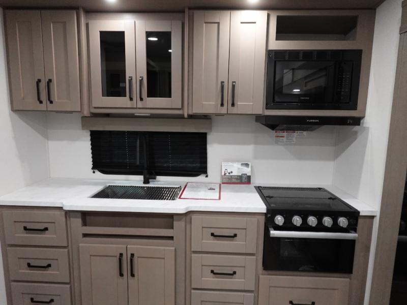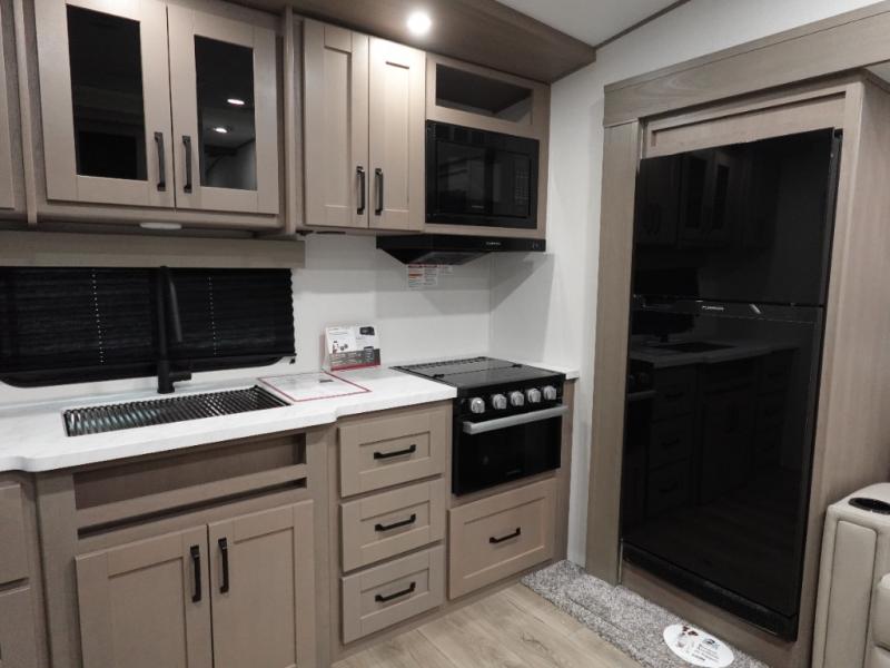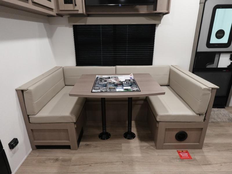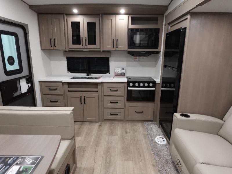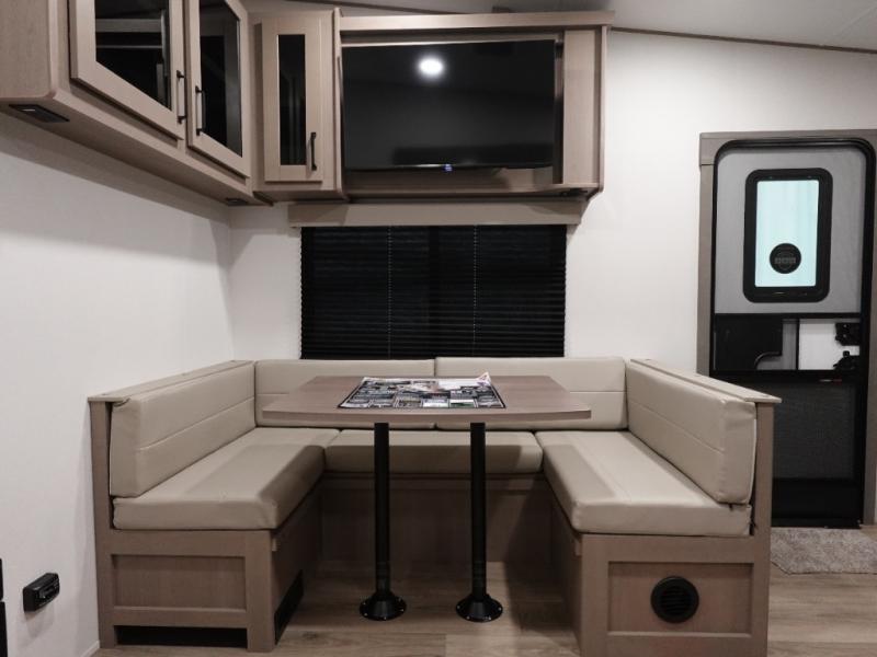 This rear kitchen fifth wheel is sure to meet all of your camping needs! Since the exterior length is only 26' 11", you can easily maneuver in and out of campgrounds. The rear kitchen includes ample counter space to prep meals, a three burner cooktop, and overhead storage for all your necessities. There is a 10 cu. ft. 12V refrigerator within the slide out that also includes the theater seating, and the U-shaped dinette provides a place to dine or play a card game. You will appreciate having convenient storage by the entry door, along with pull-out pet bowls, a functional wardrobe closet in the bedroom and an exterior pass-thru for belongings and camping gear.