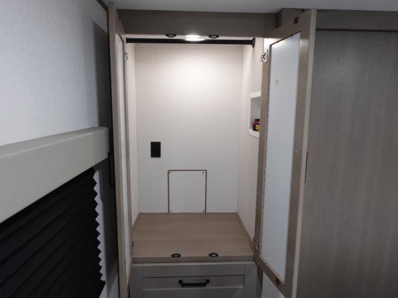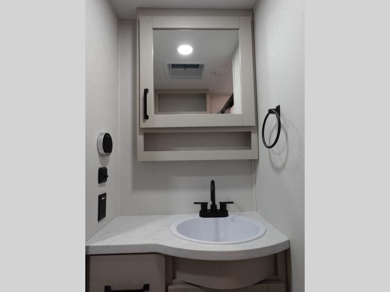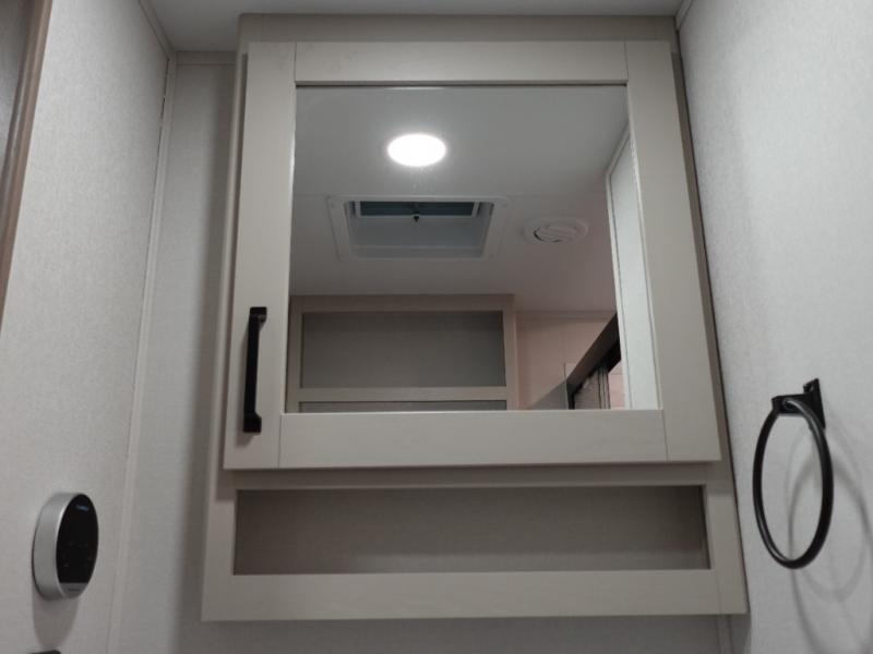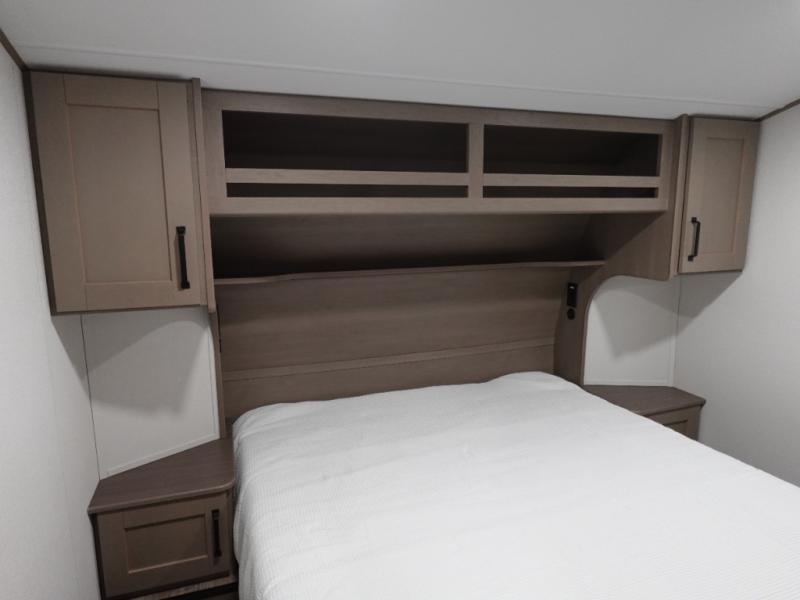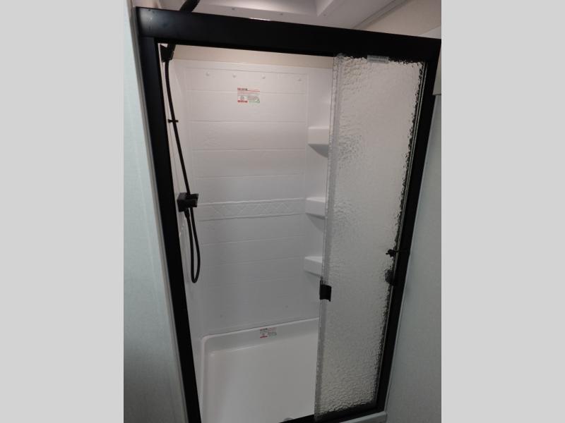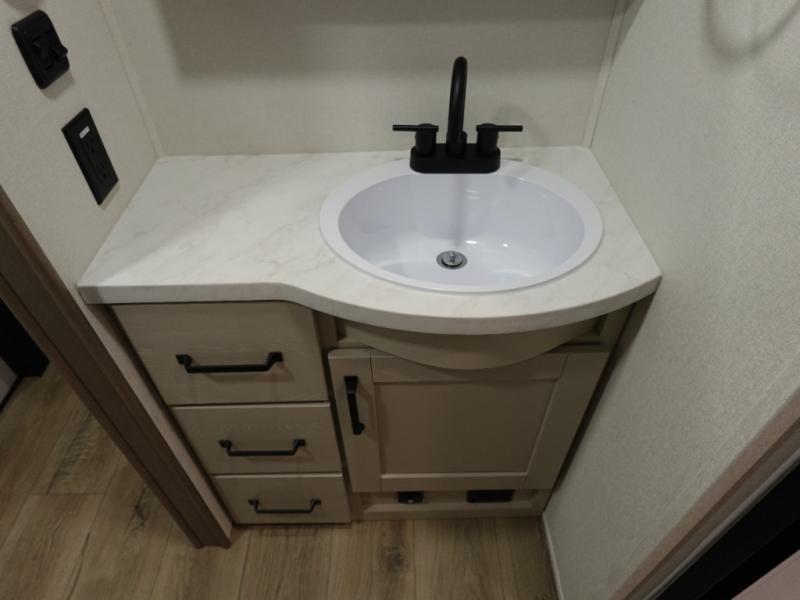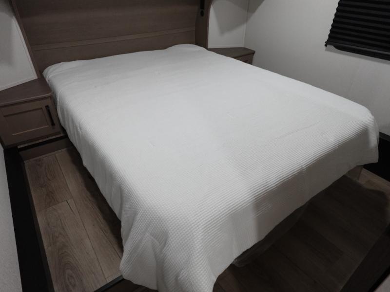 This rear kitchen fifth wheel is sure to meet all of your camping needs! Since the exterior length is only 26' 11", you can easily maneuver in and out of campgrounds. The rear kitchen includes ample counter space to prep meals, a three burner cooktop, and overhead storage for all your necessities. There is a 10 cu. ft. 12V refrigerator within the slide out that also includes the theater seating, and the U-shaped dinette provides a place to dine or play a card game. You will appreciate having convenient storage by the entry door, along with pull-out pet bowls, a functional wardrobe closet in the bedroom and an exterior pass-thru for belongings and camping gear.