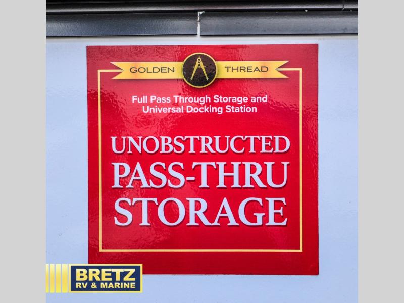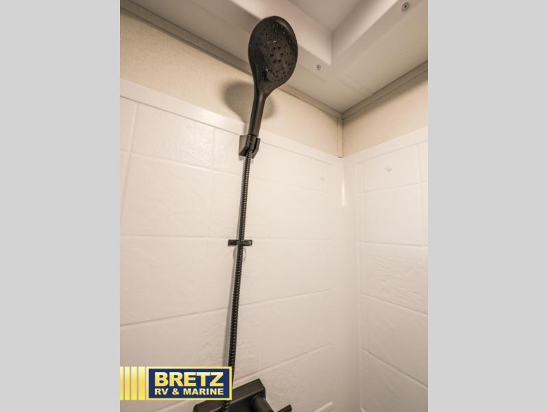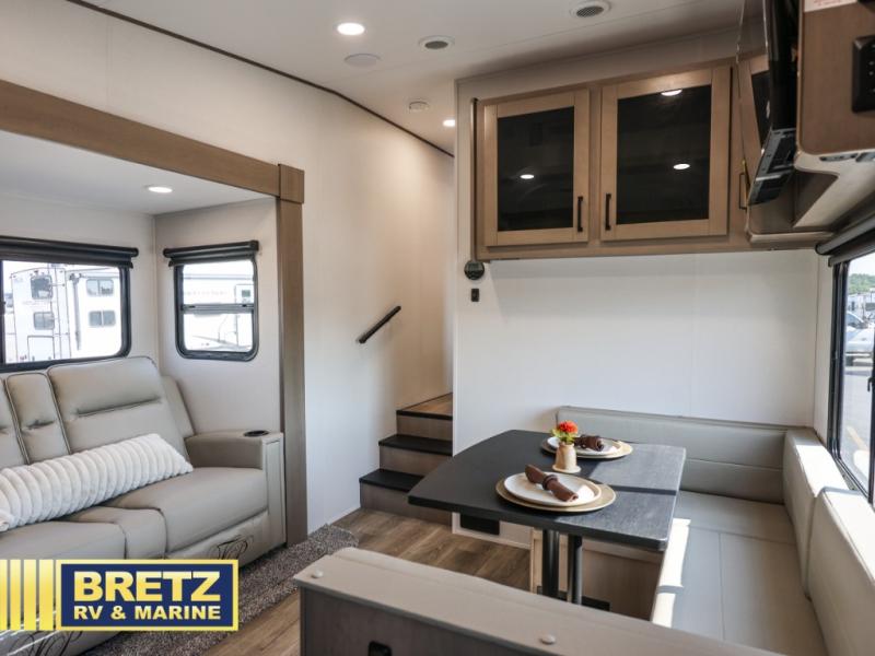 This rear kitchen fifth wheel is sure to meet all of your camping needs! Since the exterior length is only 26' 11", you can easily maneuver in and out of campgrounds. The rear kitchen includes ample counter space to prep meals, a three burner cooktop, and overhead storage for all your necessities. There is a 10 cu. ft. 12V refrigerator within the slide out that also includes the theater seating, and the U-shaped dinette provides a place to dine or play a card game. You will appreciate having convenient storage by the entry door, along with pull-out pet bowls, a functional wardrobe closet in the bedroom and an exterior pass-thru for belongings and camping gear. When you're ready to turn in for the night, the queen bed is sure to bring a great night's rest, while your guests sleep on the booth dinette or optional tri-fold sofa if you replace the theater seating!