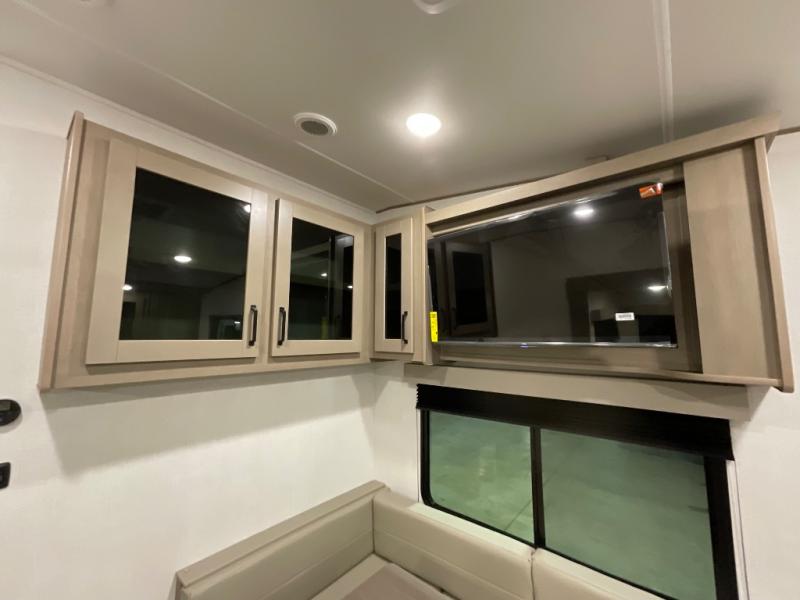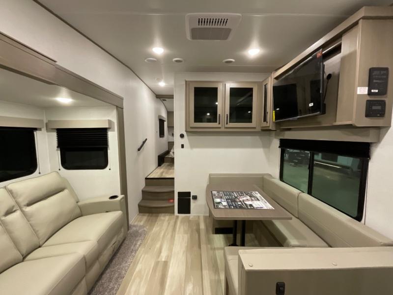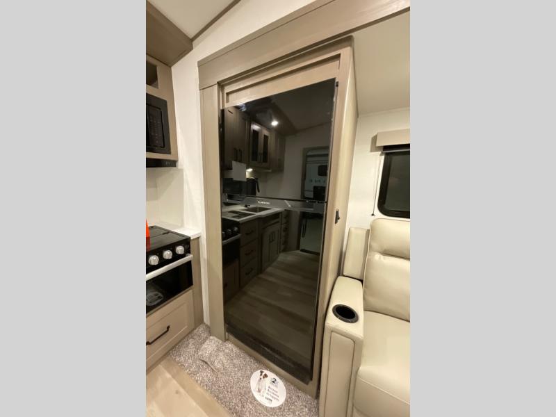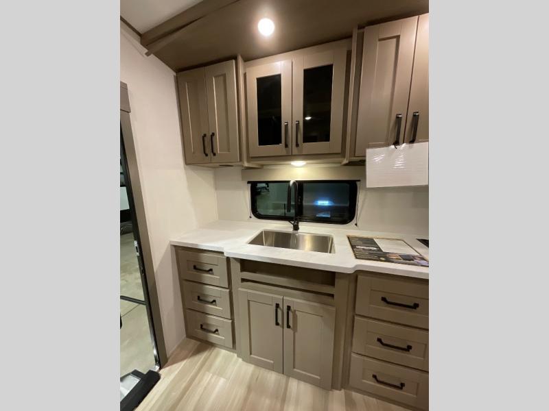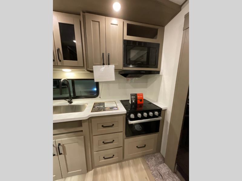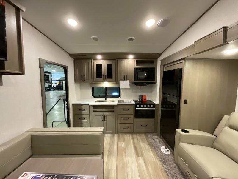 This rear kitchen fifth wheel is sure to meet all of your camping needs! Since the exterior length is only 26' 11", you can easily maneuver in and out of campgrounds. The rear kitchen includes ample counter space to prep meals, a three burner cooktop, and overhead storage for all your necessities. There is a 10 cu. ft. 12V refrigerator within the slide out that also includes the theater seating, and the U-shaped dinette provides a place to dine or play a card game. You will appreciate having convenient storage by the entry door, along with pull-out pet bowls, a functional wardrobe closet in the bedroom and an exterior pass-thru for belongings and camping gear. When you're ready to turn in for the night, the queen bed is sure to bring a great night's rest, while your guests sleep on the booth dinette or optional tri-fold sofa if you replace the theater seating!