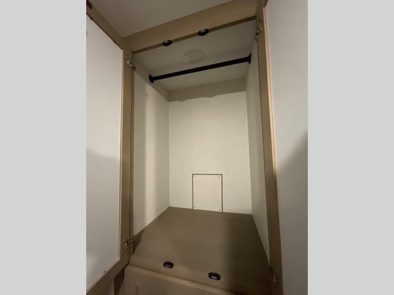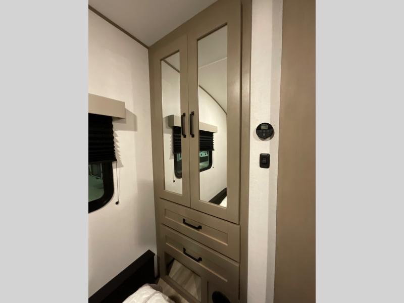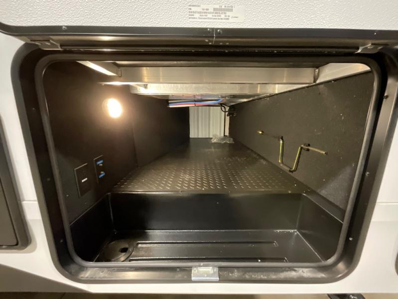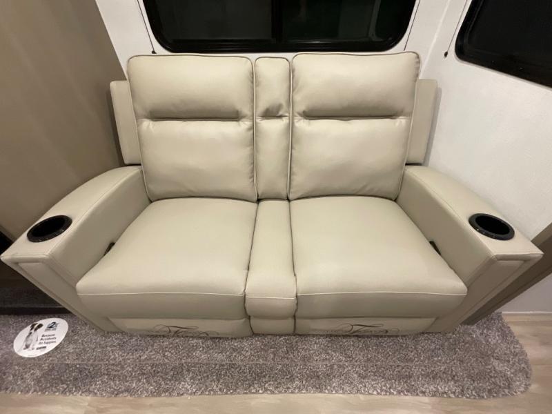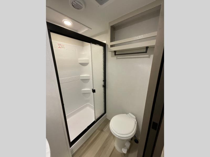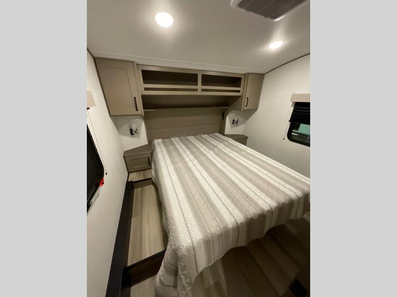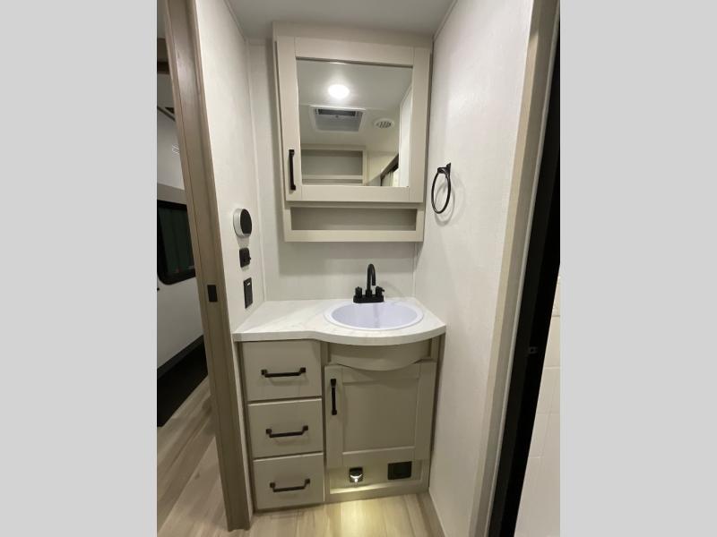 This rear kitchen fifth wheel is sure to meet all of your camping needs! Since the exterior length is only 26' 11", you can easily maneuver in and out of campgrounds. The rear kitchen includes ample counter space to prep meals, a three burner cooktop, and overhead storage for all your necessities. There is a 10 cu. ft. 12V refrigerator within the slide out that also includes the theater seating, and the U-shaped dinette provides a place to dine or play a card game. You will appreciate having convenient storage by the entry door, along with pull-out pet bowls, a functional wardrobe closet in the bedroom and an exterior pass-thru for belongings and camping gear. When you're ready to turn in for the night, the queen bed is sure to bring a great night's rest, while your guests sleep on the booth dinette or optional tri-fold sofa if you replace the theater seating!