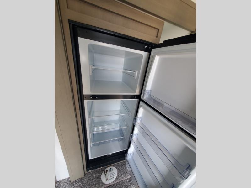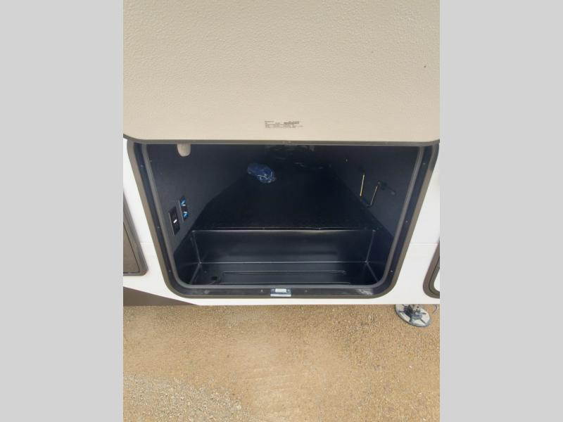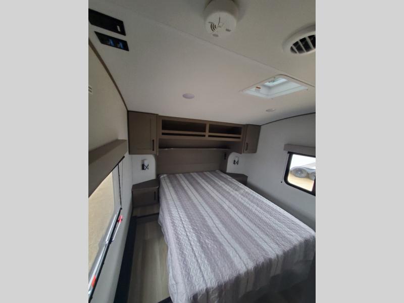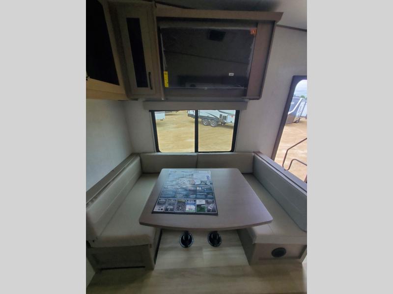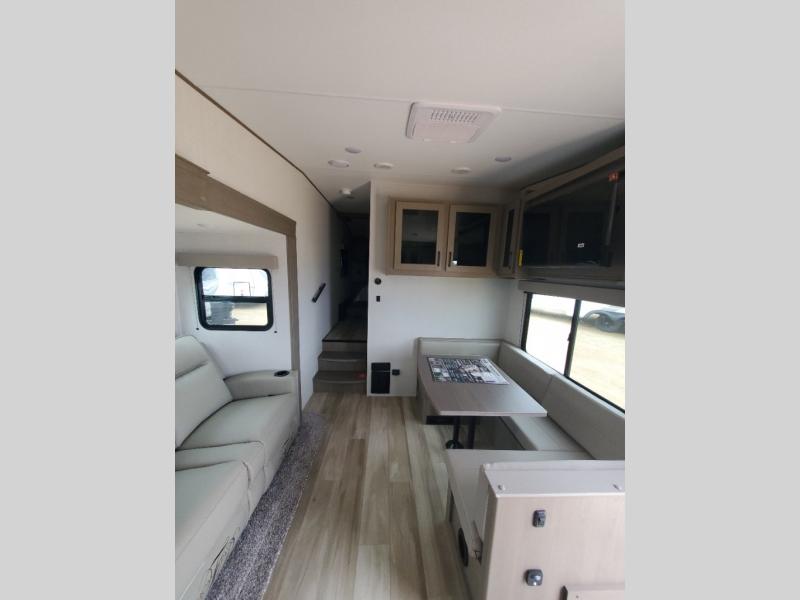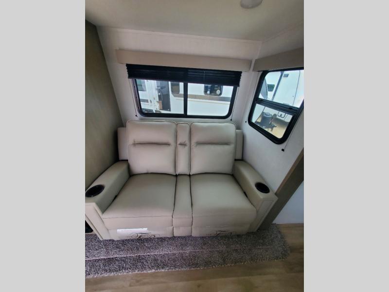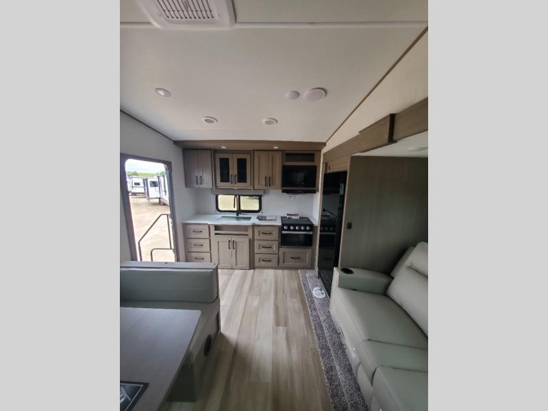 This rear kitchen fifth wheel is sure to meet all of your camping needs! Since the exterior length is only 26' 11", you can easily maneuver in and out of campgrounds. The rear kitchen includes ample counter space to prep meals, a three burner cooktop, and overhead storage for all your necessities. There is a 10 cu. ft. 12V refrigerator within the slide out that also includes the theater seating, and the U-shaped dinette provides a place to dine or play a card game. You will appreciate having convenient storage by the entry door, along with pull-out pet bowls, a functional wardrobe closet in the bedroom and an exterior pass-thru for belongings and camping gear. When you're ready to turn in for the night, the queen bed is sure to bring a great night's rest, while your guests sleep on the booth dinette or optional tri-fold sofa if you replace the theater seating!