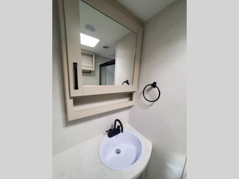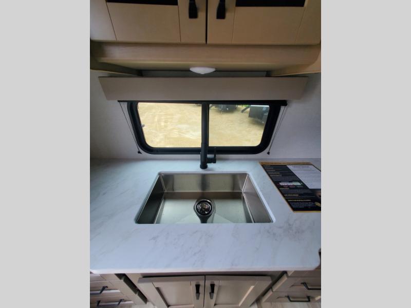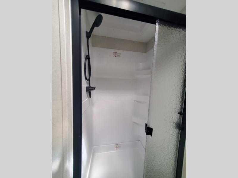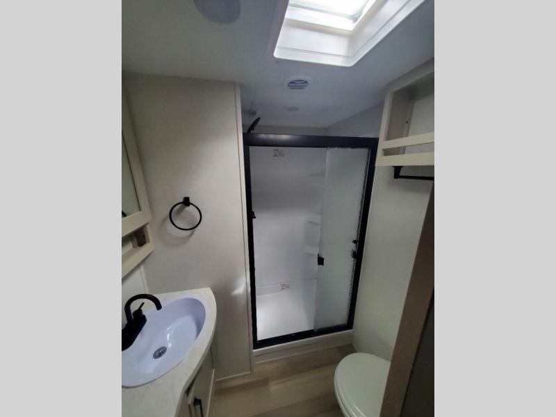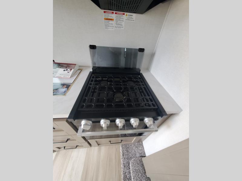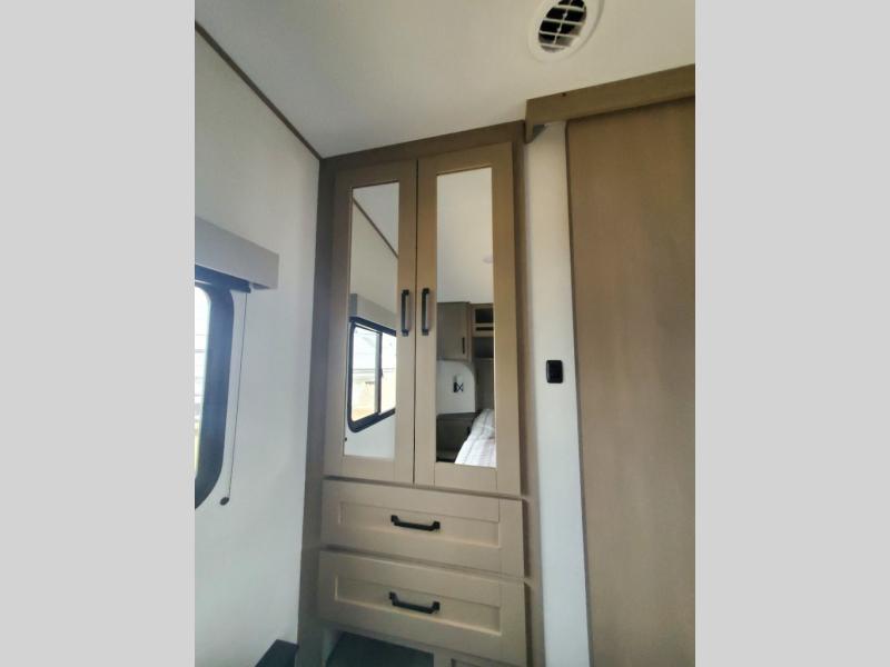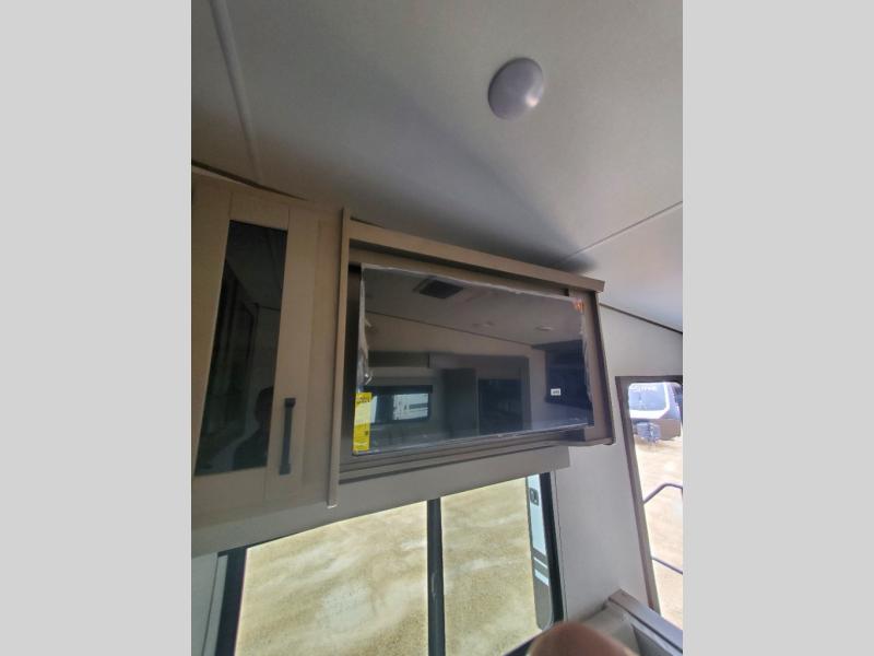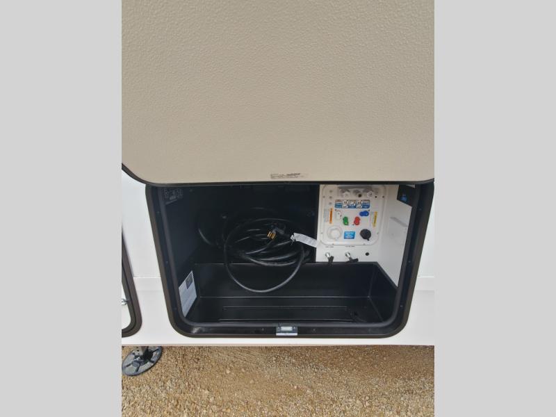 This rear kitchen fifth wheel is sure to meet all of your camping needs! Since the exterior length is only 26' 11", you can easily maneuver in and out of campgrounds. The rear kitchen includes ample counter space to prep meals, a three burner cooktop, and overhead storage for all your necessities. There is a 10 cu. ft. 12V refrigerator within the slide out that also includes the theater seating, and the U-shaped dinette provides a place to dine or play a card game. You will appreciate having convenient storage by the entry door, along with pull-out pet bowls, a functional wardrobe closet in the bedroom and an exterior pass-thru for belongings and camping gear. When you're ready to turn in for the night, the queen bed is sure to bring a great night's rest, while your guests sleep on the booth dinette or optional tri-fold sofa if you replace the theater seating!