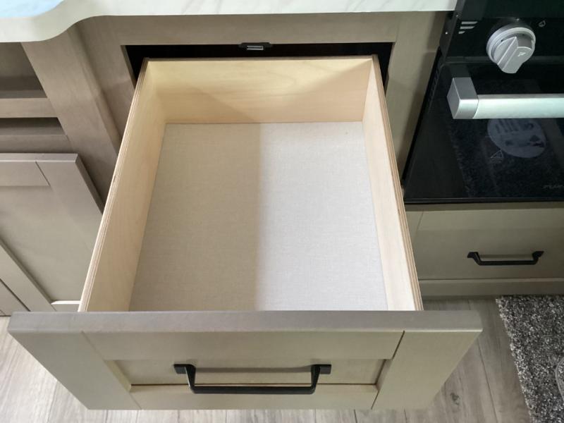 Full galley setup at the back featuring wide counters, a three-burner cooktop, large sink, and generous pantry space. Ideal for gourmet meals or camp cooking. -
