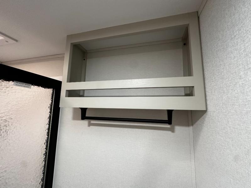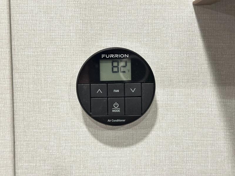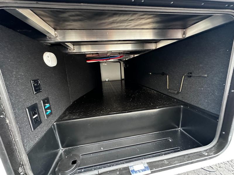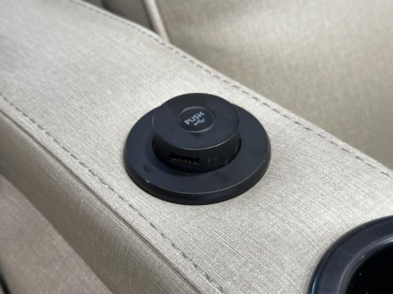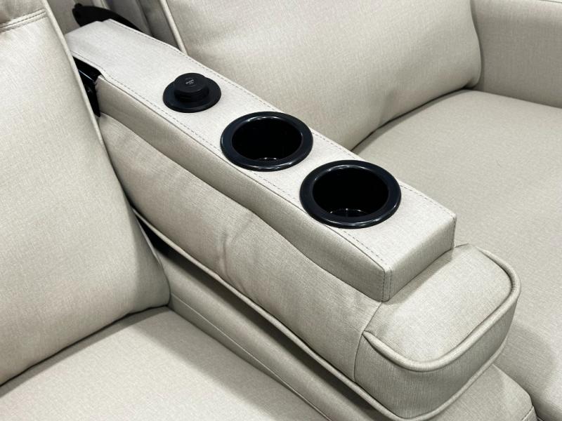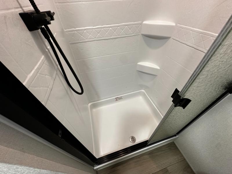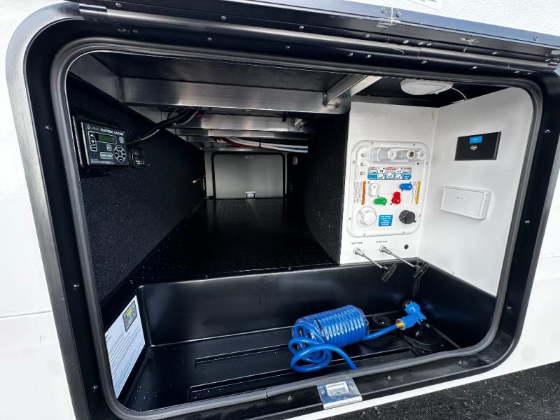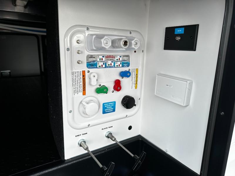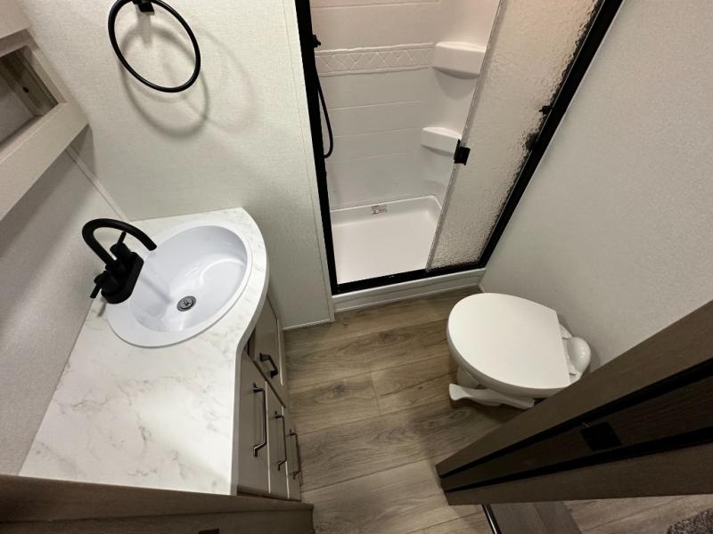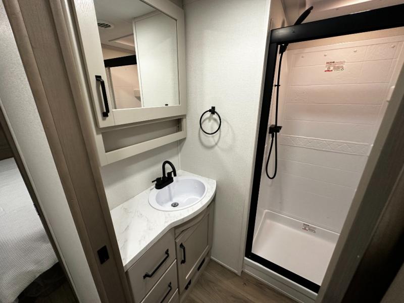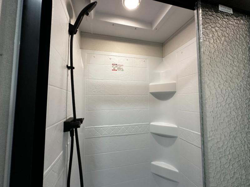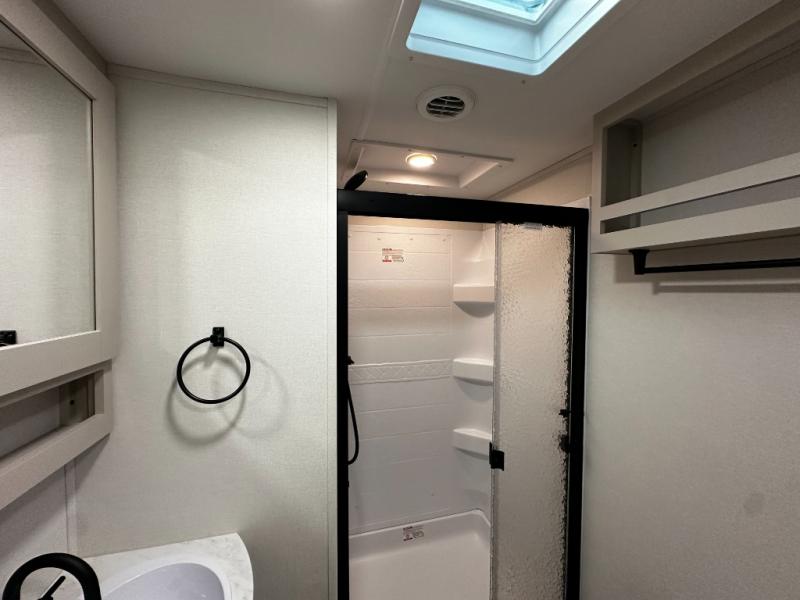The front master suite provides a private retreat with a walk-around queen bed, overhead storage, and dual wardrobes. Thoughtful design touches ensure maximum comfort for a restful night’s sleep. The full bathroom includes a spacious shower, vanity, and convenient storage, delivering residential-style comfort while traveling.