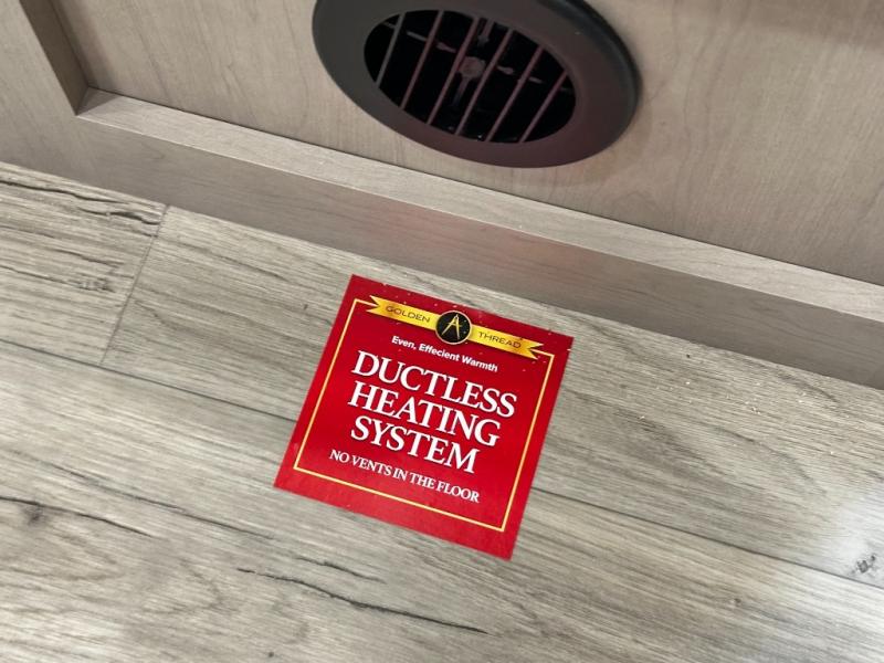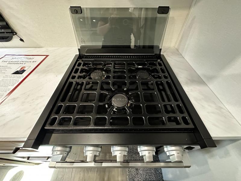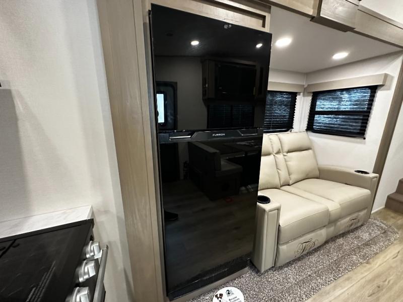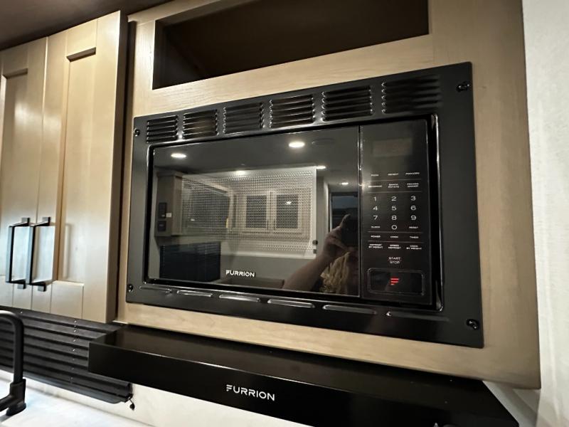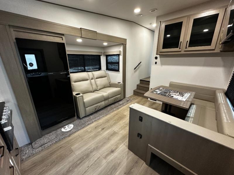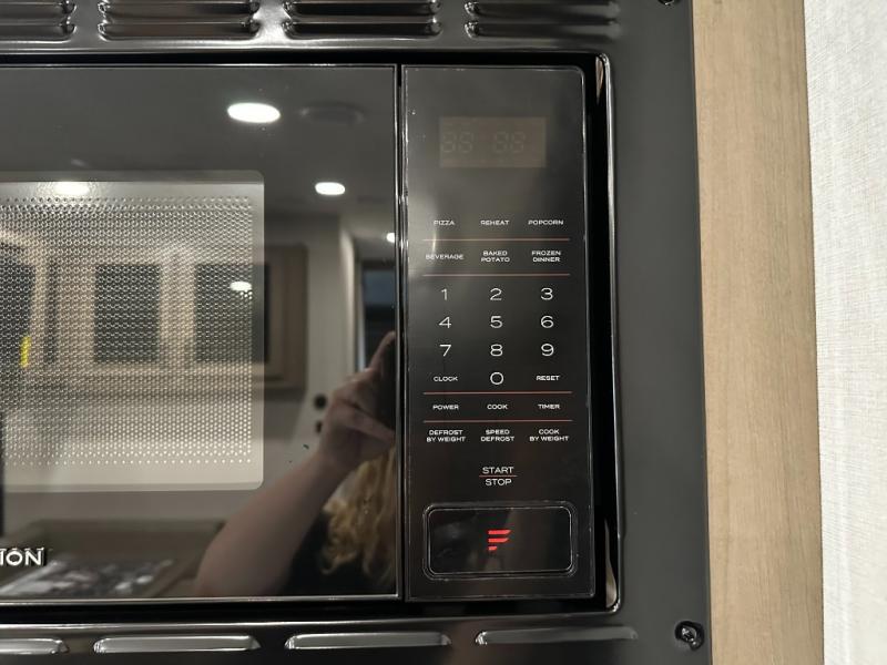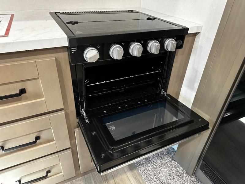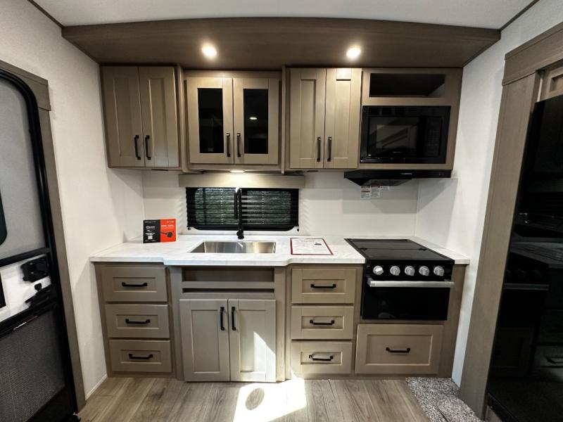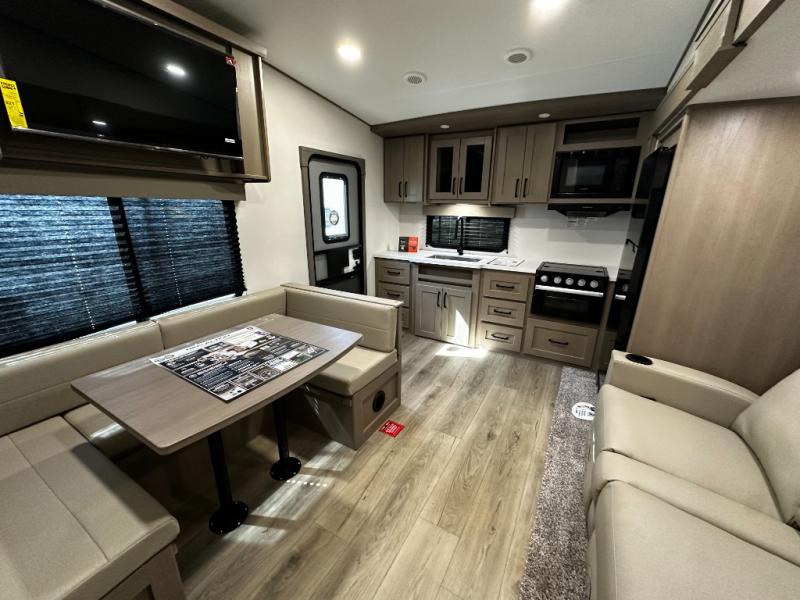 The rear kitchen layout maximizes both space and functionality. Solid-surface countertops, a three-burner cooktop, microwave, and residential refrigerator provide everything you need to prepare meals on the road. Ample cabinetry offers convenient storage for cookware and essentials, while the dinette provides a comfortable spot for meals, games, or working remotely.