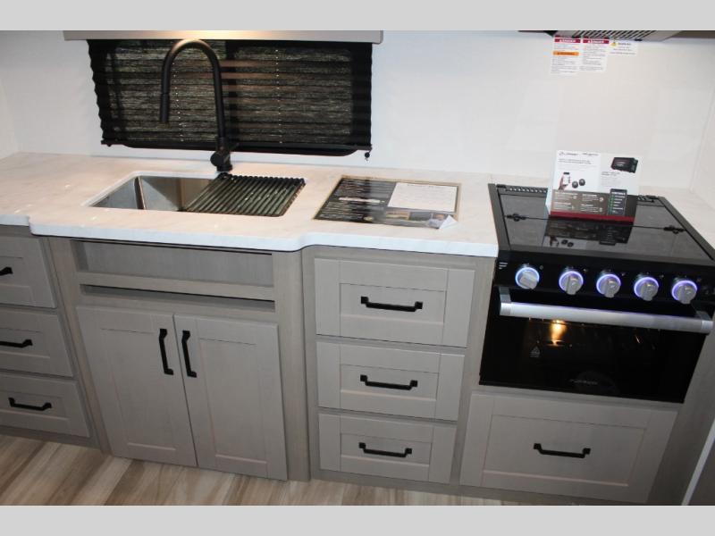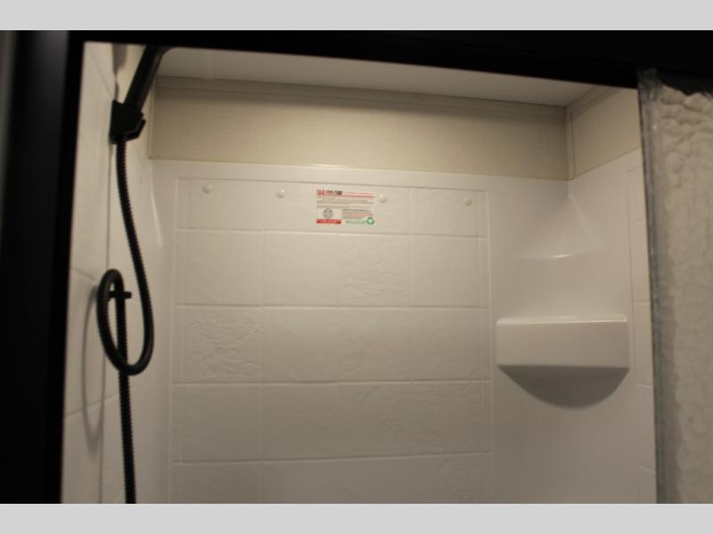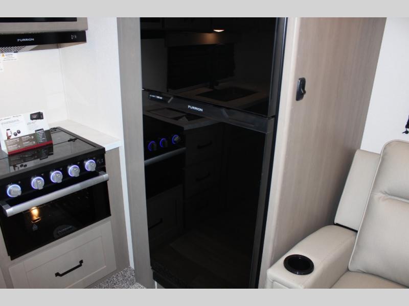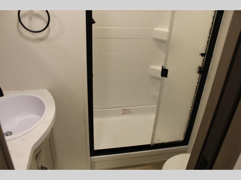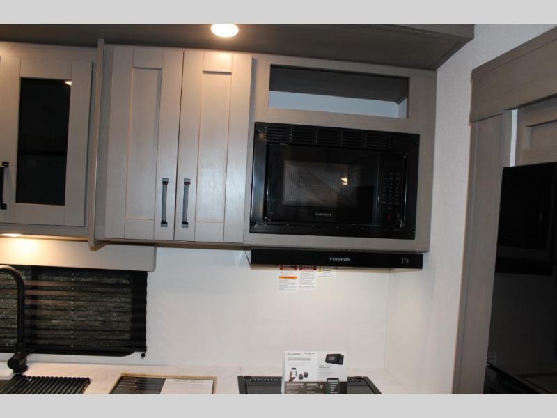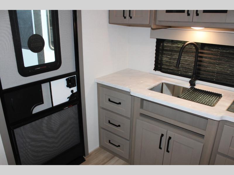 This rear kitchen fifth wheel is sure to meet all of your camping needs! Since the exterior length is only 26' 11", you can easily maneuver in and out of campgrounds. The rear kitchen includes ample counter space to prep meals, a three burner cooktop, and overhead storage for all your necessities. There is a 10 cu. ft. 12V refrigerator within the slide out that also includes the theater seating, and the U-shaped dinette provides a place to dine or play a card game. You will appreciate having convenient storage by the entry door, along with pull-out pet bowls, a functional wardrobe closet in the bedroom and an exterior pass-thru for belongings and camping gear. When you're ready to turn in for the night, the queen bed is sure to bring a great night's rest, while your guests sleep on the booth dinette or optional tri-fold sofa if you replace the theater seating!