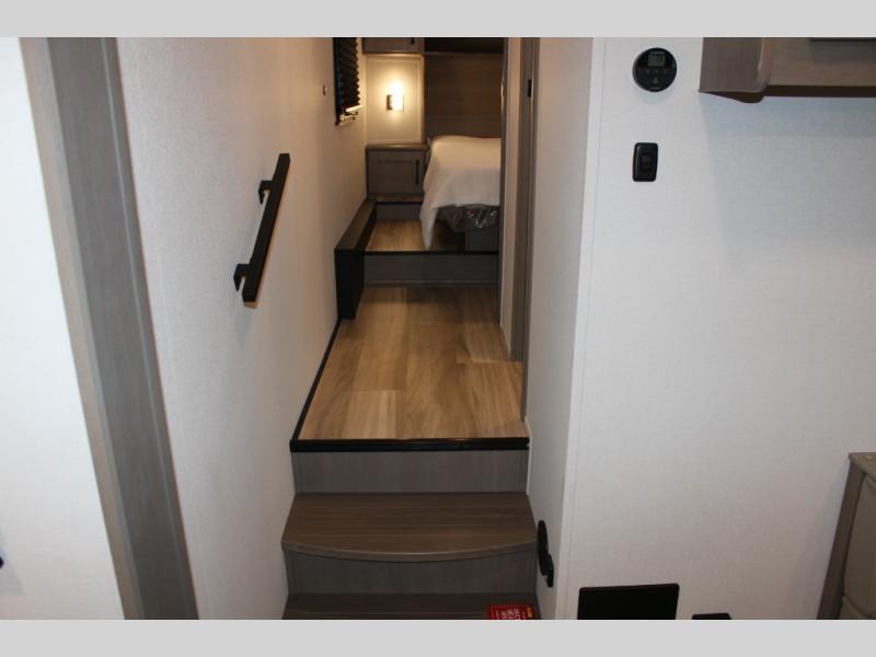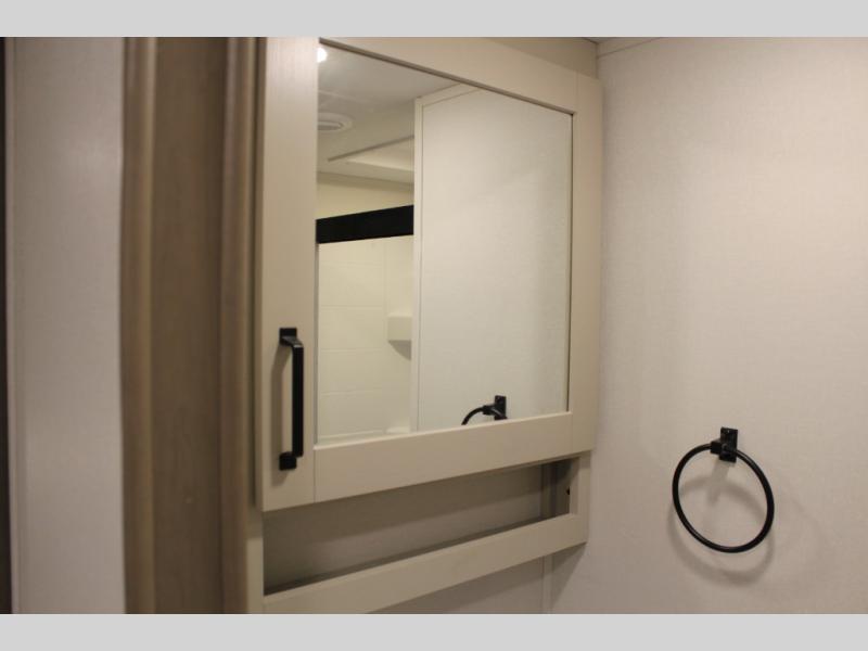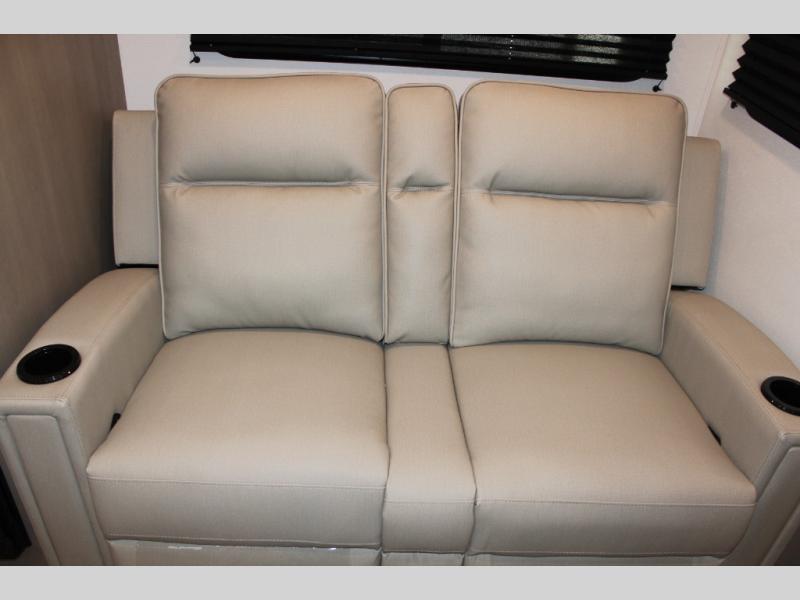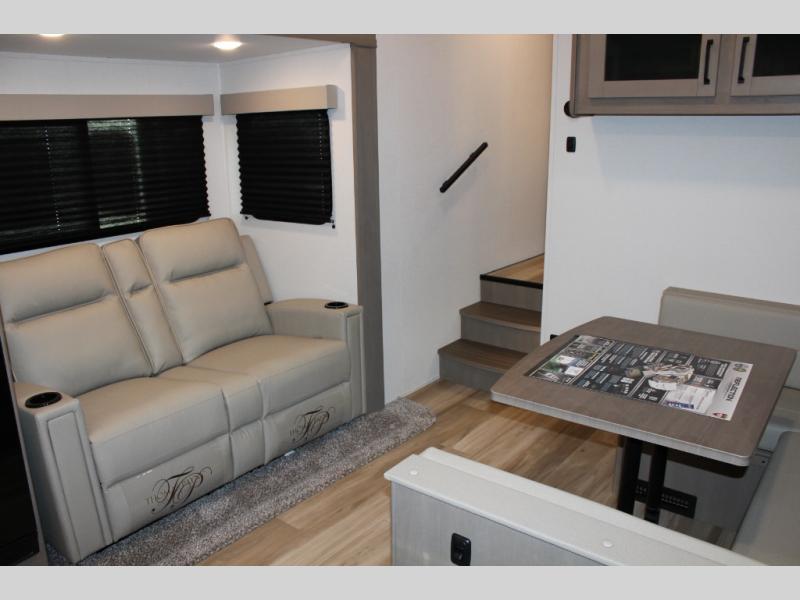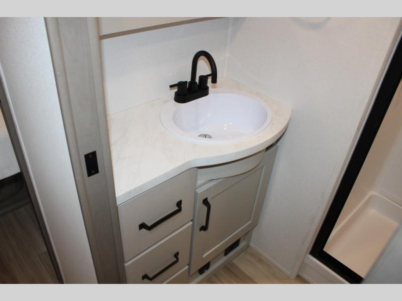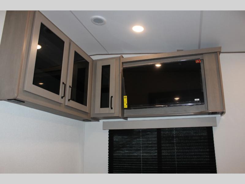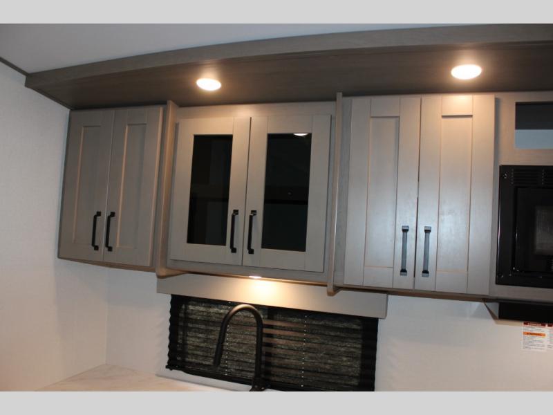 This rear kitchen fifth wheel is sure to meet all of your camping needs! Since the exterior length is only 26' 11", you can easily maneuver in and out of campgrounds. The rear kitchen includes ample counter space to prep meals, a three burner cooktop, and overhead storage for all your necessities. There is a 10 cu. ft. 12V refrigerator within the slide out that also includes the theater seating, and the U-shaped dinette provides a place to dine or play a card game. You will appreciate having convenient storage by the entry door, along with pull-out pet bowls, a functional wardrobe closet in the bedroom and an exterior pass-thru for belongings and camping gear. When you're ready to turn in for the night, the queen bed is sure to bring a great night's rest, while your guests sleep on the booth dinette or optional tri-fold sofa if you replace the theater seating!