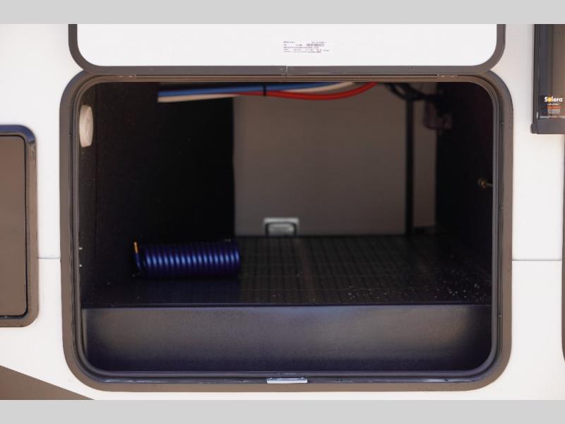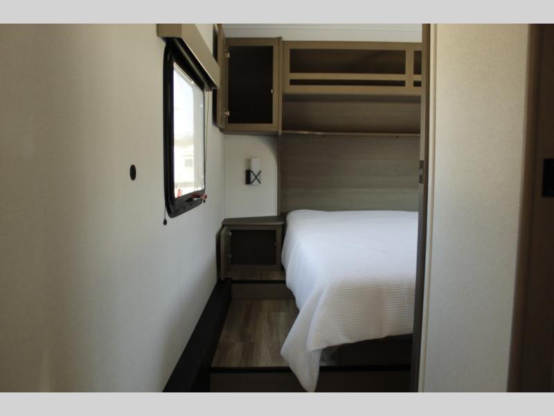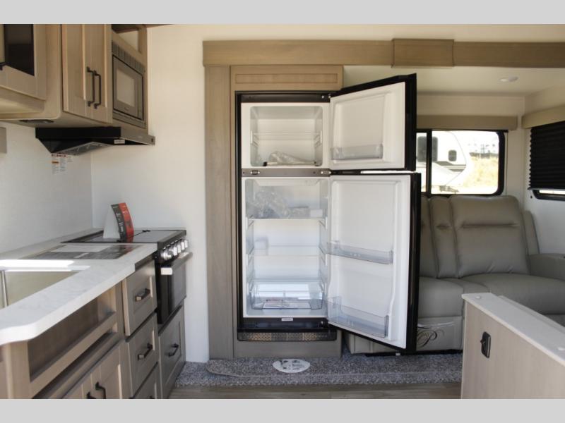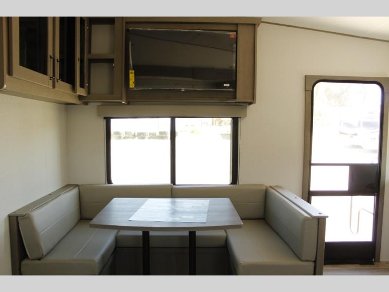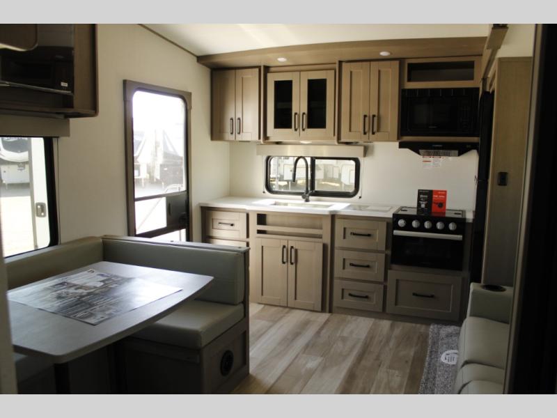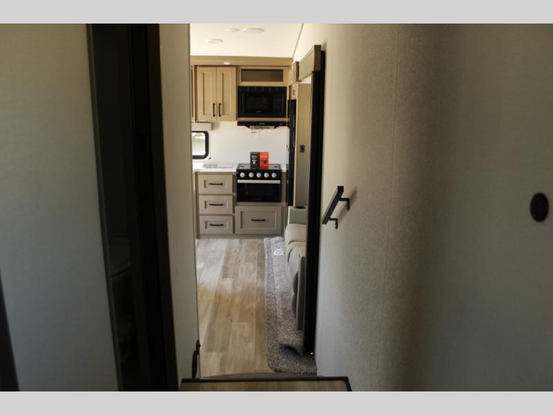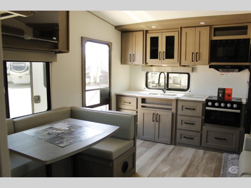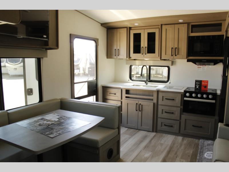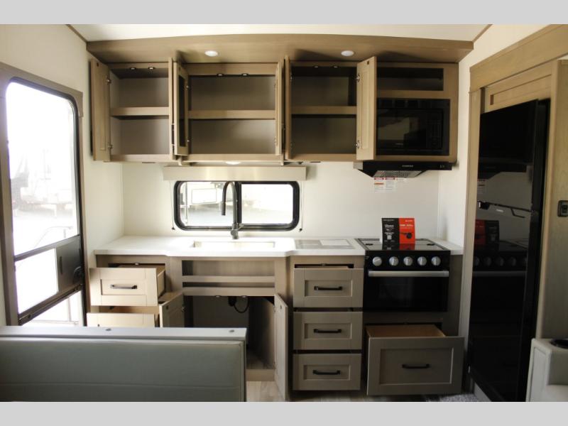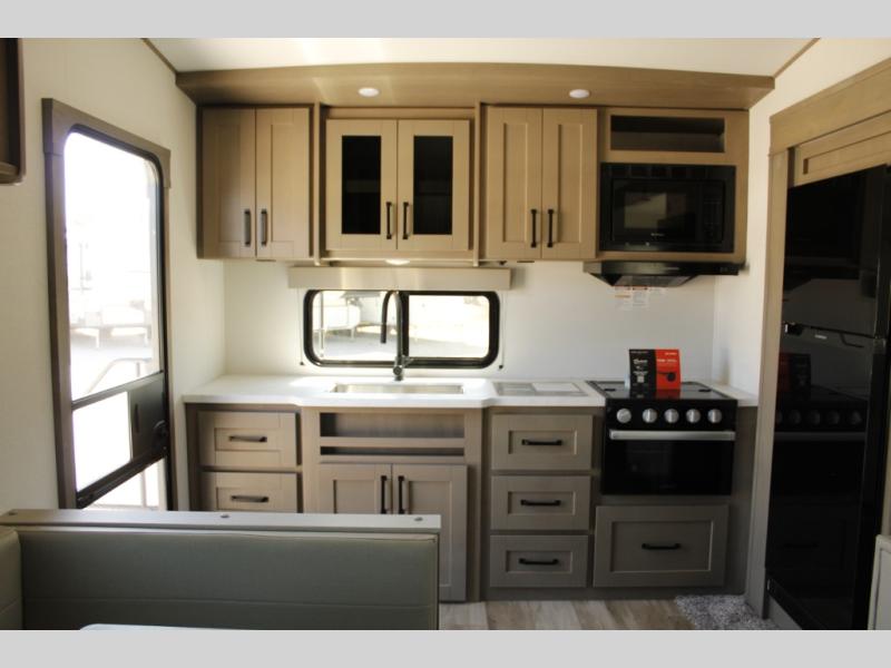 This rear kitchen fifth wheel is sure to meet all of your camping needs! Since the exterior length is only 26' 11", you can easily maneuver in and out of campgrounds. The rear kitchen includes ample counter space to prep meals, a three burner cooktop, and overhead storage for all your necessities. There is a 10 cu. ft. 12V refrigerator within the slide out that also includes the theater seating, and the U-shaped dinette provides a place to dine or play a card game. You will appreciate having convenient storage by the entry door, along with pull-out pet bowls, a functional wardrobe closet in the bedroom and an exterior pass-thru for belongings and camping gear. When you're ready to turn in for the night, the queen bed is sure to bring a great night's rest, while your guests sleep on the booth dinette or optional tri-fold sofa if you replace the theater seating!