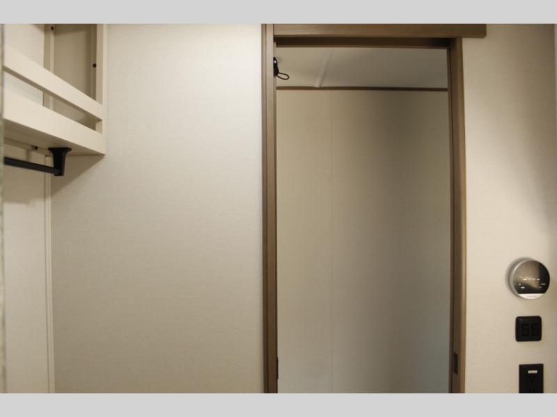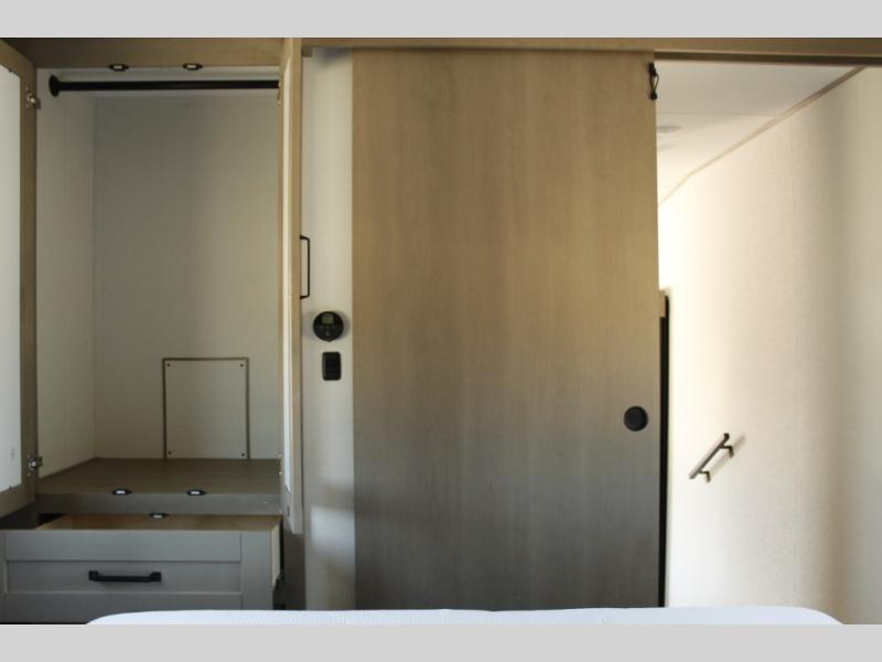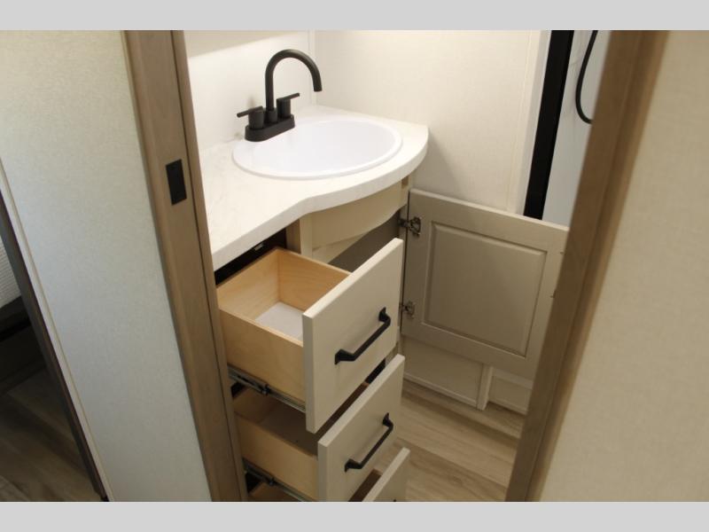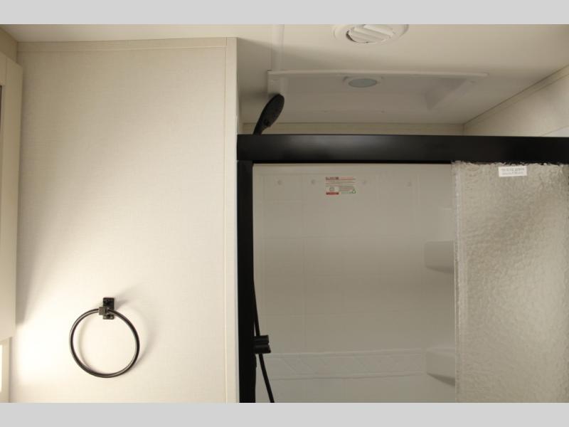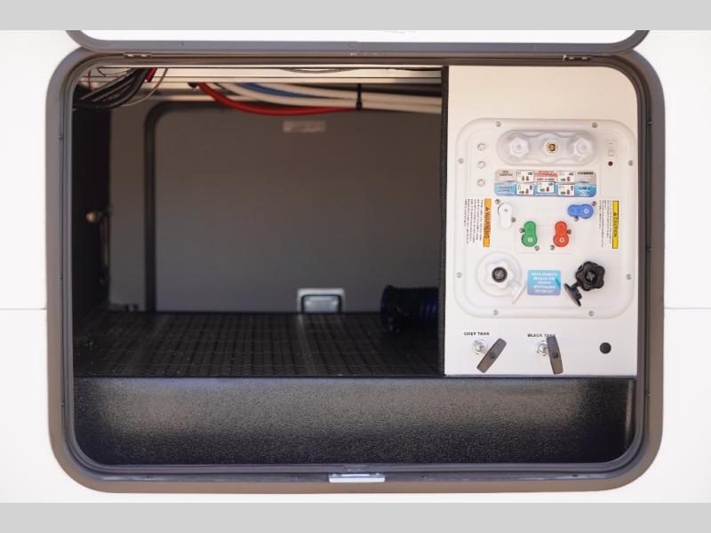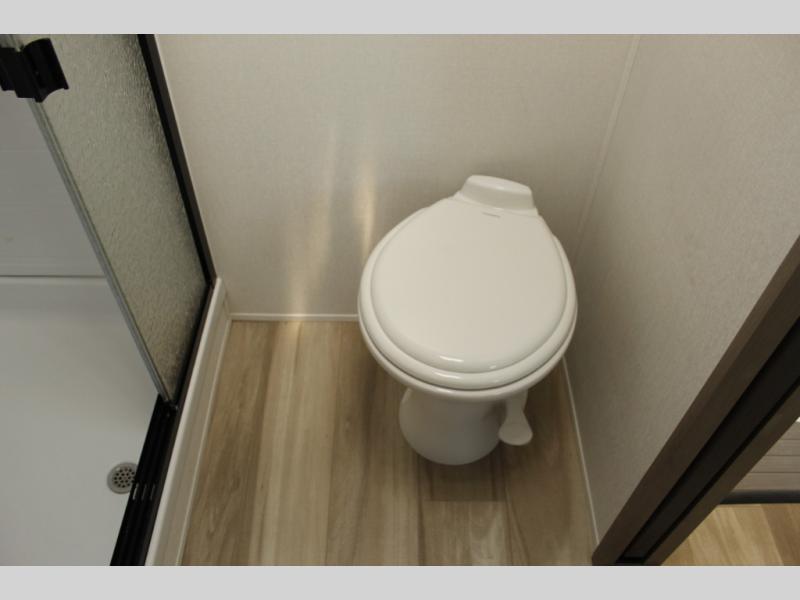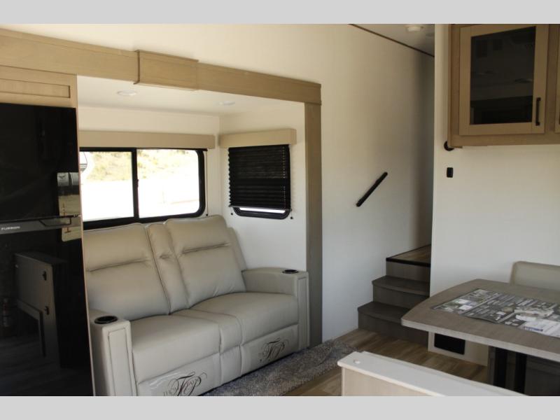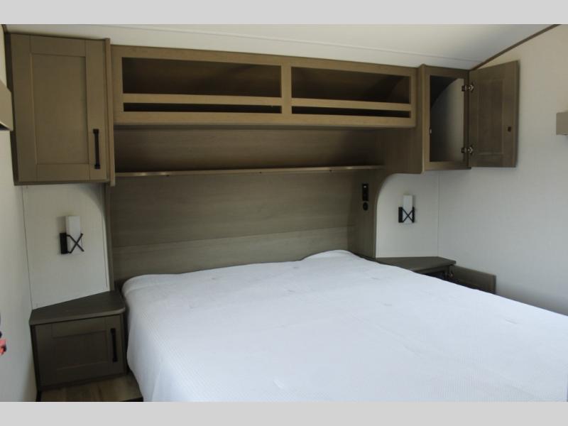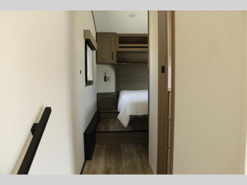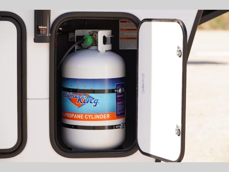 This rear kitchen fifth wheel is sure to meet all of your camping needs! Since the exterior length is only 26' 11", you can easily maneuver in and out of campgrounds. The rear kitchen includes ample counter space to prep meals, a three burner cooktop, and overhead storage for all your necessities. There is a 10 cu. ft. 12V refrigerator within the slide out that also includes the theater seating, and the U-shaped dinette provides a place to dine or play a card game. You will appreciate having convenient storage by the entry door, along with pull-out pet bowls, a functional wardrobe closet in the bedroom and an exterior pass-thru for belongings and camping gear. When you're ready to turn in for the night, the queen bed is sure to bring a great night's rest, while your guests sleep on the booth dinette or optional tri-fold sofa if you replace the theater seating!