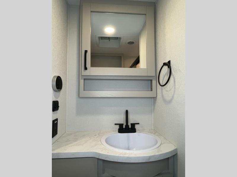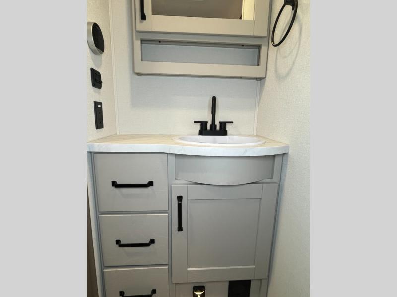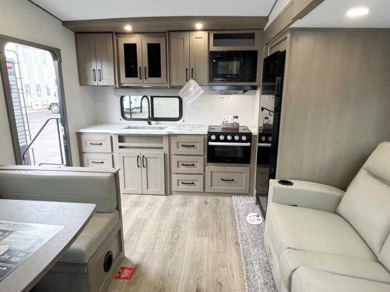 This rear kitchen fifth wheel is sure to meet all of your camping needs! Since the exterior length is only 26' 11", you can easily maneuver in and out of campgrounds. The rear kitchen includes ample counter space to prep meals, a three burner cooktop, and overhead storage for all your necessities. There is a 10 cu. ft. 12V refrigerator within the slide out that also includes the theater seating, and the U-shaped dinette provides a place to dine or play a card game. You will appreciate having convenient storage by the entry door, along with pull-out pet bowls, a functional wardrobe closet in the bedroom and an exterior pass-thru for belongings and camping gear. When you're ready to turn in for the night, the queen bed is sure to bring a great night's rest, while your guests sleep on the booth dinette or optional tri-fold sofa if you replace the theater seating!