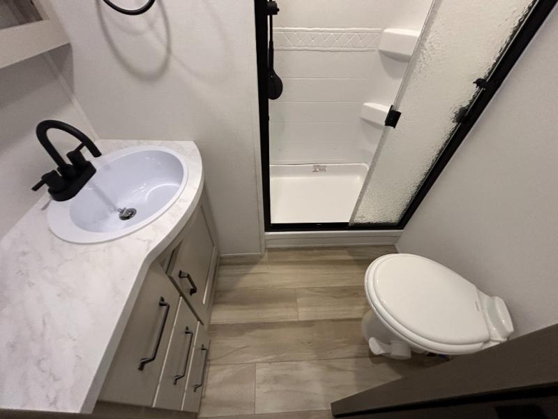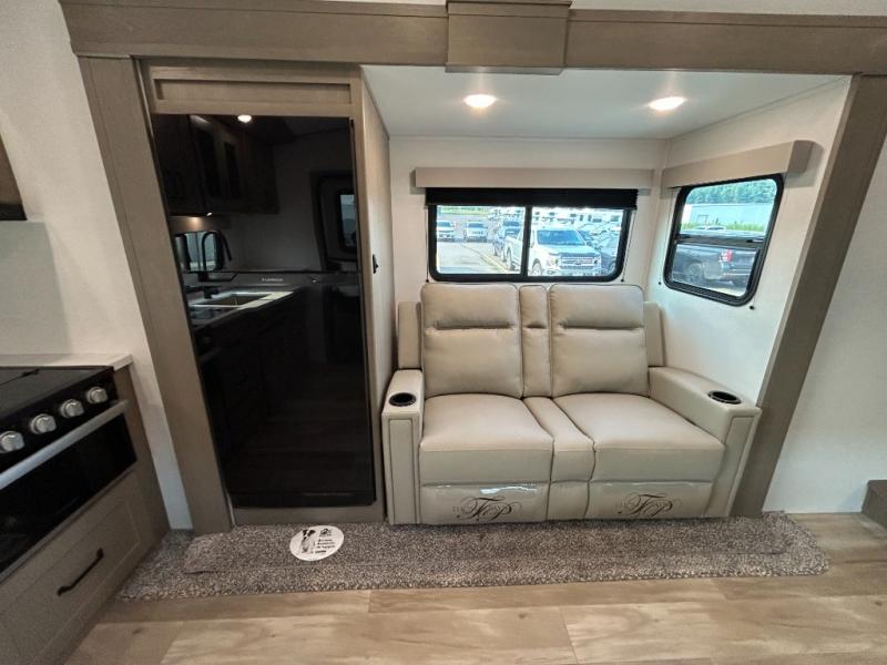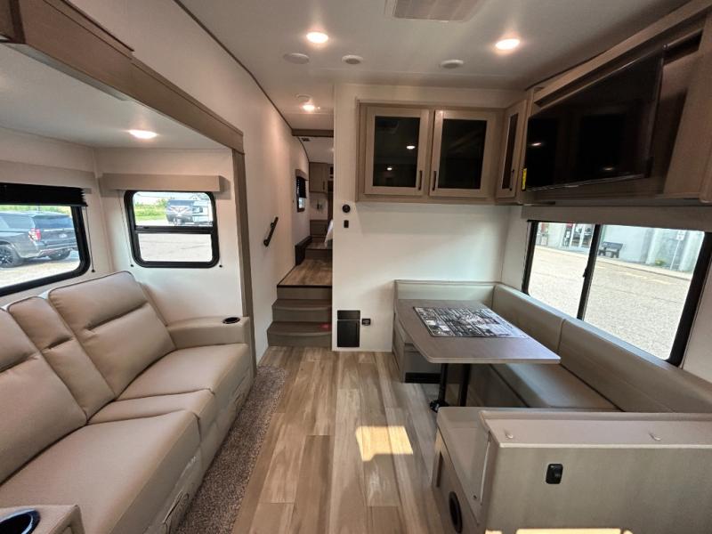 This rear kitchen fifth wheel is sure to meet all of your camping needs! Since the exterior length is only 26' 11", you can easily maneuver in and out of campgrounds. The rear kitchen includes ample counter space to prep meals, a three burner cooktop, and overhead storage for all your necessities. There is a 10 cu. ft. 12V refrigerator within the slide out that also includes the theater seating, and the U-shaped dinette provides a place to dine or play a card game. You will appreciate having convenient storage by the entry door, along with pull-out pet bowls, a functional wardrobe closet in the bedroom and an exterior pass-thru for belongings and camping gear. When you're ready to turn in for the night, the queen bed is sure to bring a great night's rest, while your guests sleep on the booth dinette or optional tri-fold sofa if you replace the theater seating!