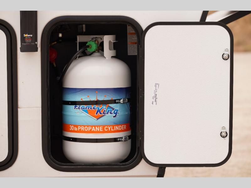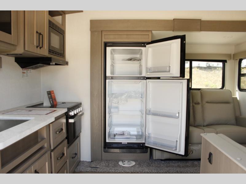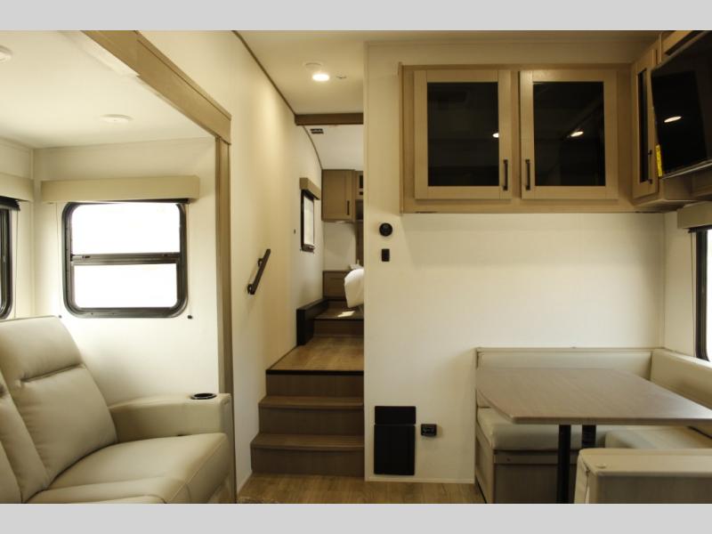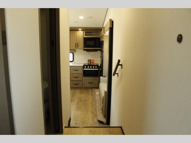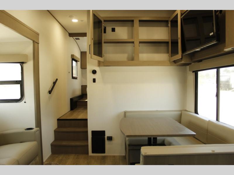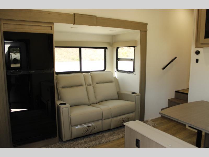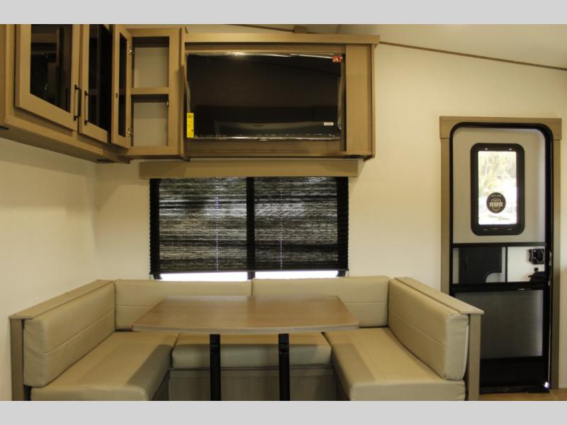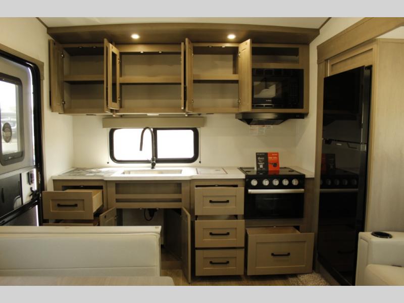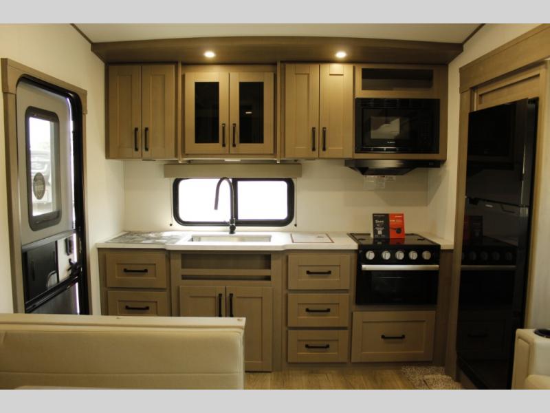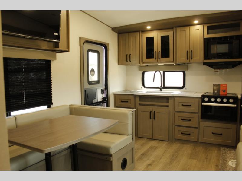 This rear kitchen fifth wheel is sure to meet all of your camping needs! Since the exterior length is only 26' 11", you can easily maneuver in and out of campgrounds. The rear kitchen includes ample counter space to prep meals, a three burner cooktop, and overhead storage for all your necessities. There is a 10 cu. ft. 12V refrigerator within the slide out that also includes the theater seating, and the U-shaped dinette provides a place to dine or play a card game. You will appreciate having convenient storage by the entry door, along with pull-out pet bowls, a functional wardrobe closet in the bedroom and an exterior pass-thru for belongings and camping gear. When you're ready to turn in for the night, the queen bed is sure to bring a great night's rest, while your guests sleep on the booth dinette or optional tri-fold sofa if you replace the theater seating!