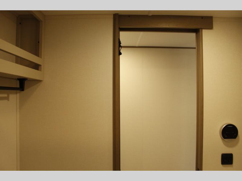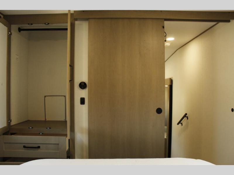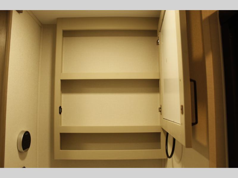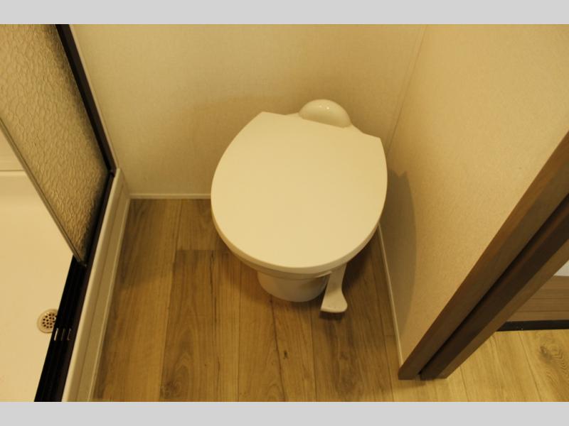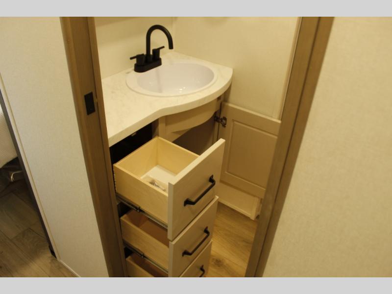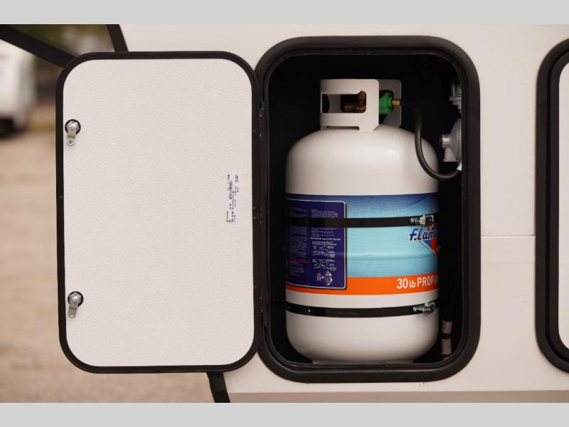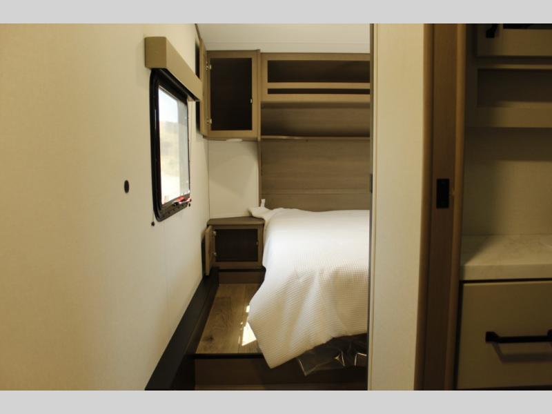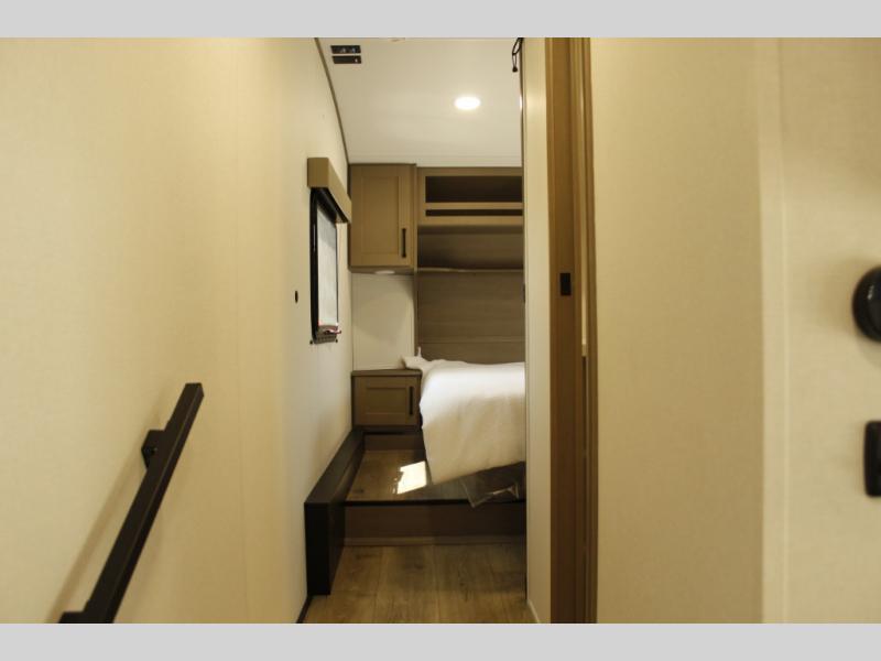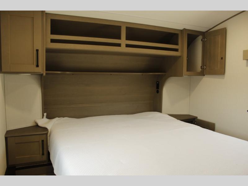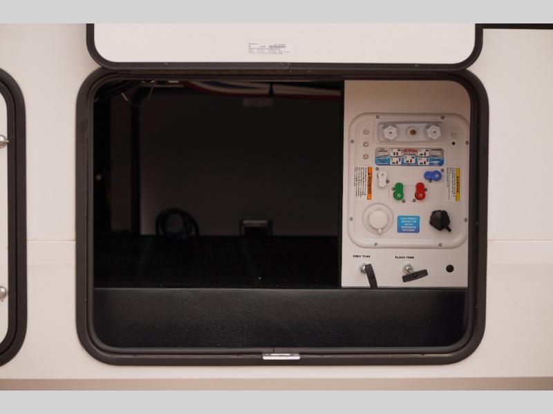 This rear kitchen fifth wheel is sure to meet all of your camping needs! Since the exterior length is only 26' 11", you can easily maneuver in and out of campgrounds. The rear kitchen includes ample counter space to prep meals, a three burner cooktop, and overhead storage for all your necessities. There is a 10 cu. ft. 12V refrigerator within the slide out that also includes the theater seating, and the U-shaped dinette provides a place to dine or play a card game. You will appreciate having convenient storage by the entry door, along with pull-out pet bowls, a functional wardrobe closet in the bedroom and an exterior pass-thru for belongings and camping gear. When you're ready to turn in for the night, the queen bed is sure to bring a great night's rest, while your guests sleep on the booth dinette or optional tri-fold sofa if you replace the theater seating!