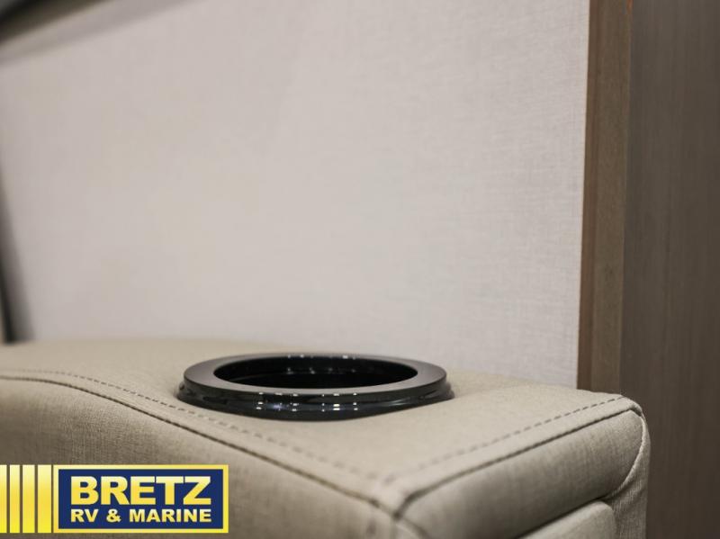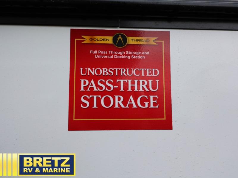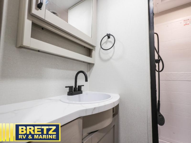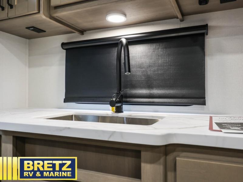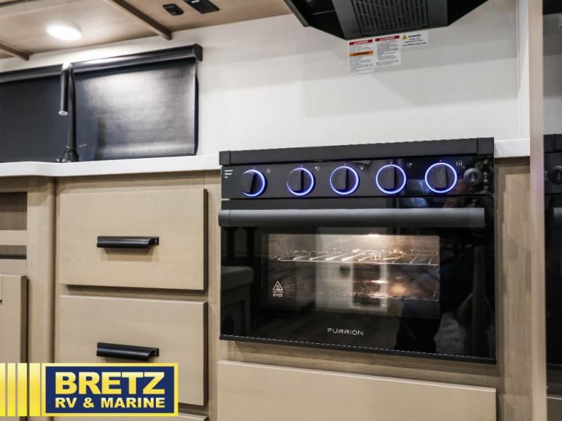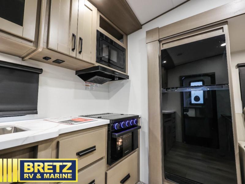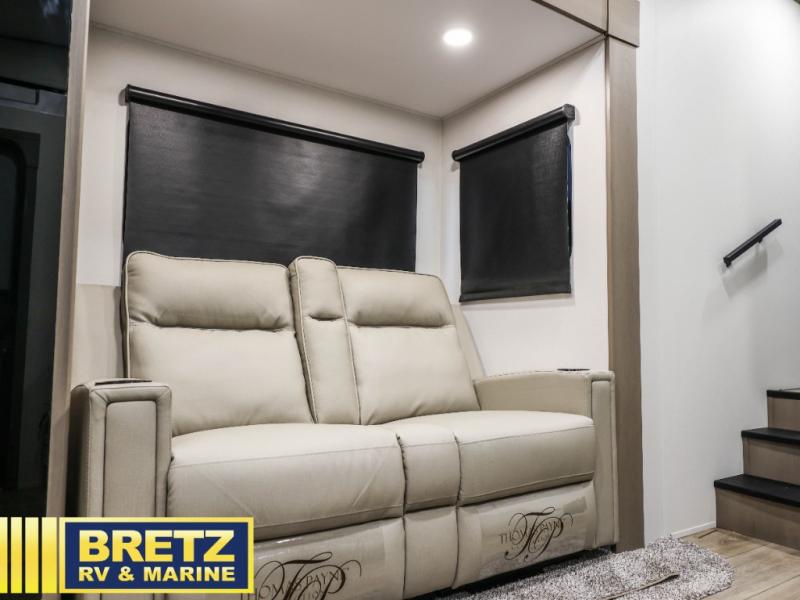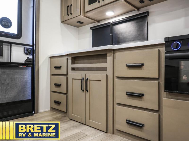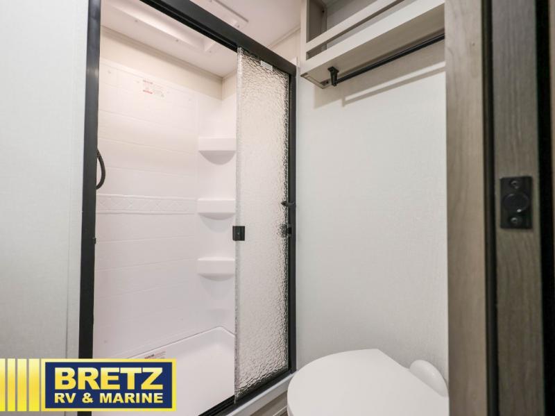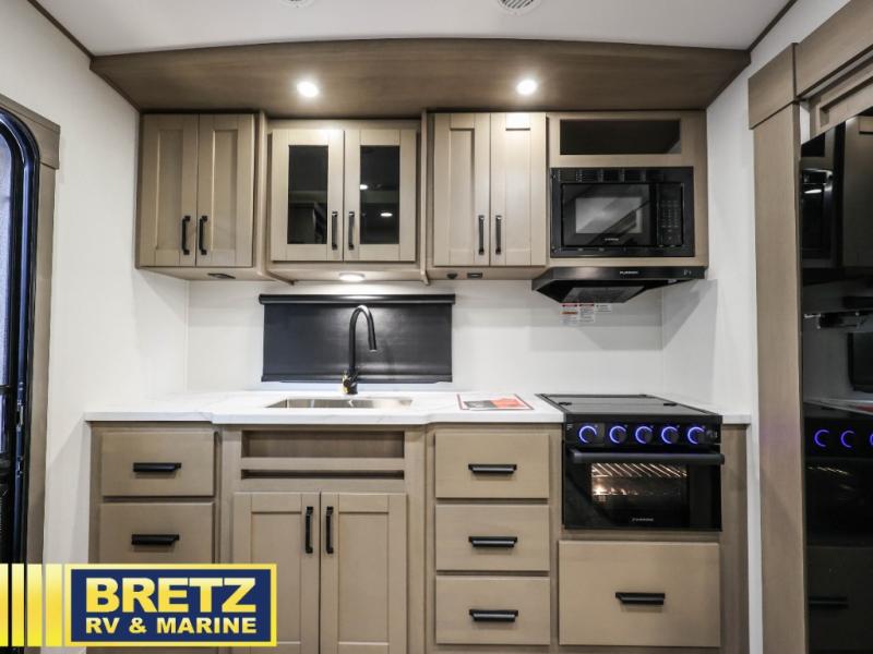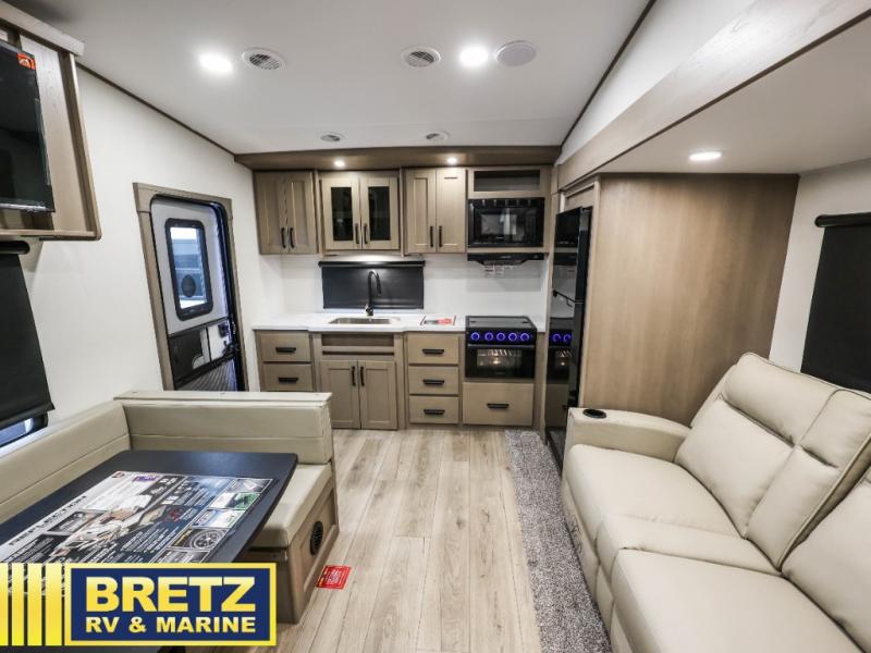 This rear kitchen fifth wheel is sure to meet all of your camping needs! Since the exterior length is only 26' 11", you can easily maneuver in and out of campgrounds. The rear kitchen includes ample counter space to prep meals, a three burner cooktop, and overhead storage for all your necessities. There is a 10 cu. ft. 12V refrigerator within the slide out that also includes the theater seating, and the U-shaped dinette provides a place to dine or play a card game. You will appreciate having convenient storage by the entry door, along with pull-out pet bowls, a functional wardrobe closet in the bedroom and an exterior pass-thru for belongings and camping gear. When you're ready to turn in for the night, the queen bed is sure to bring a great night's rest, while your guests sleep on the booth dinette or optional tri-fold sofa if you replace the theater seating!