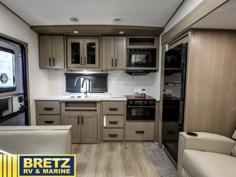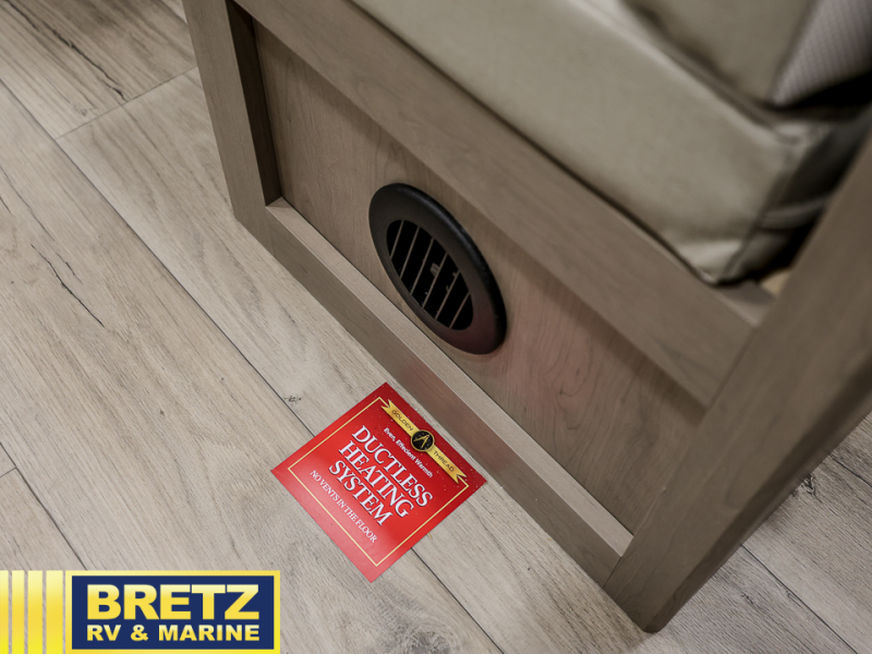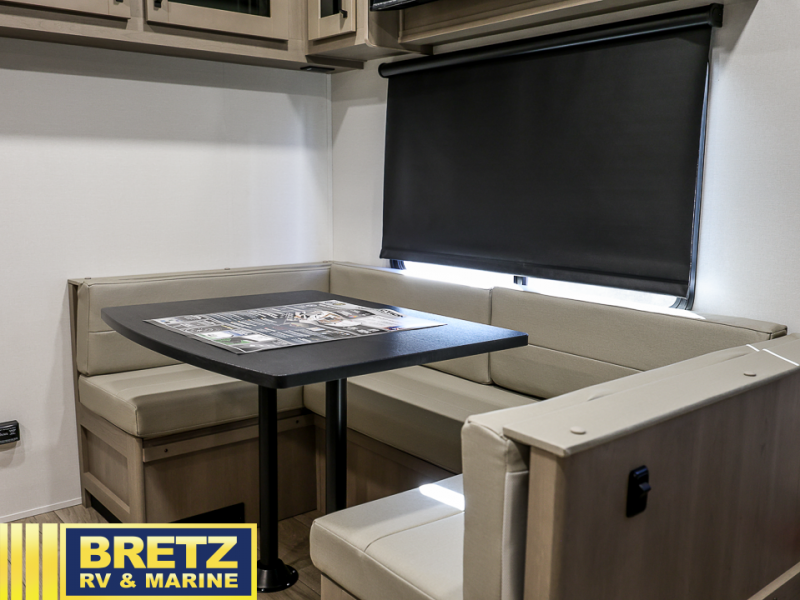 This rear kitchen fifth wheel is sure to meet all of your camping needs! Since the exterior length is only 26' 11", you can easily maneuver in and out of campgrounds. The rear kitchen includes ample counter space to prep meals, a three burner cooktop, and overhead storage for all your necessities. There is a 10 cu. ft. 12V refrigerator within the slide out that also includes the theater seating, and the U-shaped dinette provides a place to dine or play a card game. You will appreciate having convenient storage by the entry door, along with pull-out pet bowls, a functional wardrobe closet in the bedroom and an exterior pass-thru for belongings and camping gear. When you're ready to turn in for the night, the queen bed is sure to bring a great night's rest, while your guests sleep on the booth dinette or optional tri-fold sofa if you replace the theater seating!