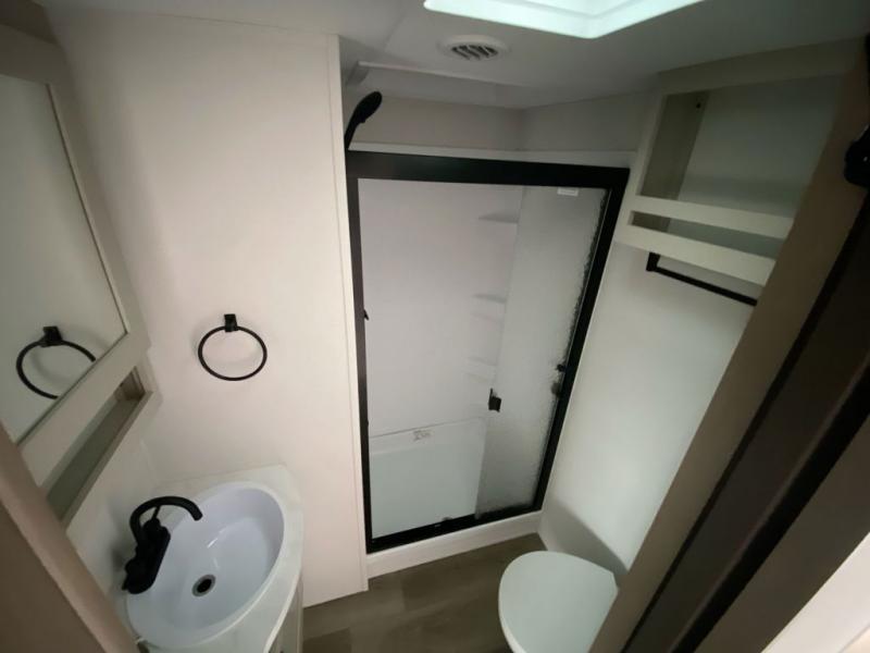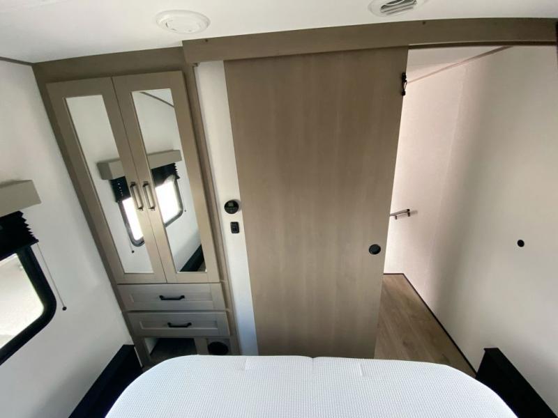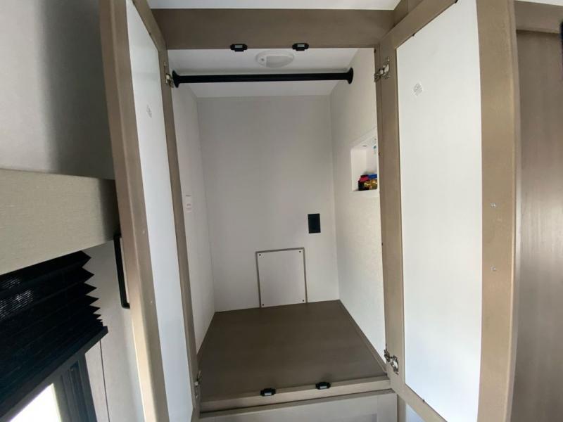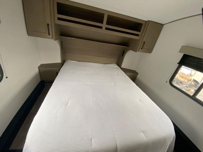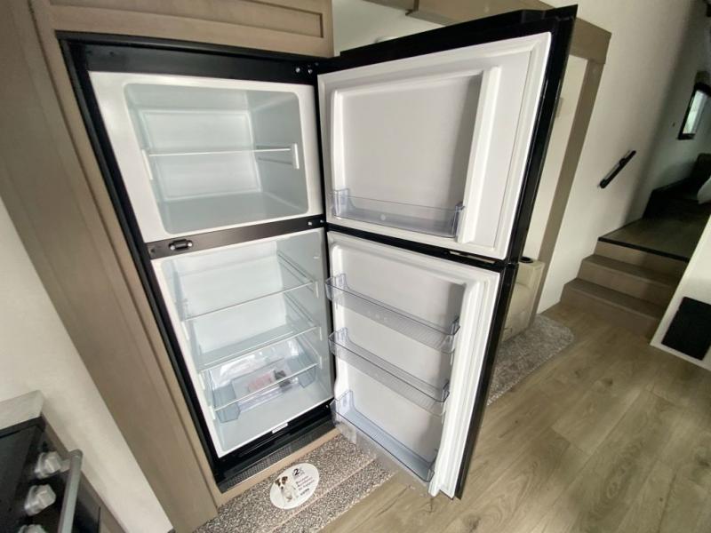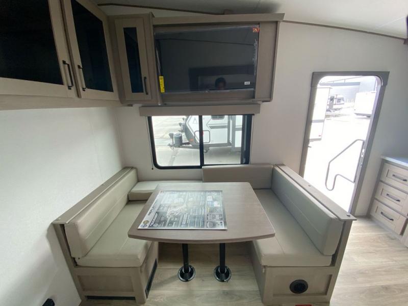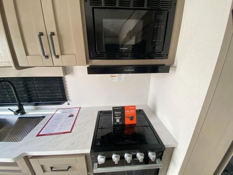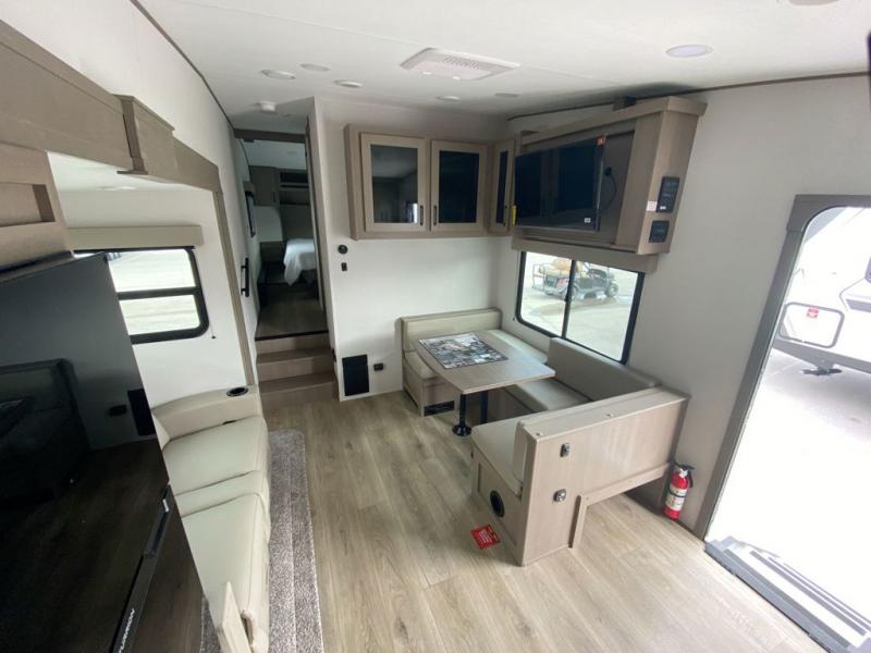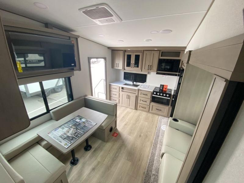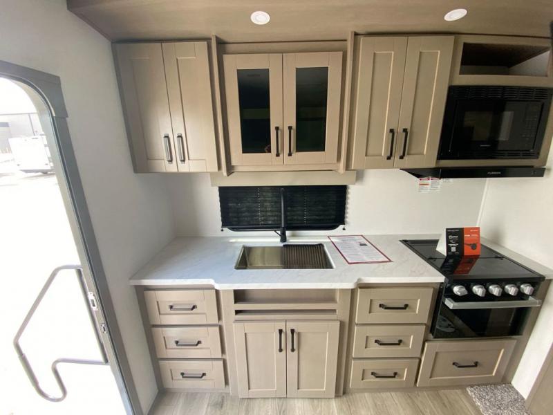 This rear kitchen fifth wheel is sure to meet all of your camping needs! Since the exterior length is only 26' 11", you can easily maneuver in and out of campgrounds. The rear kitchen includes ample counter space to prep meals, a three burner cooktop, and overhead storage for all your necessities. There is a 10 cu. ft. 12V refrigerator within the slide out that also includes the theater seating, and the U-shaped dinette provides a place to dine or play a card game. You will appreciate having convenient storage by the entry door, along with pull-out pet bowls, a functional wardrobe closet in the bedroom and an exterior pass-thru for belongings and camping gear. When you're ready to turn in for the night, the queen bed is sure to bring a great night's rest, while your guests sleep on the booth dinette or optional tri-fold sofa if you replace the theater seating!