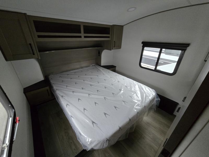 This rear kitchen fifth wheel is sure to meet all of your camping needs! Since the exterior length is only 26' 11", you can easily maneuver in and out of campgrounds. The rear kitchen includes ample counter space to prep meals, a three burner cooktop, and overhead storage for all your necessities. There is a 10 cu. ft. 12V refrigerator within the slide out that also includes the theater seating, and the U-shaped dinette provides a place to dine or play a card game. You will appreciate having convenient storage by the entry door, along with pull-out pet bowls, a functional wardrobe closet in the bedroom and an exterior pass-thru for belongings and camping gear. When you're ready to turn in for the night, the queen bed is sure to bring a great night's rest, while your guests sleep on the booth dinette or optional tri-fold sofa if you replace the theater seating!