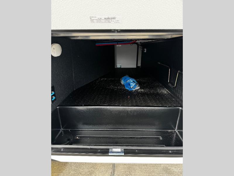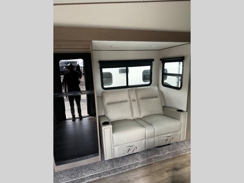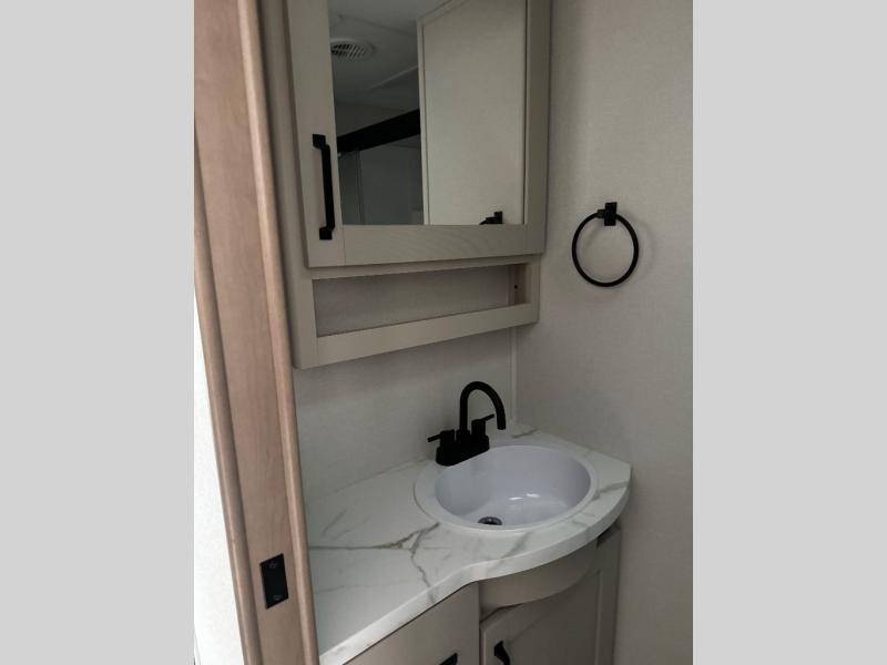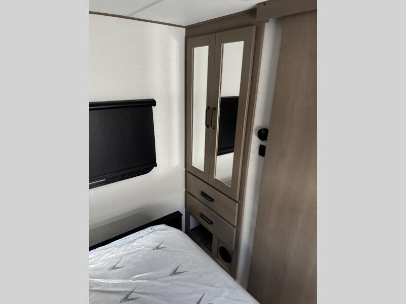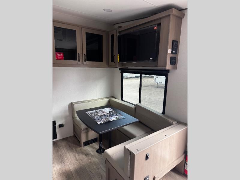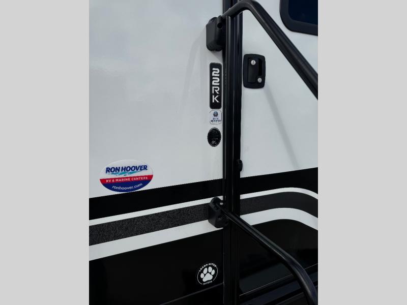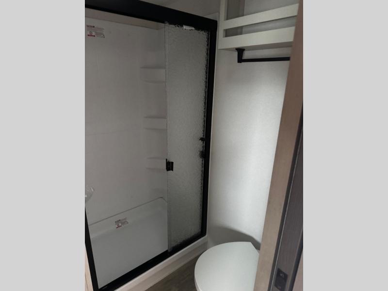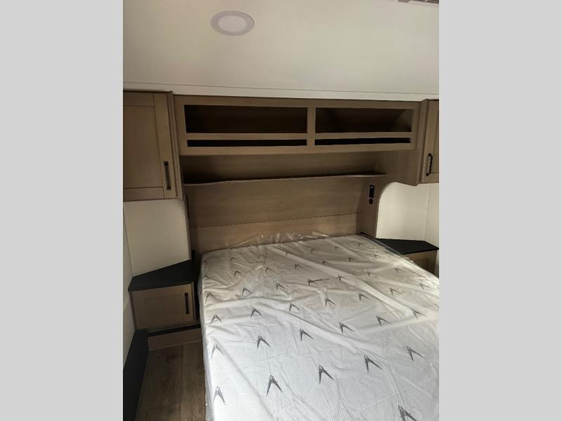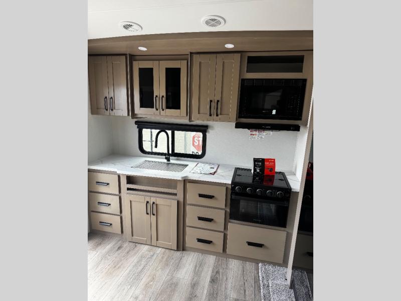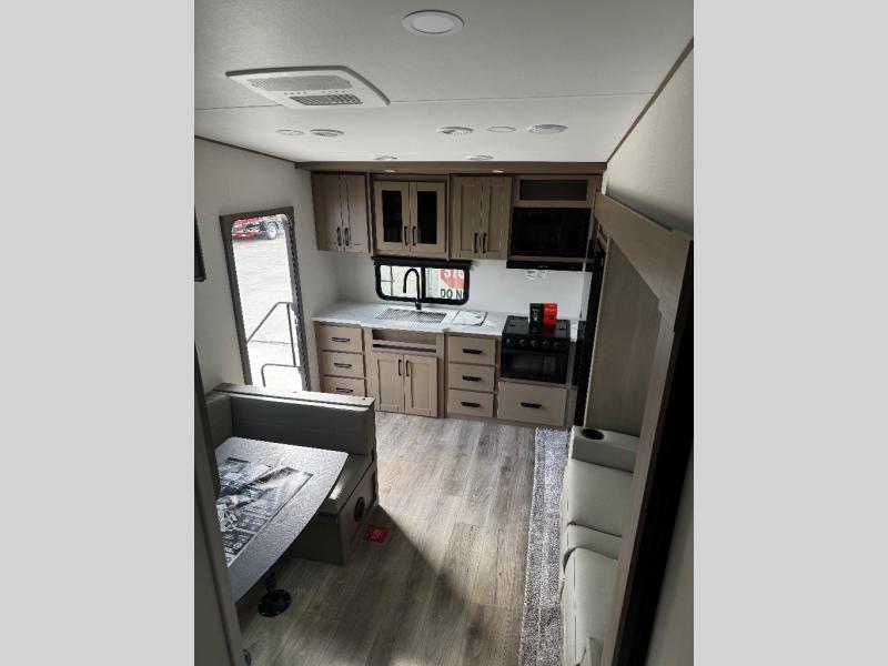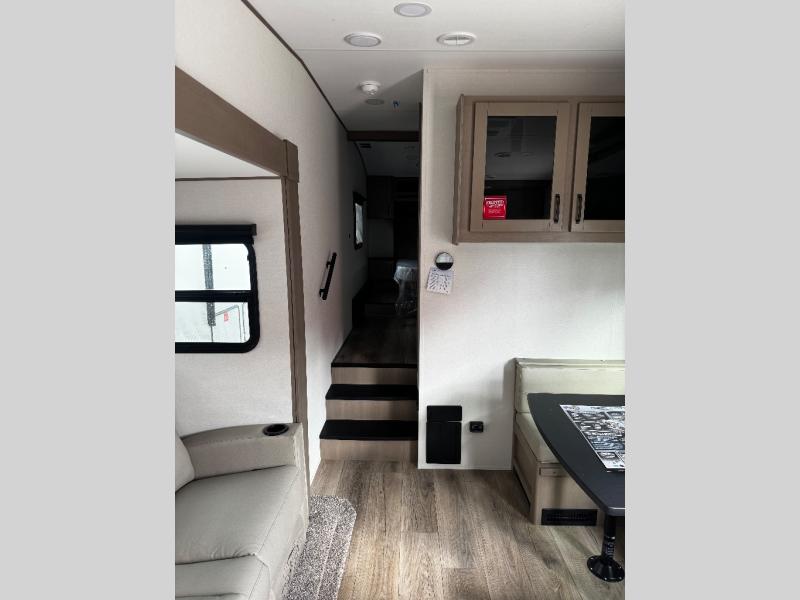 This rear kitchen fifth wheel is sure to meet all of your camping needs! Since the exterior length is only 26' 11", you can easily maneuver in and out of campgrounds. The rear kitchen includes ample counter space to prep meals, a three burner cooktop, and overhead storage for all your necessities. There is a 10 cu. ft. 12V refrigerator within the slide out that also includes the theater seating, and the U-shaped dinette provides a place to dine or play a card game. You will appreciate having convenient storage by the entry door, along with pull-out pet bowls, a functional wardrobe closet in the bedroom and an exterior pass-thru for belongings and camping gear. When you're ready to turn in for the night, the queen bed is sure to bring a great night's rest, while your guests sleep on the booth dinette or optional tri-fold sofa if you replace the theater seating!