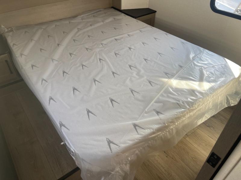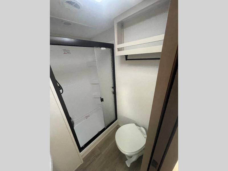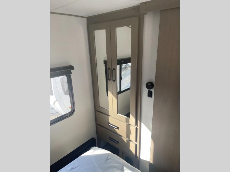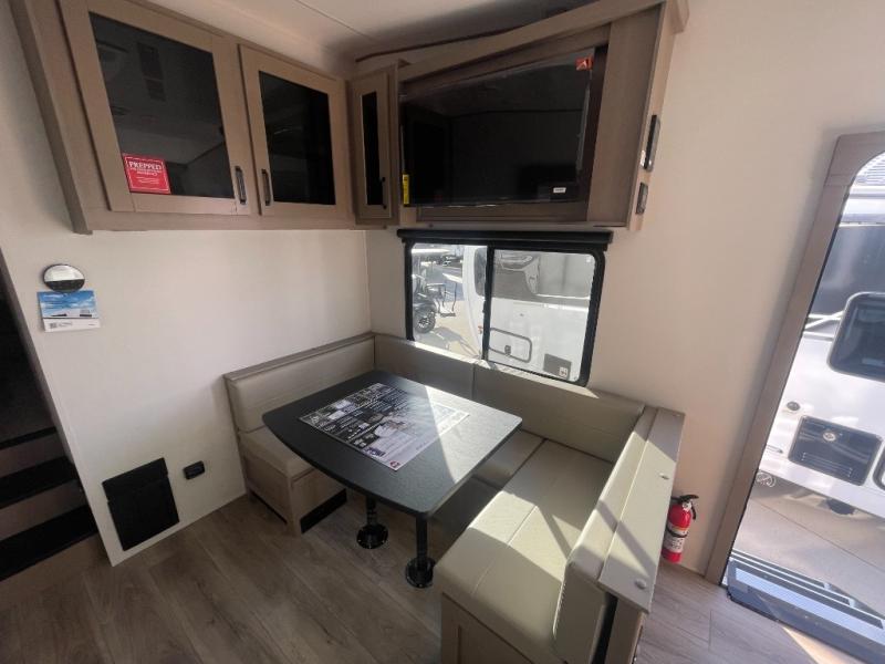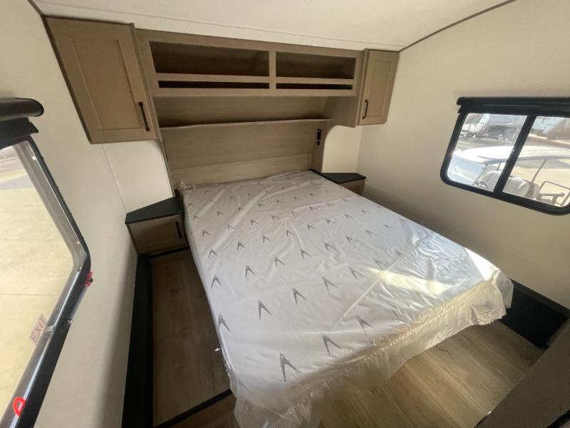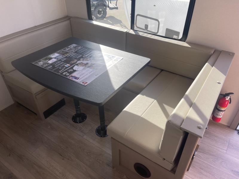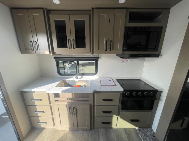 This rear kitchen fifth wheel is sure to meet all of your camping needs! Since the exterior length is only 26' 11", you can easily maneuver in and out of campgrounds. The rear kitchen includes ample counter space to prep meals, a three burner cooktop, and overhead storage for all your necessities. There is a 10 cu. ft. 12V refrigerator within the slide out that also includes the theater seating, and the U-shaped dinette provides a place to dine or play a card game. You will appreciate having convenient storage by the entry door, along with pull-out pet bowls, a functional wardrobe closet in the bedroom and an exterior pass-thru for belongings and camping gear. When you're ready to turn in for the night, the queen bed is sure to bring a great night's rest, while your guests sleep on the booth dinette or optional tri-fold sofa if you replace the theater seating!