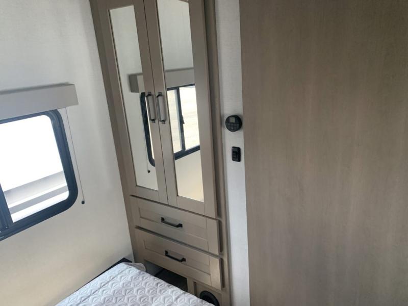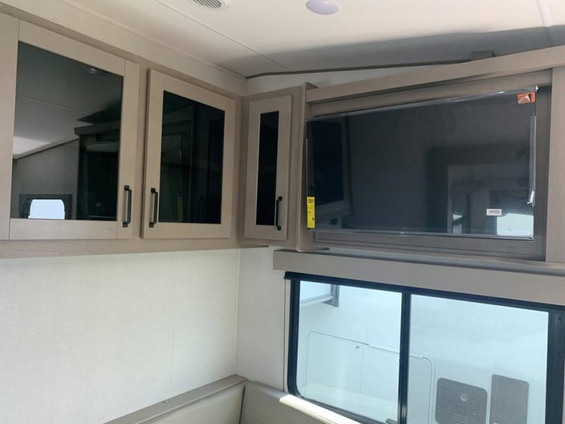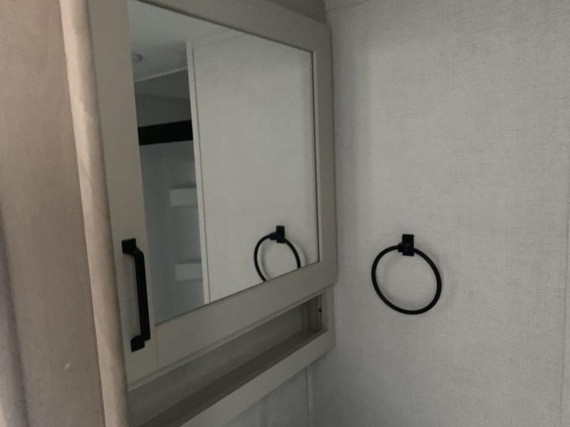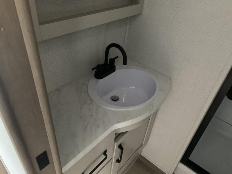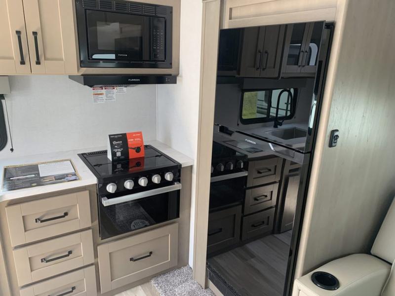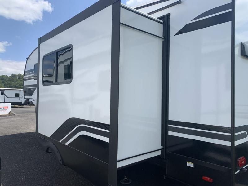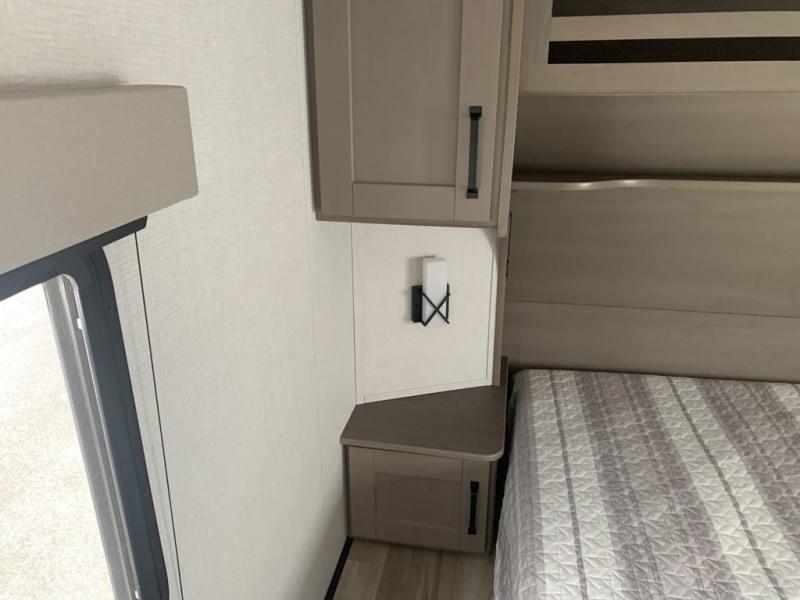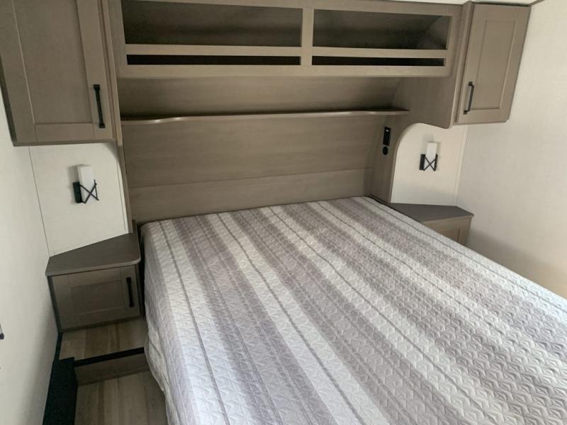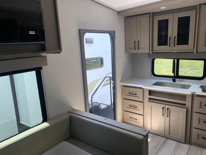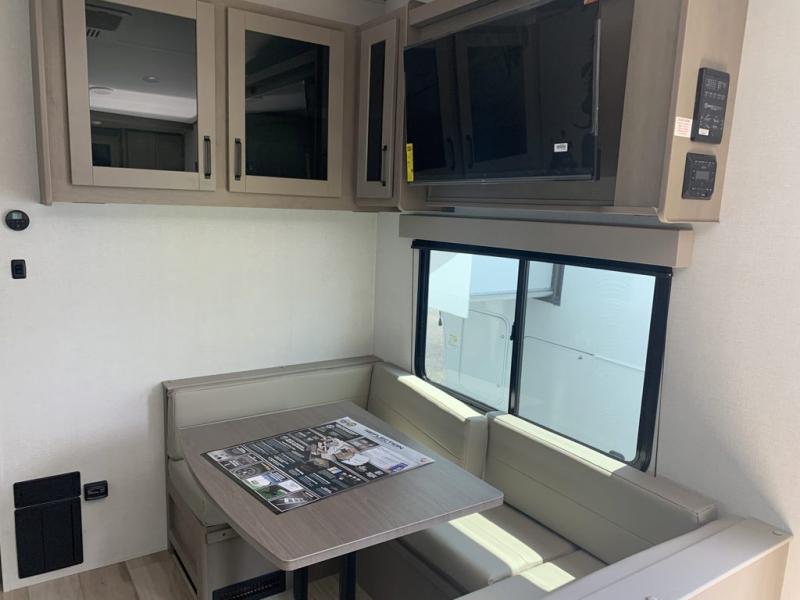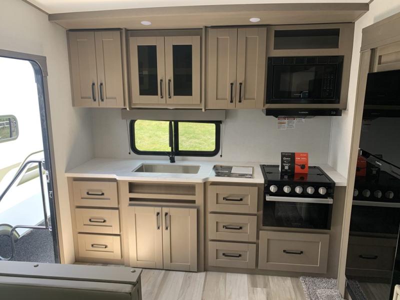 This rear kitchen fifth wheel is sure to meet all of your camping needs! Since the exterior length is only 26' 11", you can easily maneuver in and out of campgrounds. The rear kitchen includes ample counter space to prep meals, a three burner cooktop, and overhead storage for all your necessities. There is a 10 cu. ft. 12V refrigerator within the slide out that also includes the theater seating, and the U-shaped dinette provides a place to dine or play a card game. You will appreciate having convenient storage by the entry door, along with pull-out pet bowls, a functional wardrobe closet in the bedroom and an exterior pass-thru for belongings and camping gear. When you're ready to turn in for the night, the queen bed is sure to bring a great night's rest, while your guests sleep on the booth dinette or optional tri-fold sofa if you replace the theater seating!