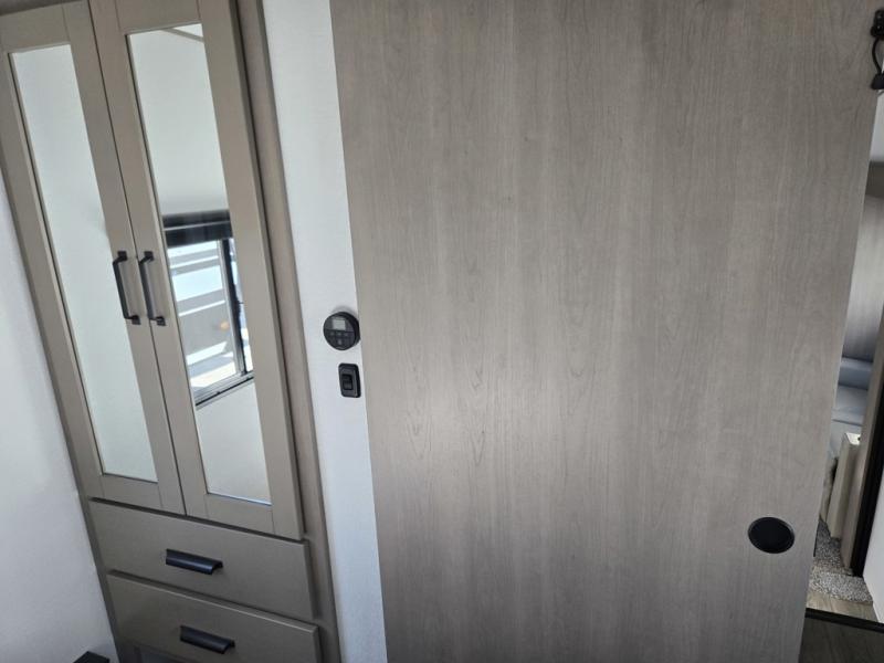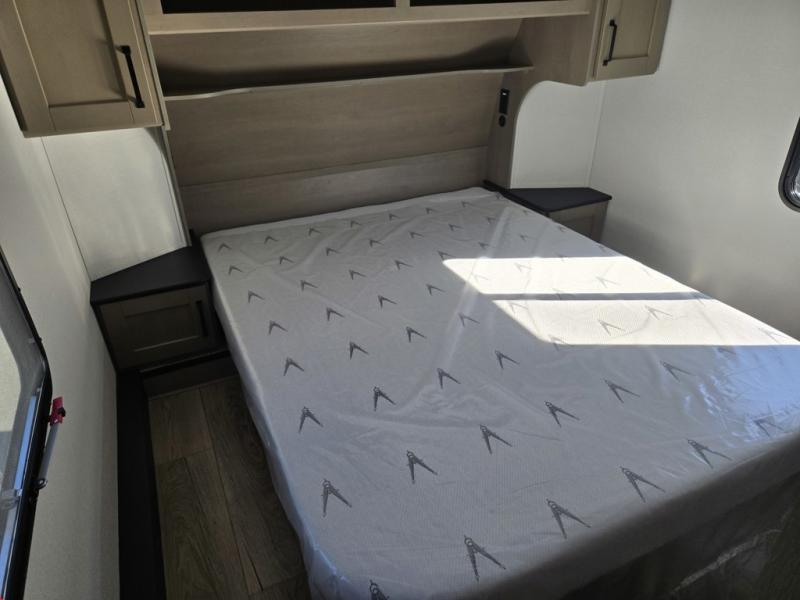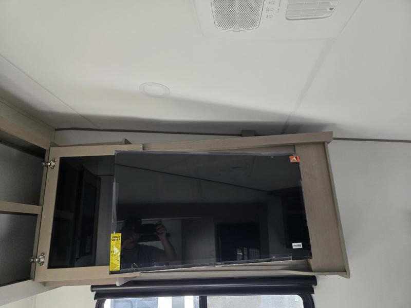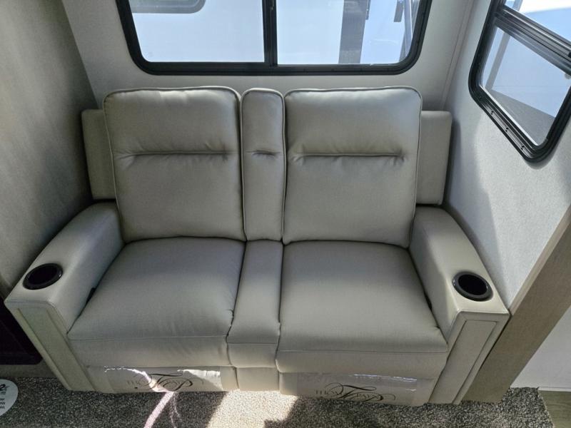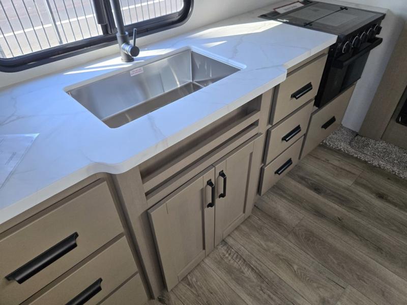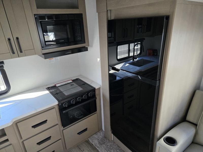 This rear kitchen fifth wheel is sure to meet all of your camping needs! Since the exterior length is only 26' 11", you can easily maneuver in and out of campgrounds. The rear kitchen includes ample counter space to prep meals, a three burner cooktop, and overhead storage for all your necessities. There is a 10 cu. ft. 12V refrigerator within the slide out that also includes the theater seating, and the U-shaped dinette provides a place to dine or play a card game. You will appreciate having convenient storage by the entry door, along with pull-out pet bowls, a functional wardrobe closet in the bedroom and an exterior pass-thru for belongings and camping gear. When you're ready to turn in for the night, the queen bed is sure to bring a great night's rest, while your guests sleep on the booth dinette or optional tri-fold sofa if you replace the theater seating!