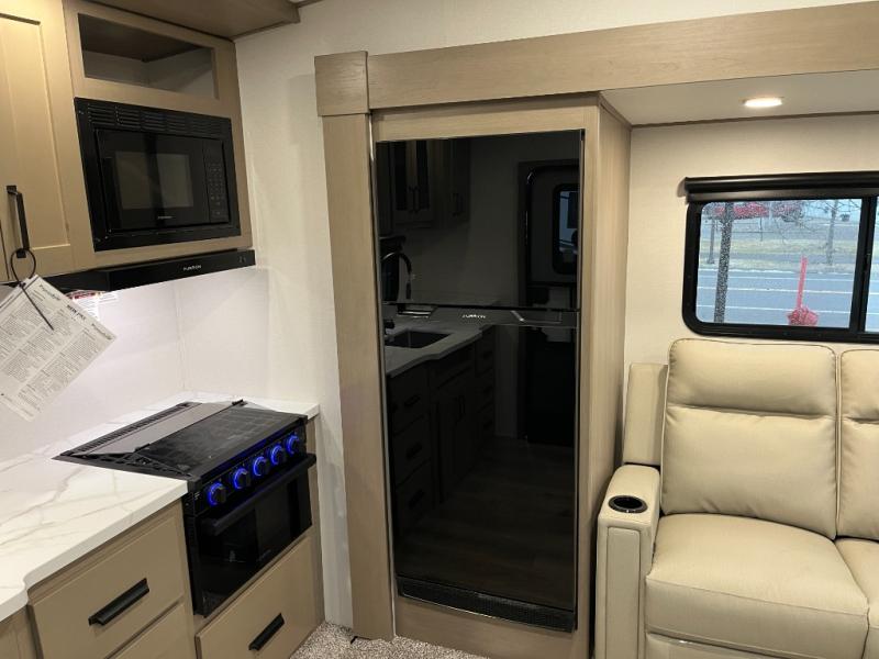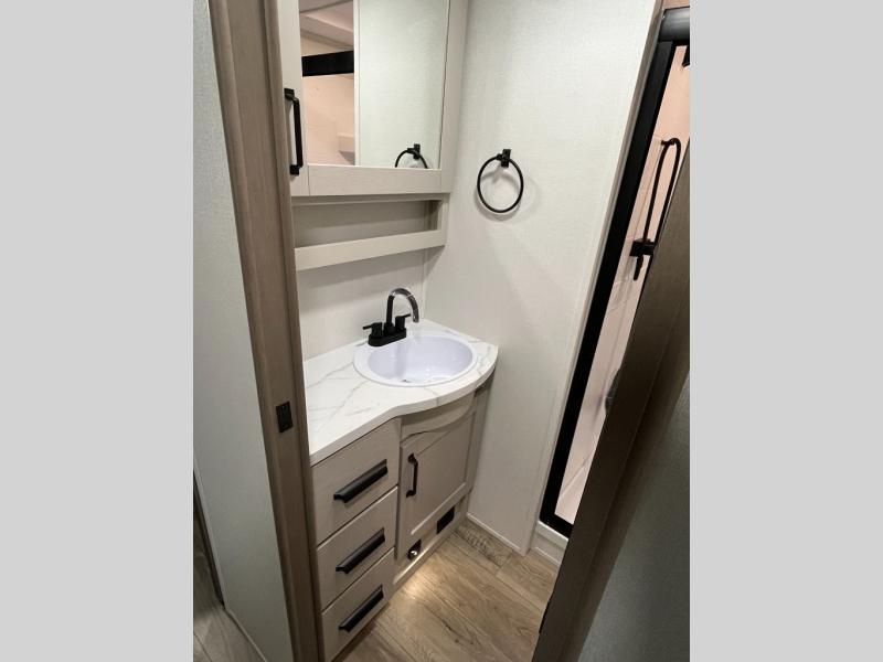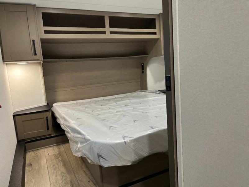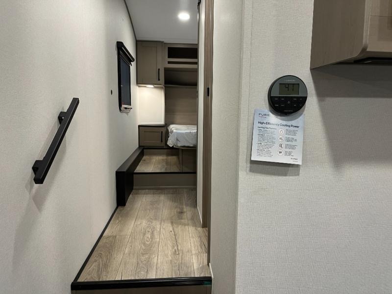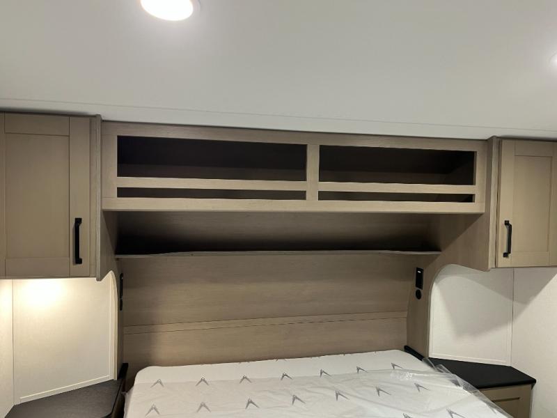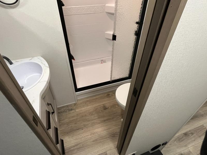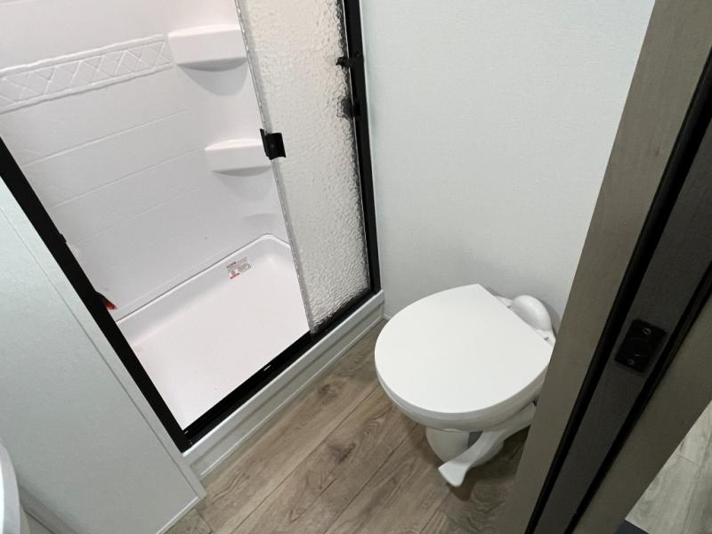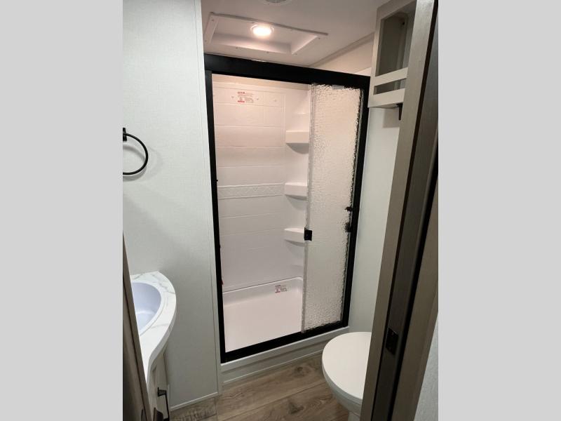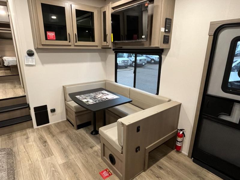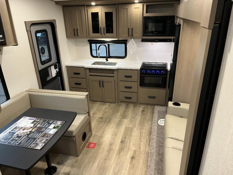 This rear kitchen fifth wheel is sure to meet all of your camping needs! Since the exterior length is only 26' 11", you can easily maneuver in and out of campgrounds. The rear kitchen includes ample counter space to prep meals, a three burner cooktop, and overhead storage for all your necessities. There is a 10 cu. ft. 12V refrigerator within the slide out that also includes the theater seating, and the U-shaped dinette provides a place to dine or play a card game. You will appreciate having convenient storage by the entry door, along with pull-out pet bowls, a functional wardrobe closet in the bedroom and an exterior pass-thru for belongings and camping gear. When you're ready to turn in for the night, the queen bed is sure to bring a great night's rest, while your guests sleep on the booth dinette or optional tri-fold sofa if you replace the theater seating!