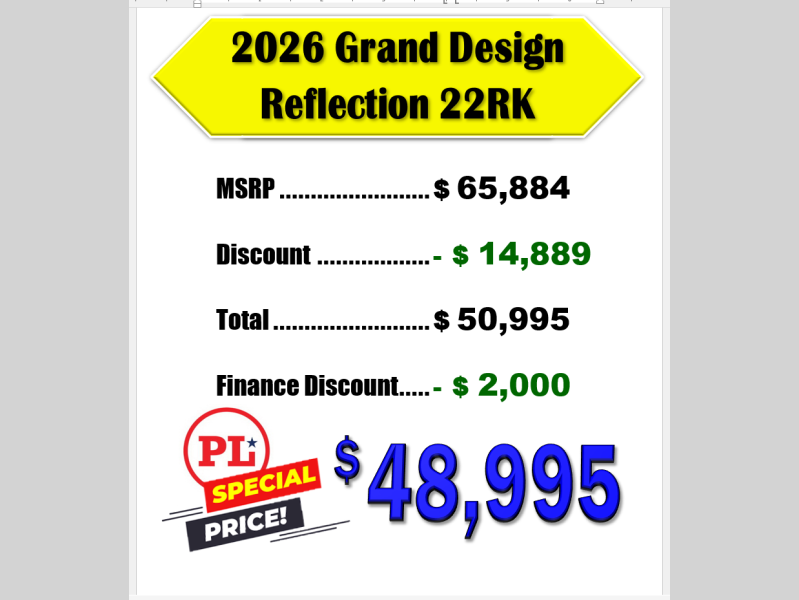 New 2026 Grand Design Reflection 100 Series 22RK Fifth Wheel