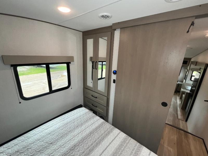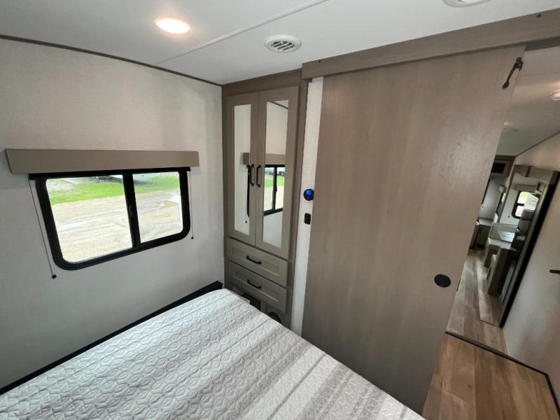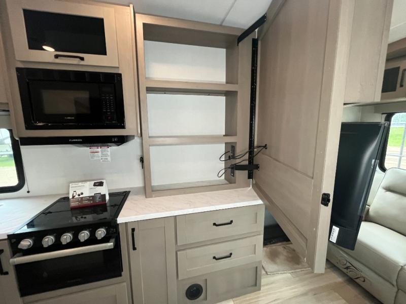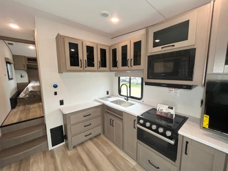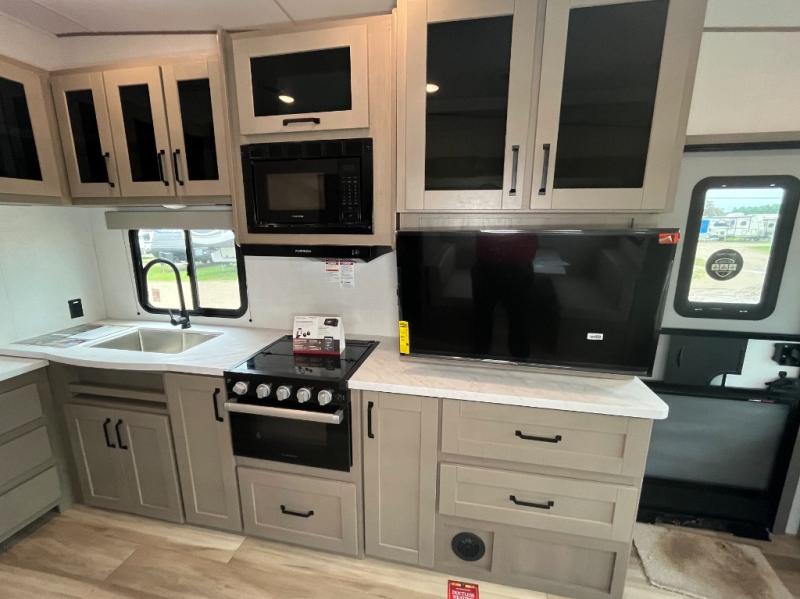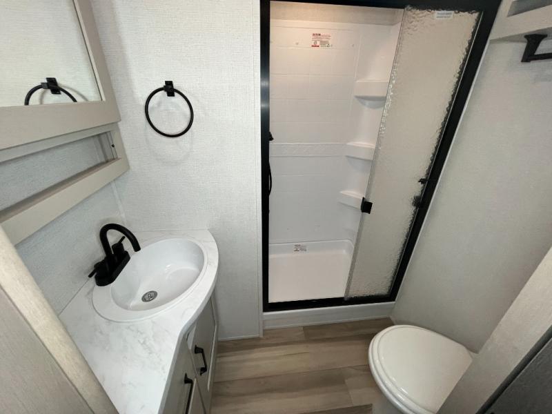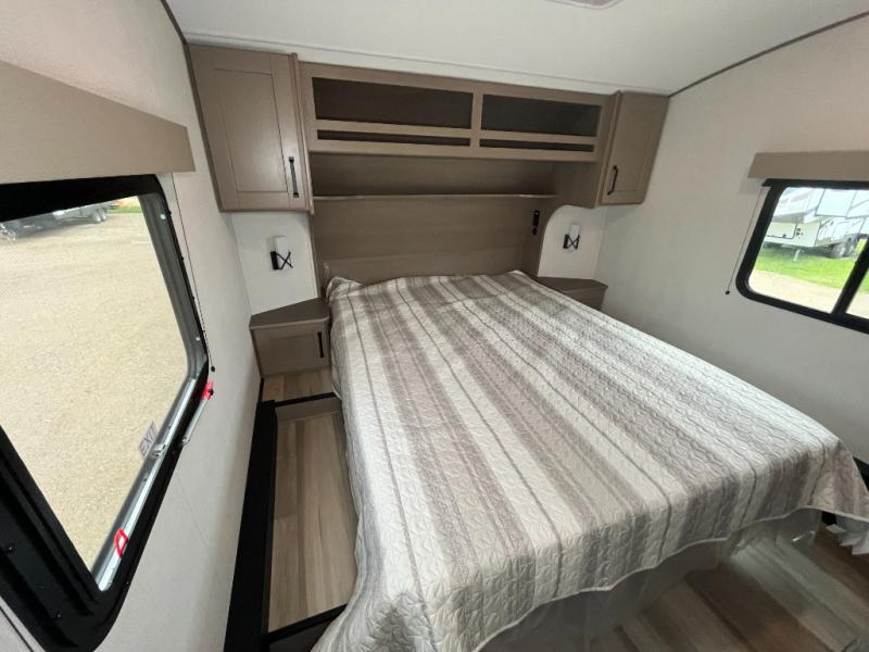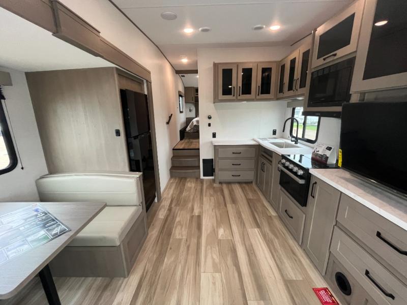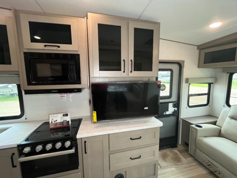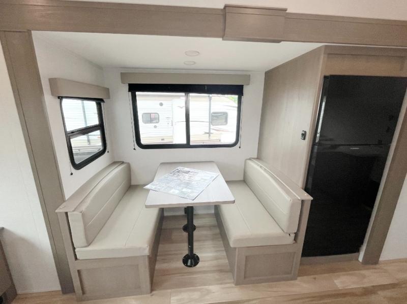 This is the perfect couple's trailer with a space for an overnight guest or two little ones on the booth dinette. You can switch out this dinette for an optional swivel dinette as well, and the standard theater seating can be replaced by an optional trundle bed if you need more sleeping space. A 40" HDTV will keep you entertained when the weather isn't cooperating, and you can whip up your best meals in the full kitchen. And a 19' power awning will provide shade if you choose to take your plate outdoors! The spacious full bath will let you clean up each day, and you'll feel right at home in the front private bedroom with a queen bed!