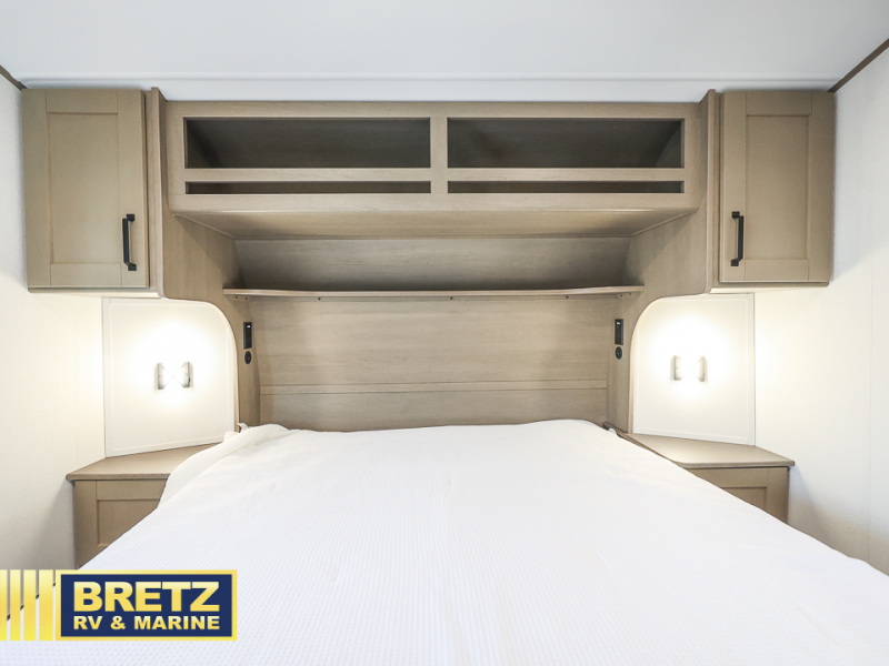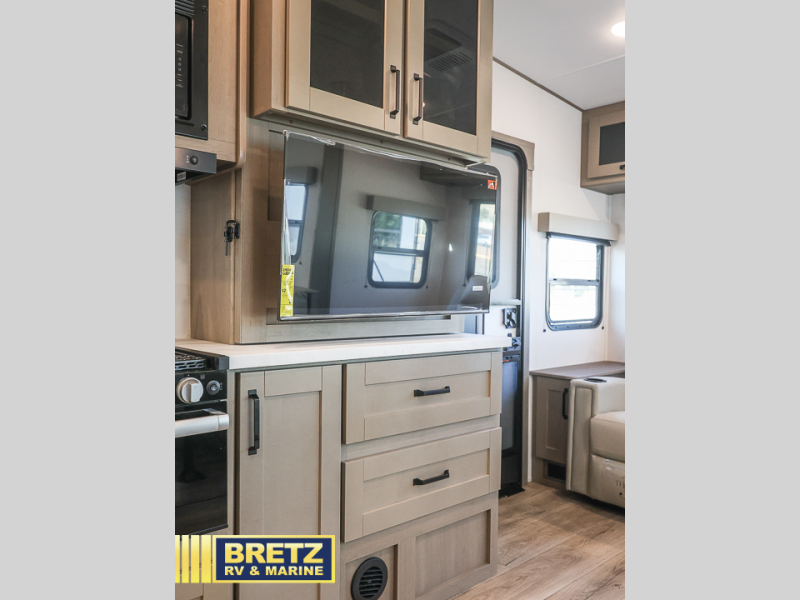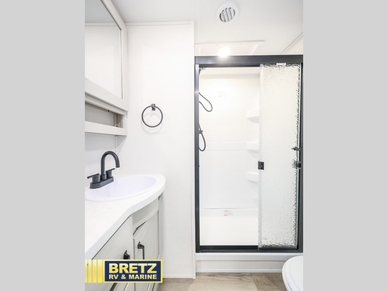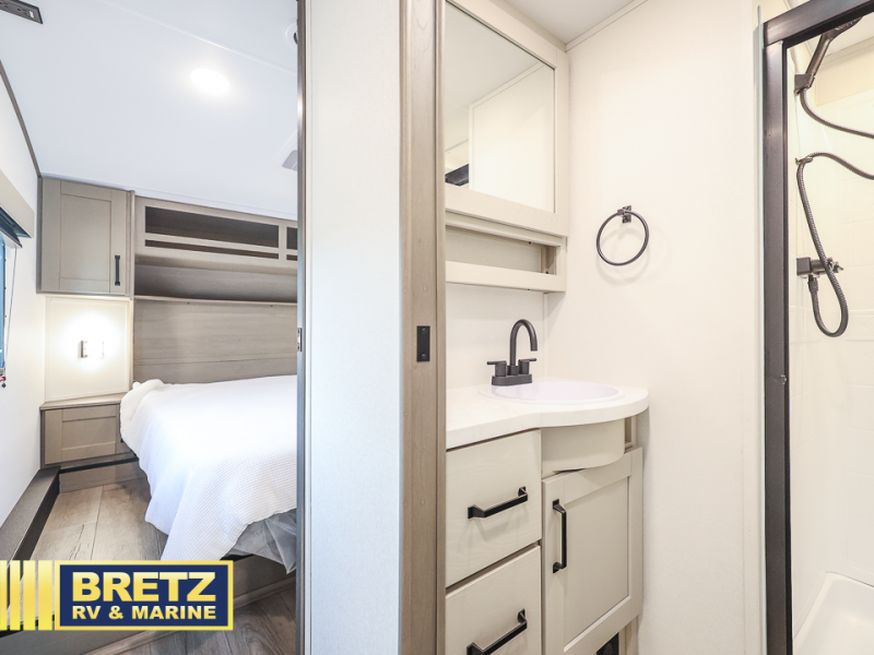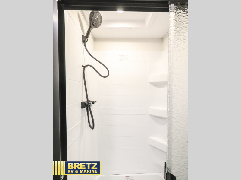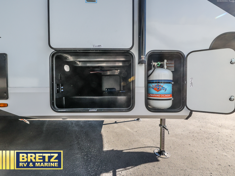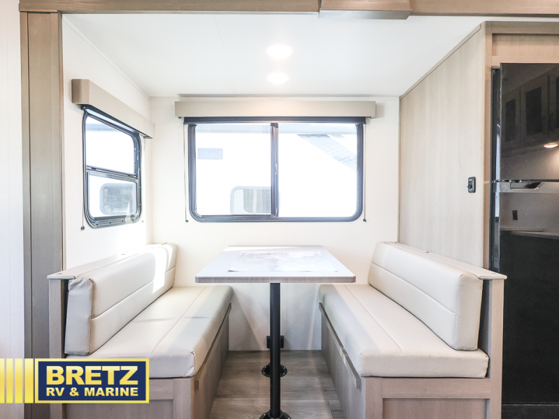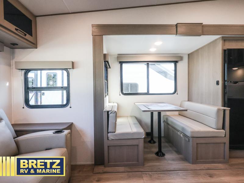 This is the perfect couple's trailer with a space for an overnight guest or two little ones on the booth dinette. You can switch out this dinette for an optional swivel dinette as well, and the standard theater seating can be replaced by an optional trundle bed if you need more sleeping space. A 40" HDTV will keep you entertained when the weather isn't cooperating, and you can whip up your best meals in the full kitchen. And a 19' power awning will provide shade if you choose to take your plate outdoors! The spacious full bath will let you clean up each day, and you'll feel right at home in the front private bedroom with a queen bed!