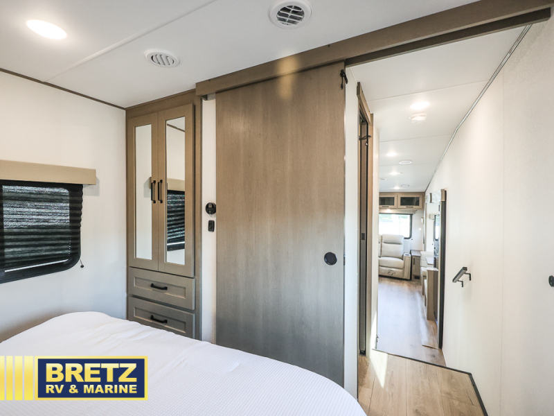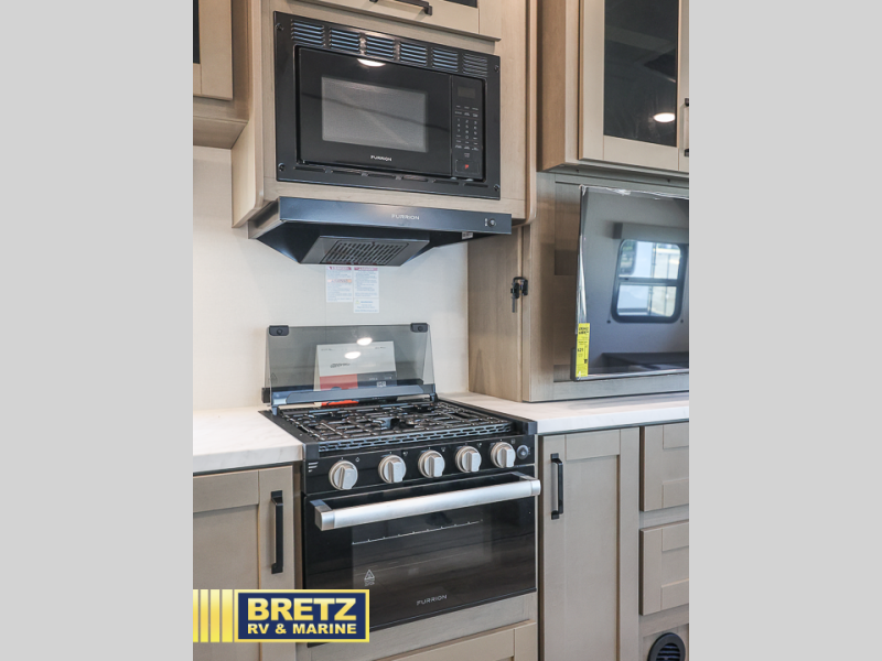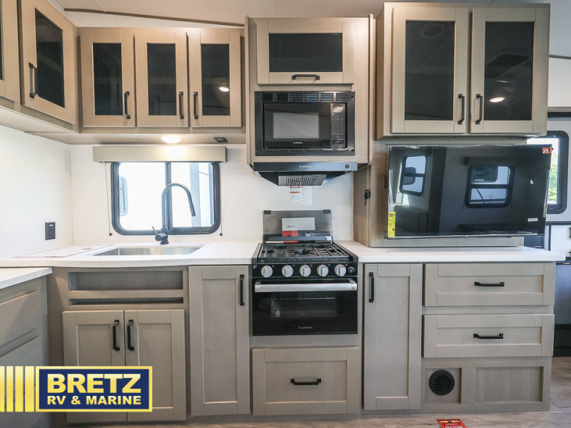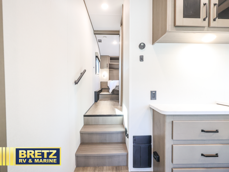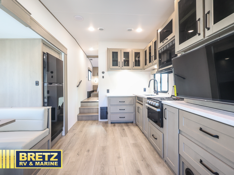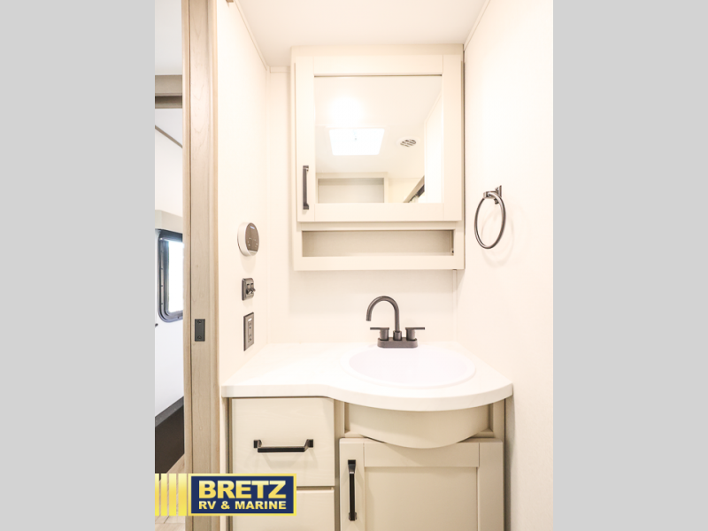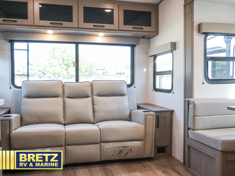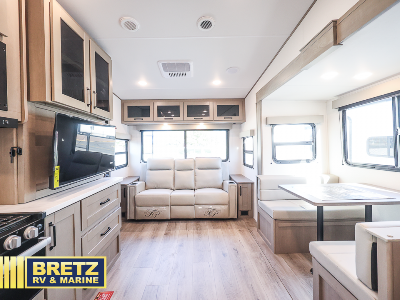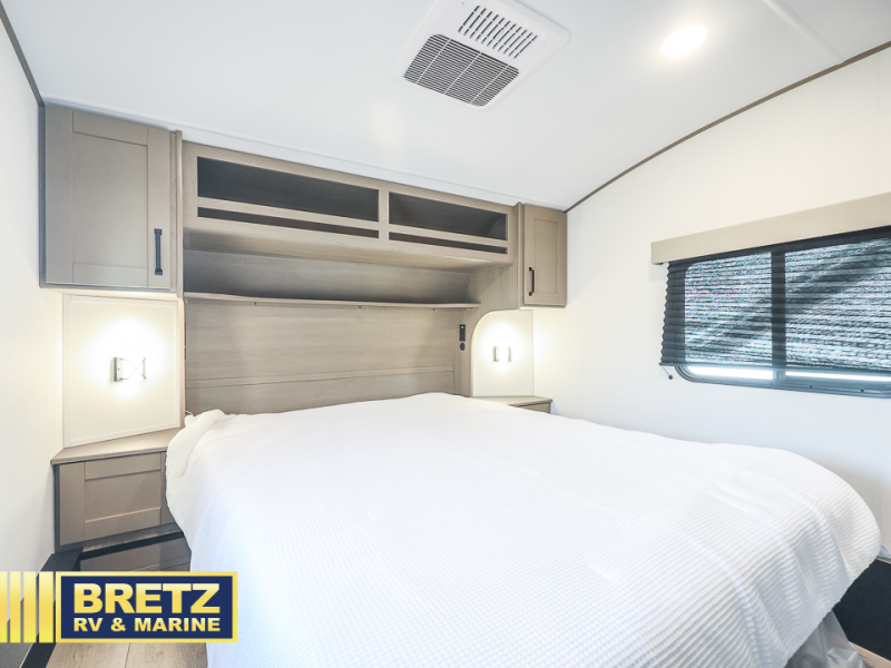 This is the perfect couple's trailer with a space for an overnight guest or two little ones on the booth dinette. You can switch out this dinette for an optional swivel dinette as well, and the standard theater seating can be replaced by an optional trundle bed if you need more sleeping space. A 40" HDTV will keep you entertained when the weather isn't cooperating, and you can whip up your best meals in the full kitchen. And a 19' power awning will provide shade if you choose to take your plate outdoors! The spacious full bath will let you clean up each day, and you'll feel right at home in the front private bedroom with a queen bed!