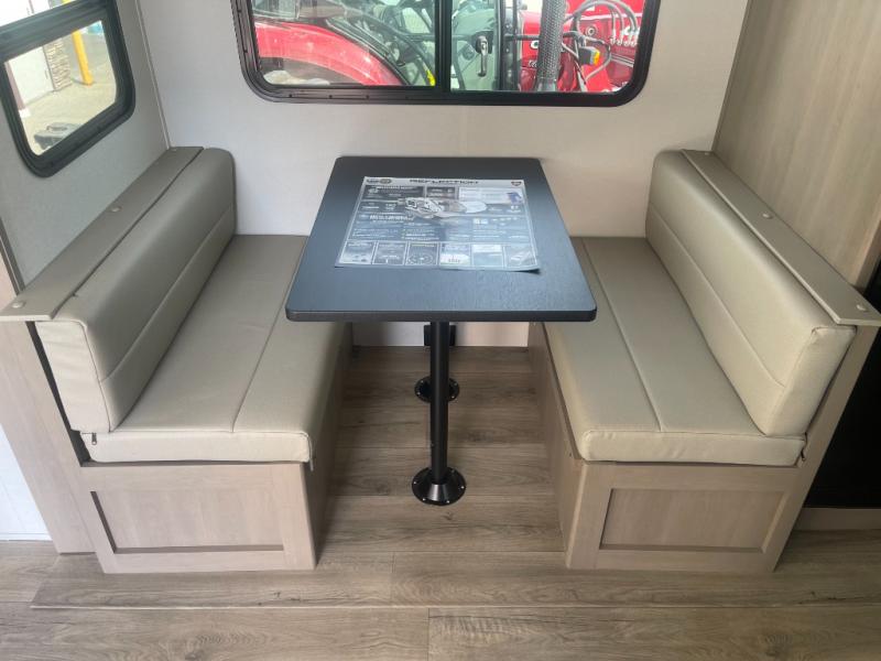 This is the perfect couple's trailer with a space for an overnight guest or two little ones on the booth dinette. You can switch out this dinette for an optional swivel dinette as well, and the standard theater seating can be replaced by an optional trundle bed if you need more sleeping space. A 40" HDTV will keep you entertained when the weather isn't cooperating, and you can whip up your best meals in the full kitchen. And a 19' power awning will provide shade if you choose to take your plate outdoors! The spacious full bath will let you clean up each day, and you'll feel right at home in the front private bedroom with a queen bed!