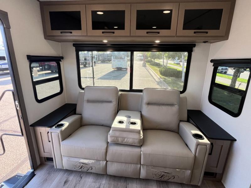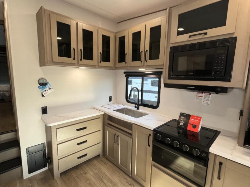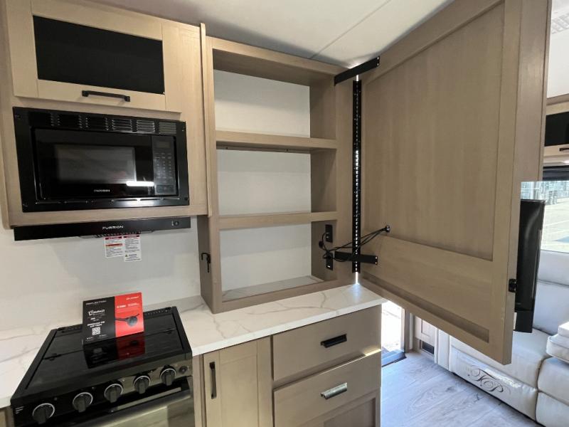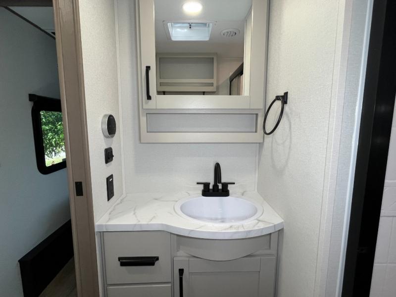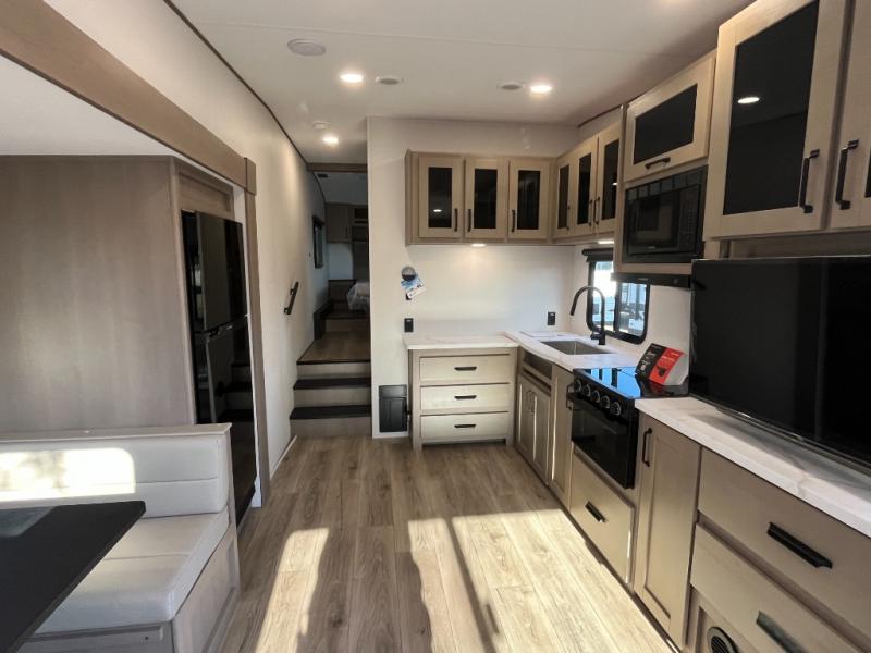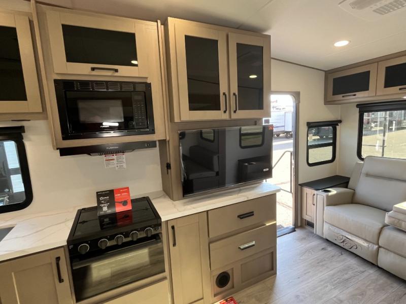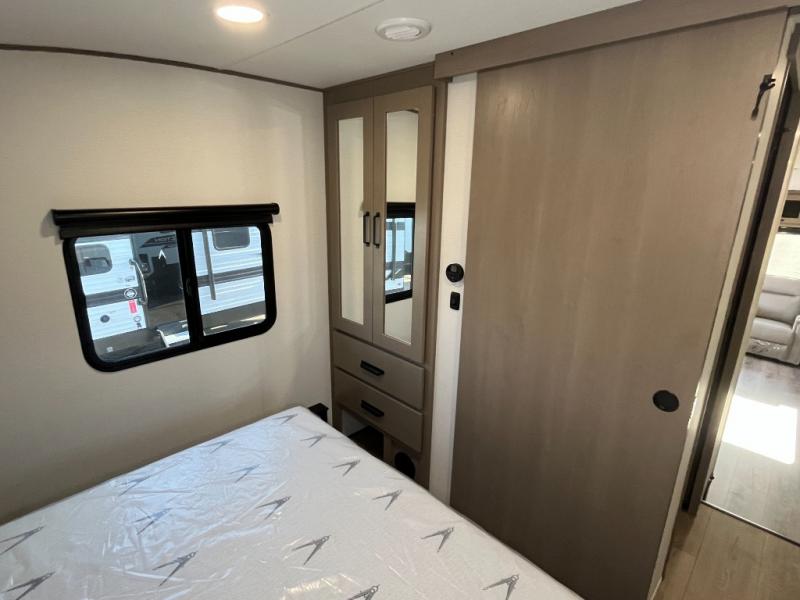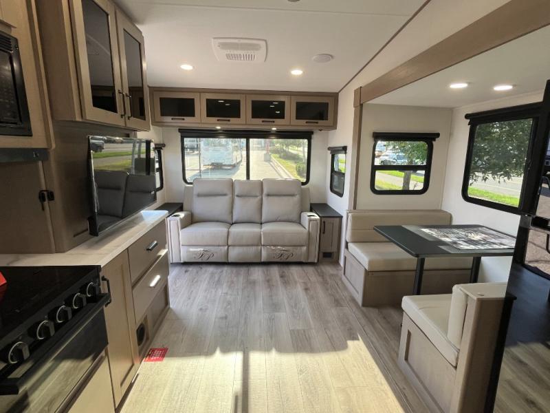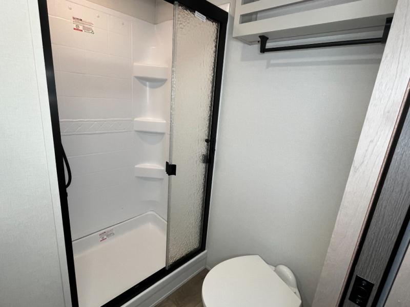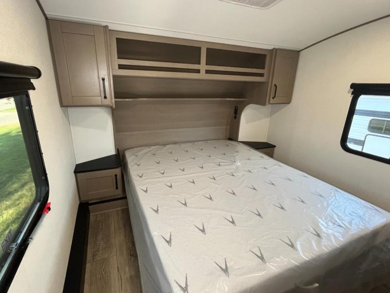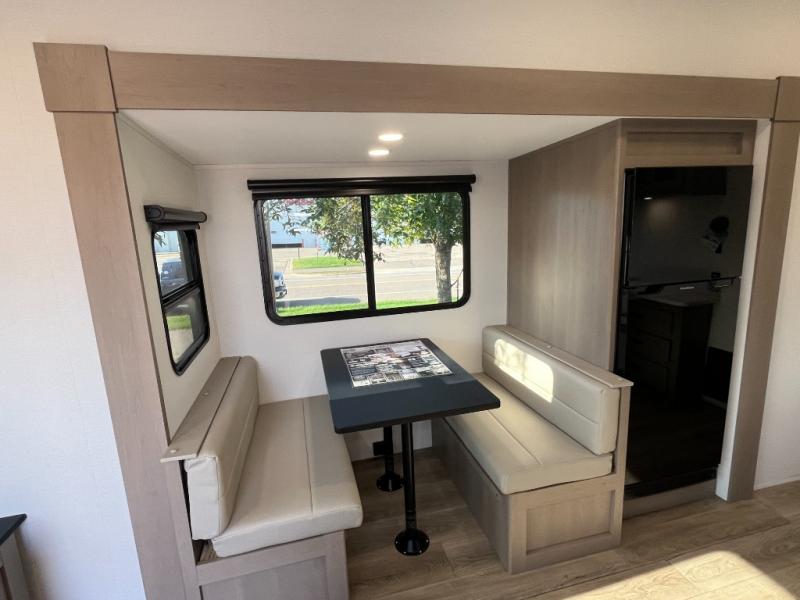 This is the perfect couple's trailer with a space for an overnight guest or two little ones on the booth dinette. You can switch out this dinette for an optional swivel dinette as well, and the standard theater seating can be replaced by an optional trundle bed if you need more sleeping space. A 40" HDTV will keep you entertained when the weather isn't cooperating, and you can whip up your best meals in the full kitchen. And a 19' power awning will provide shade if you choose to take your plate outdoors! The spacious full bath will let you clean up each day, and you'll feel right at home in the front private bedroom with a queen bed!