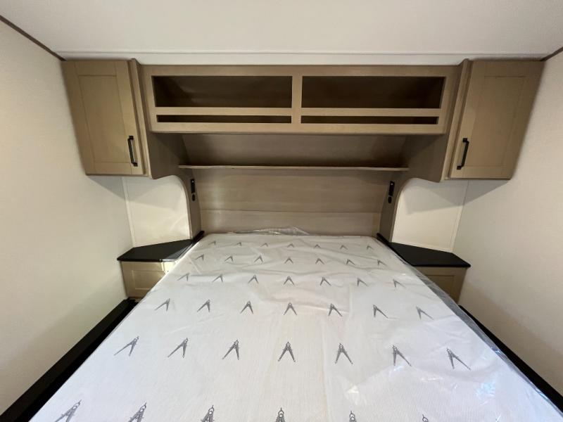 This is the perfect couple's trailer with a space for an overnight guest or two little ones on the booth dinette. You can switch out this dinette for an optional swivel dinette as well, and the standard theater seating can be replaced by an optional trundle bed if you need more sleeping space. A 40" HDTV will keep you entertained when the weather isn't cooperating, and you can whip up your best meals in the full kitchen. And a 19' power awning will provide shade if you choose to take your plate outdoors! The spacious full bath will let you clean up each day, and you'll feel right at home in the front private bedroom with a queen bed!