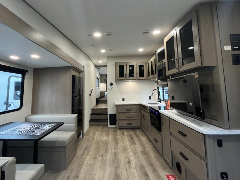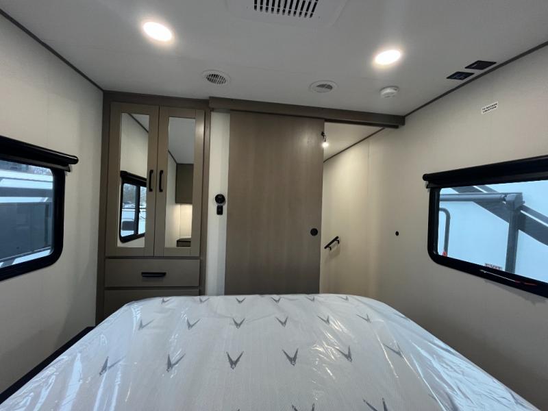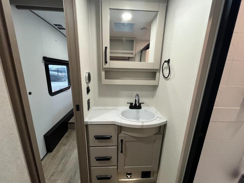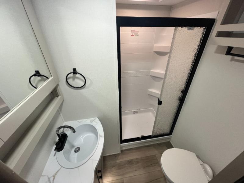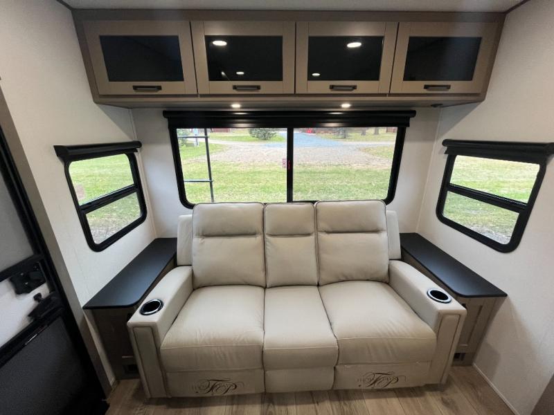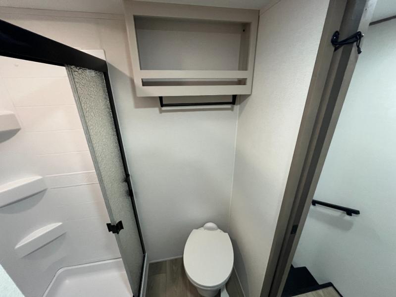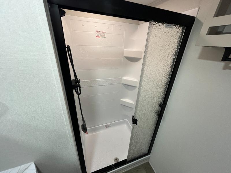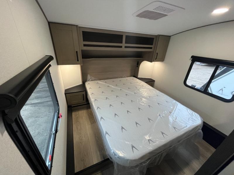 This is the perfect couple's trailer with a space for an overnight guest or two little ones on the booth dinette. You can switch out this dinette for an optional swivel dinette as well, and the standard theater seating can be replaced by an optional trundle bed if you need more sleeping space. A 40" HDTV will keep you entertained when the weather isn't cooperating, and you can whip up your best meals in the full kitchen. And a 19' power awning will provide shade if you choose to take your plate outdoors! The spacious full bath will let you clean up each day, and you'll feel right at home in the front private bedroom with a queen bed!