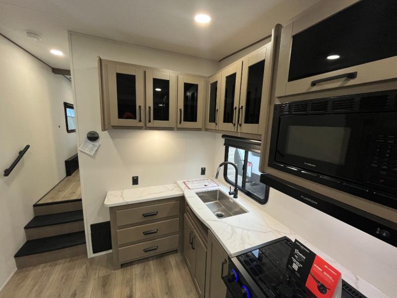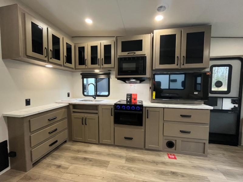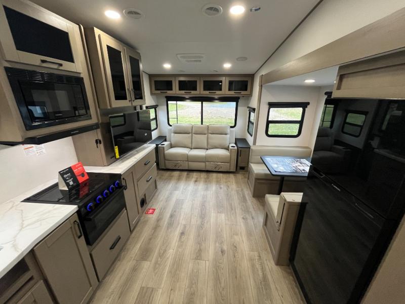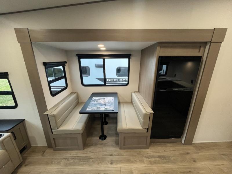 Each Reflection 100 Series fifth wheel by Grand Design is affordable and packed with luxury for unforgettable camping memories! The MorRyde CRE3000 suspension system and Goodyear Endurance tires will provide smooth towing from home to campground. And the solar package with a 180W solar panel, 60 Amp charge controller and 12V refrigerator will allow you to camp for longer periods of time and in more locations! A heated and enclosed underbelly with circulating heat is included in the Arctic 4-Seasons Protection Package, along with a double insulated roof and front cap, and thermofoil insulation under the holding tanks so you can camp all year long if you choose. You will appreciate having an on-demand water heater for hot showers after exploring, and the universal all-in-one docking station will let you monitor your RVs tanks levels and functions with ease. These models also include many luxurious interior features, such as premium Congoleum flooring, pleated shades, residential cabinetry, and matte black fixtures and hardware. Don't let the Reflection 100 Series fifth wheels pass you by!