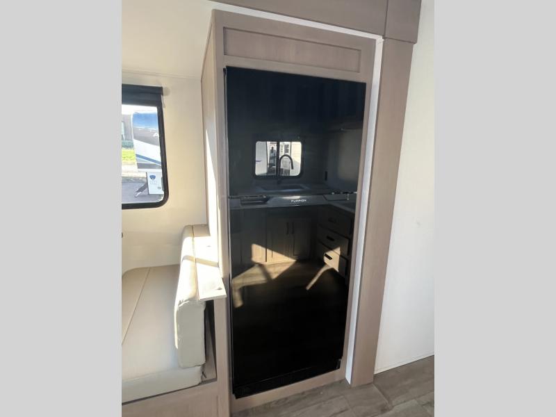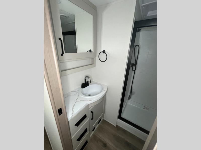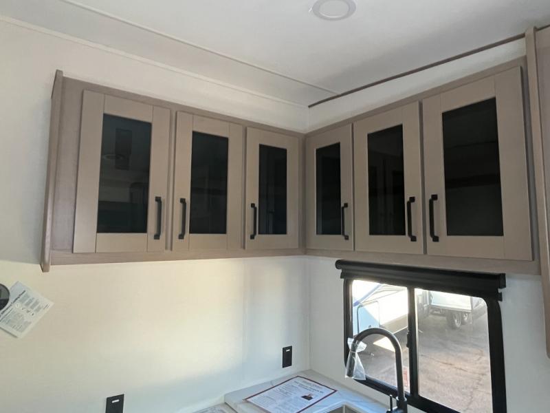 This is the perfect couple's trailer with a space for an overnight guest or two little ones on the booth dinette. You can switch out this dinette for an optional swivel dinette as well, and the standard theater seating can be replaced by an optional trundle bed if you need more sleeping space. A 40" HDTV will keep you entertained when the weather isn't cooperating, and you can whip up your best meals in the full kitchen. And a 19' power awning will provide shade if you choose to take your plate outdoors! The spacious full bath will let you clean up each day, and you'll feel right at home in the front private bedroom with a queen bed!